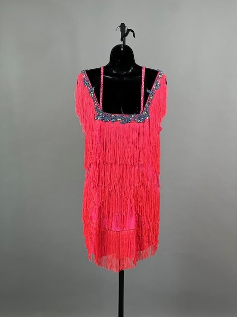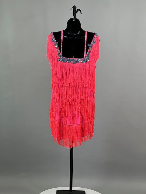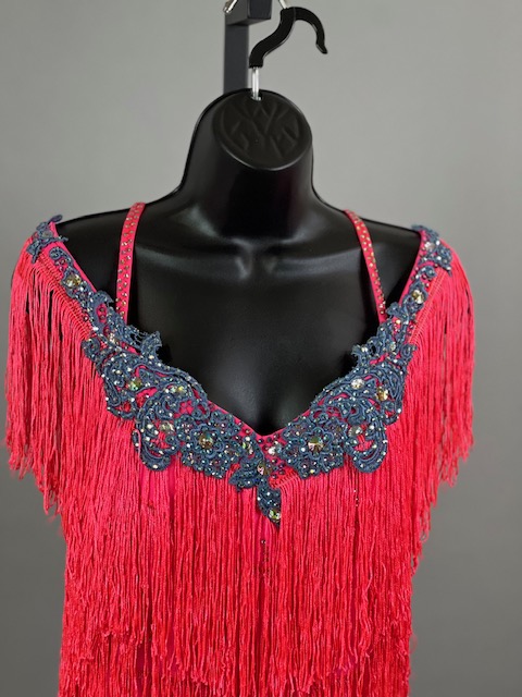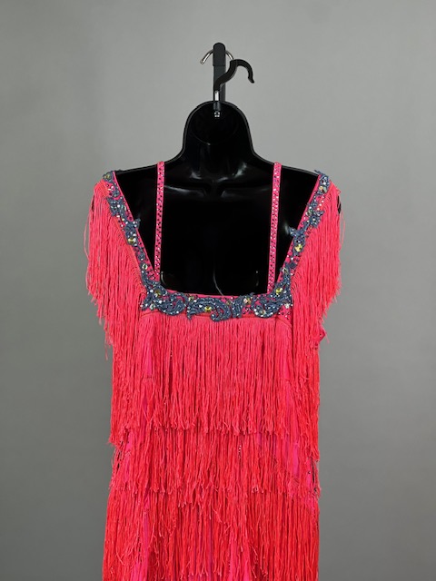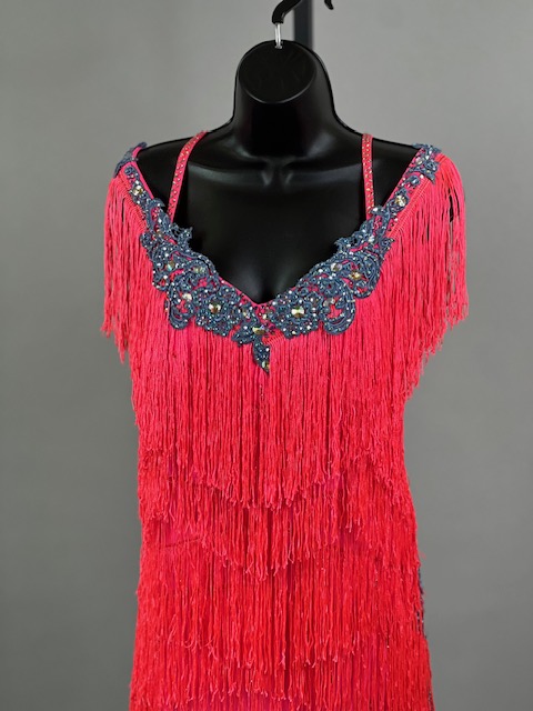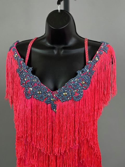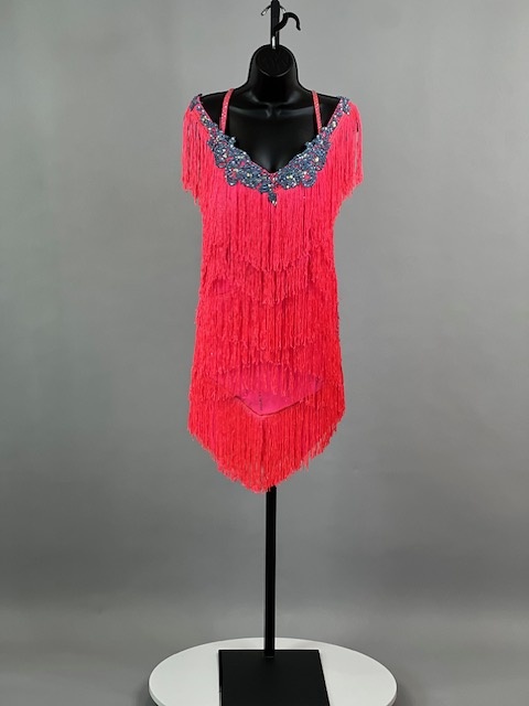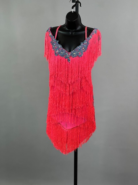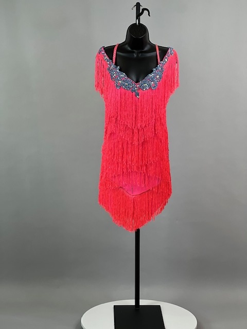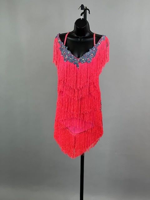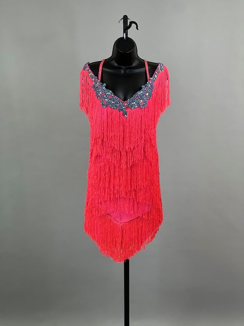This is a beautiful salmon pink Rhythm/Latin dress! It’s a unique style and moves amazing on the dance floor. Pre-owned. Trimmed with Preciosa and Korean stones.