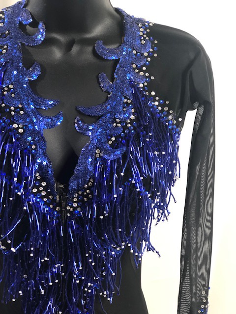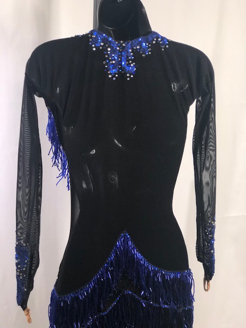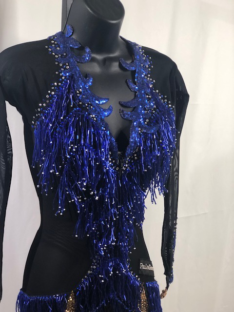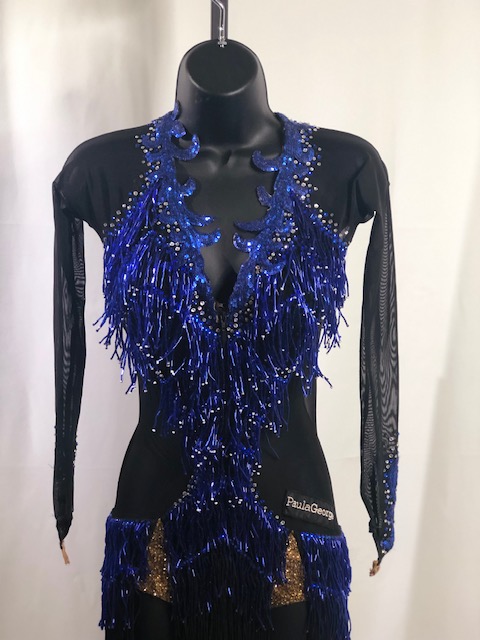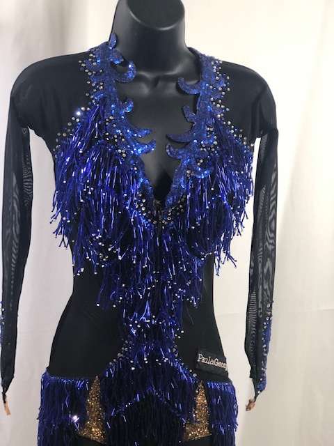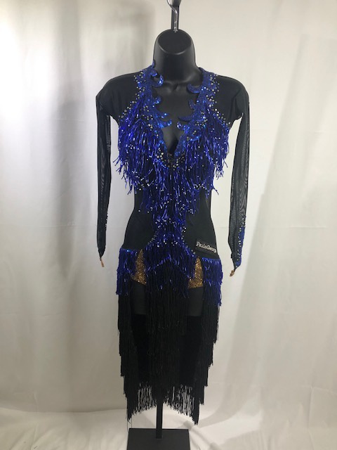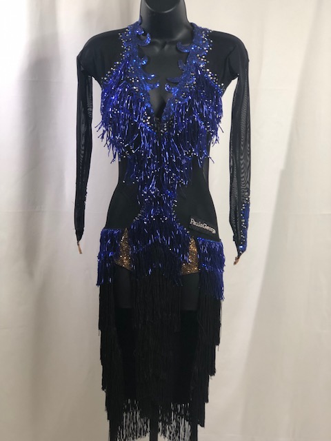 This is a beautiful Latin/Rhythm dress designed by Paula George. This blue azure and black dress moves amazing on the dance floor. Size SMALL/MEDIUM, can fit a size 0-4 USA, 5’1″ – 5’5″ tall. Dress was pre-owned.