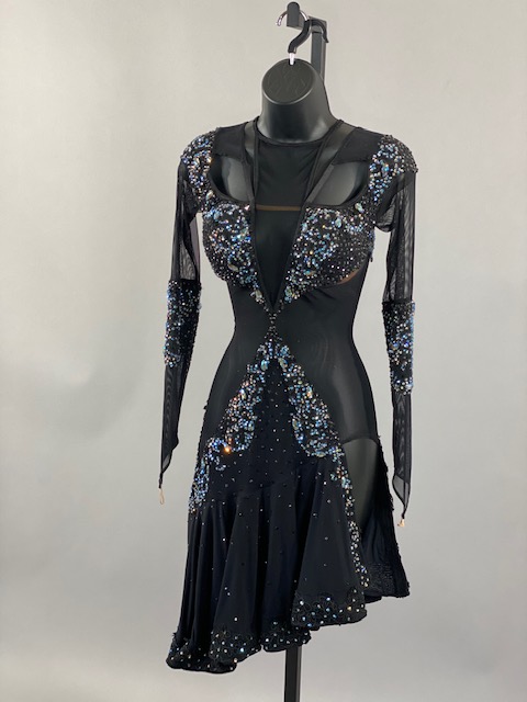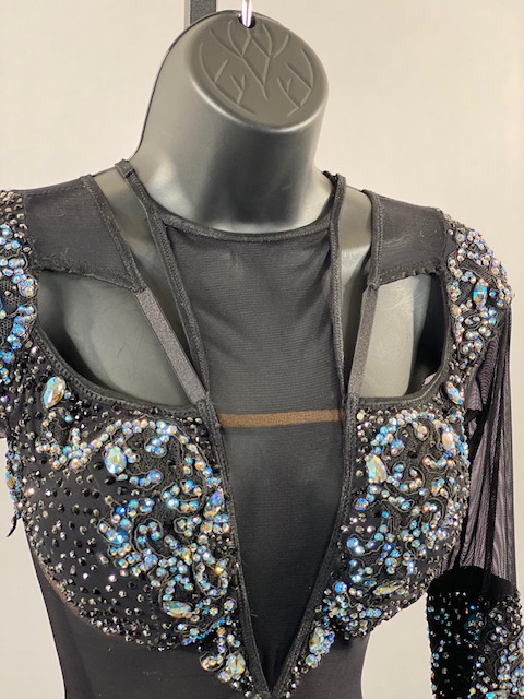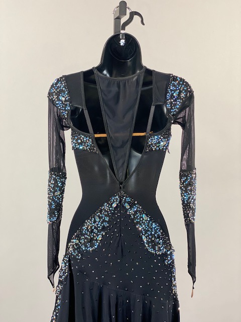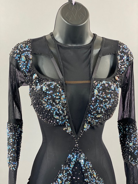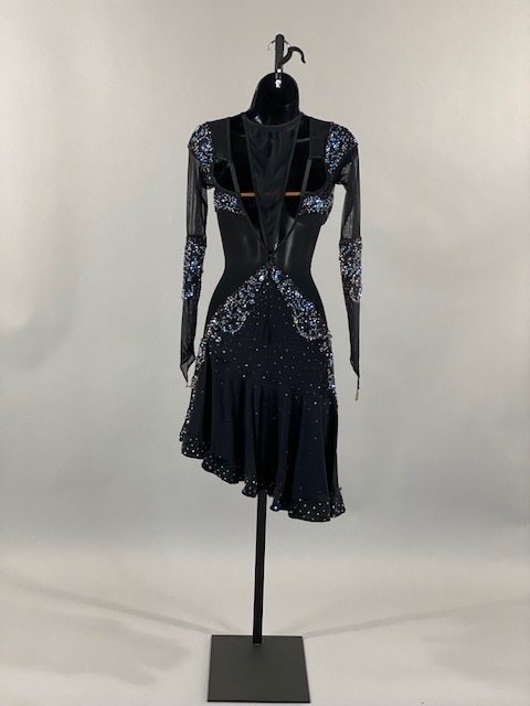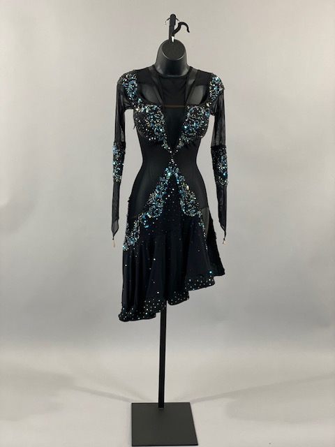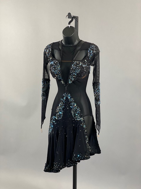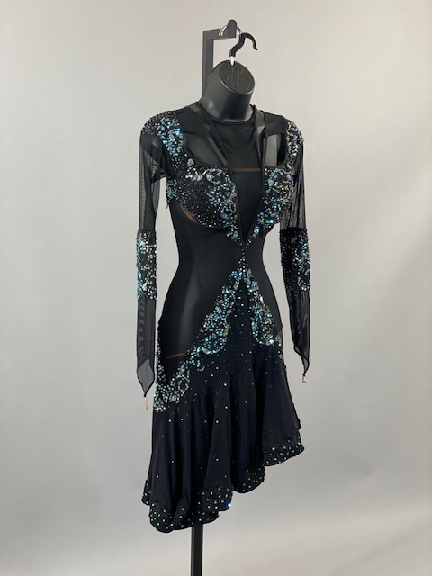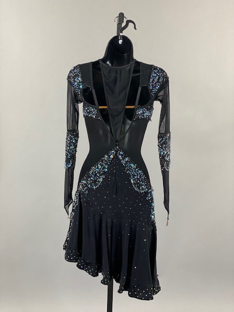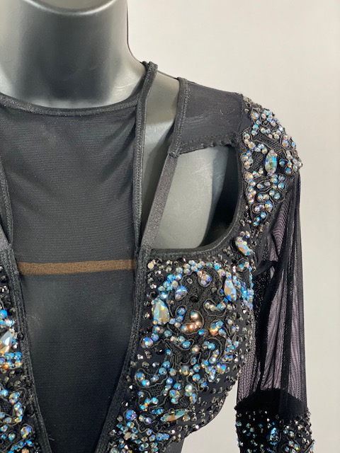 This is an amazing black rhythm/latin dress with blue and light blue Austrian Crystals. Skirt creates a great effect on the dance floor. Dress designed by DORE Designs.