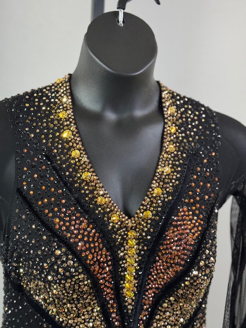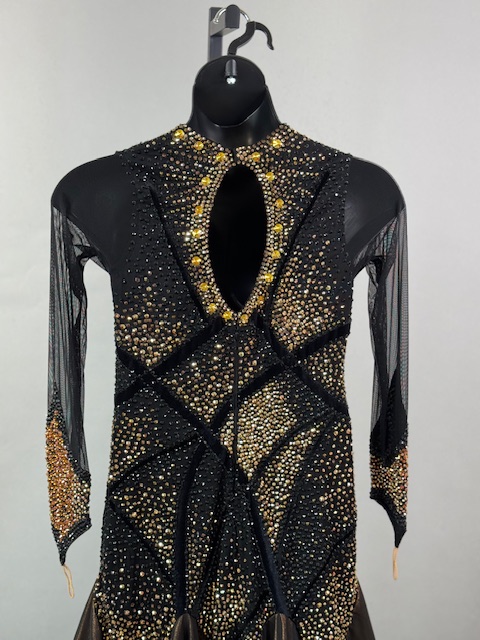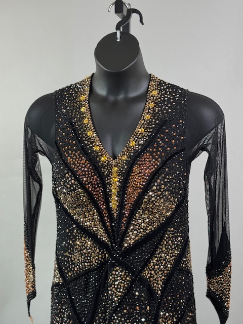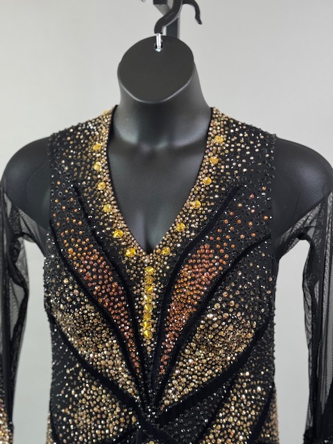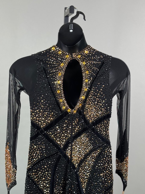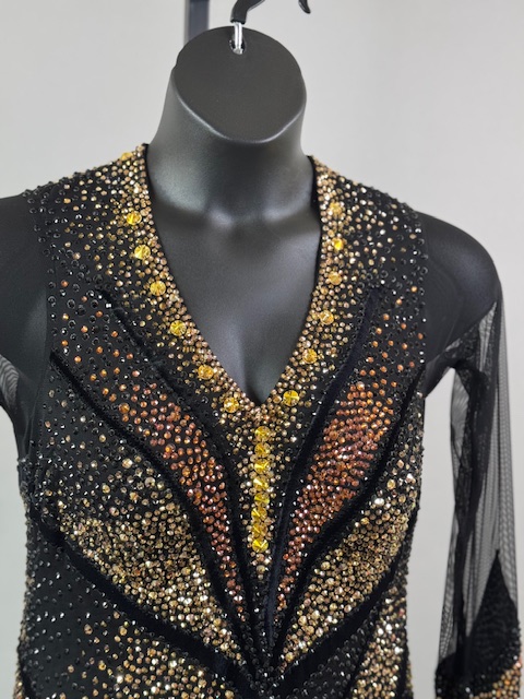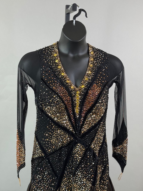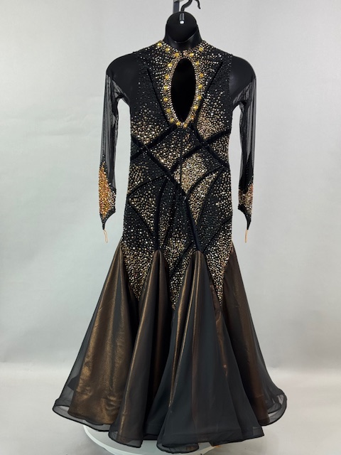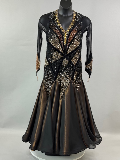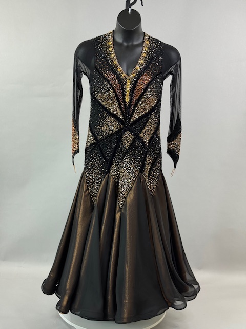 This is a stunning black and gold/copper smooth dress designed by DL Designs! Unique style, true beauty! Trimmed with Austrian crystals.