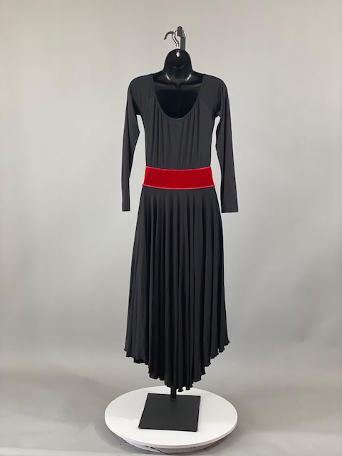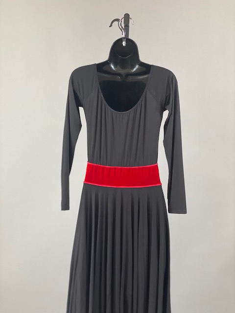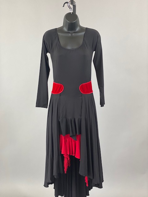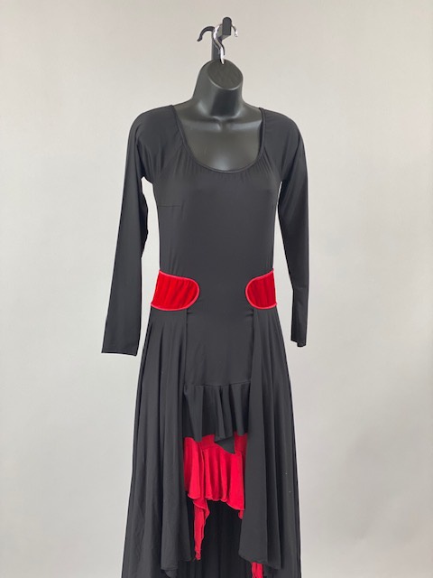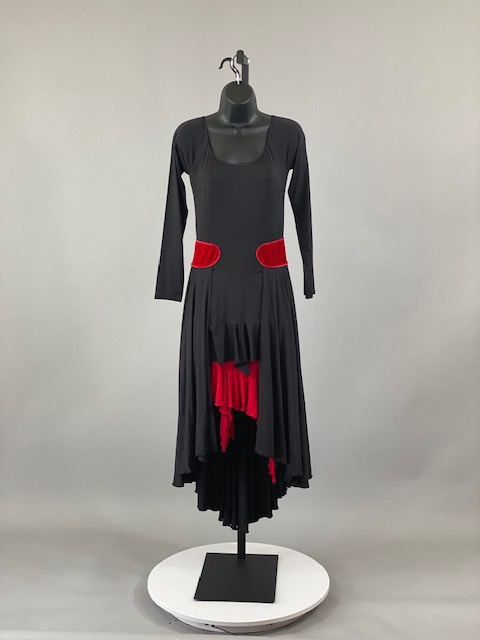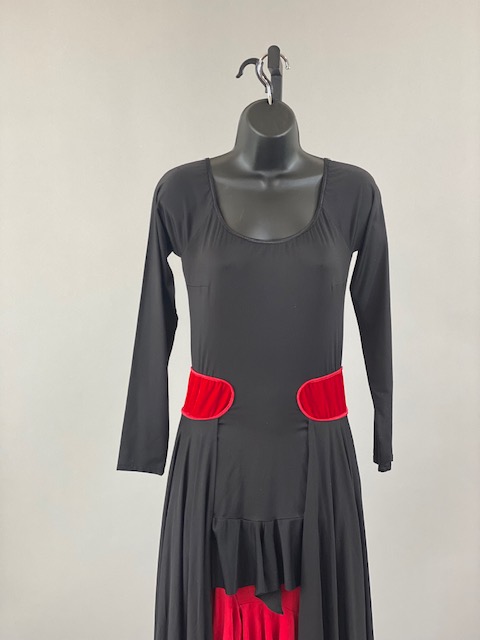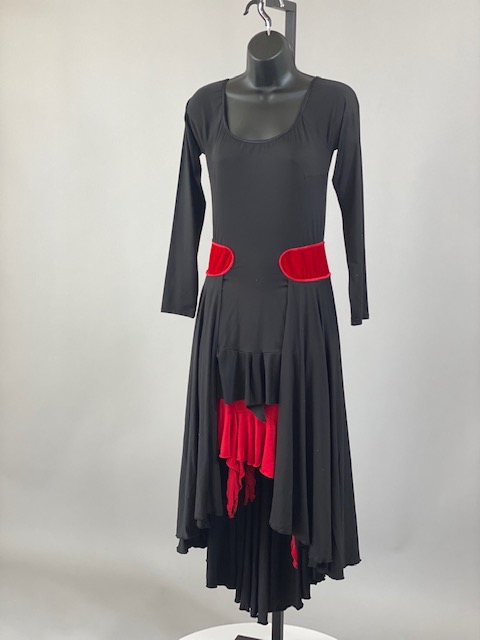 This is a beautiful black and red practice dress! It’s great for showcase or paso doble solo. It moves amazing on the dance floor!
