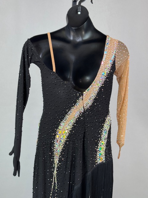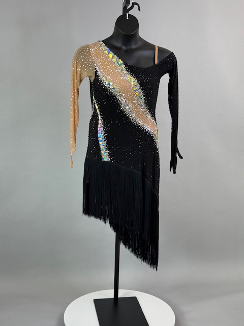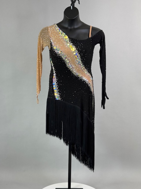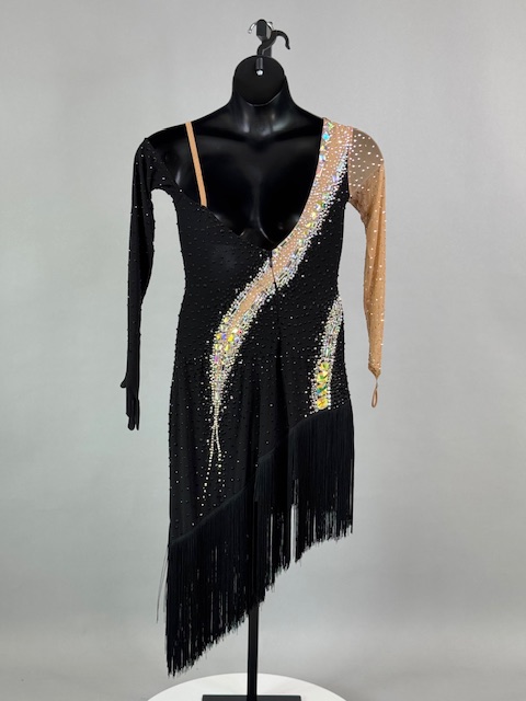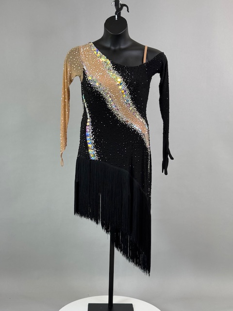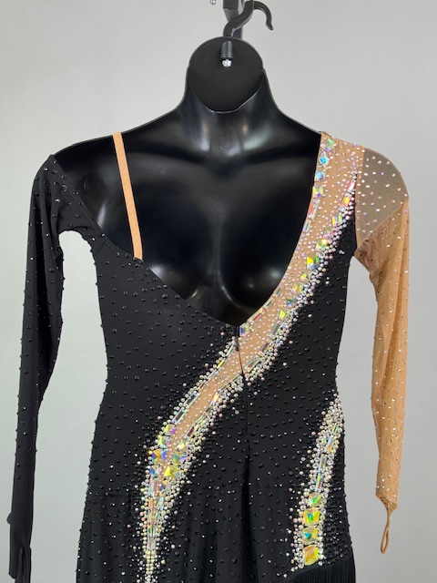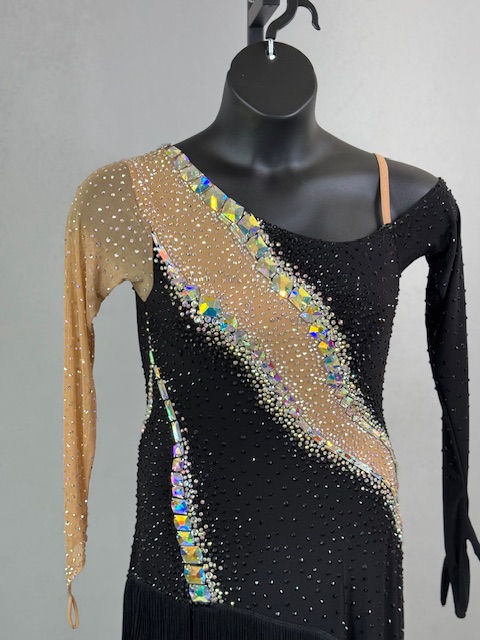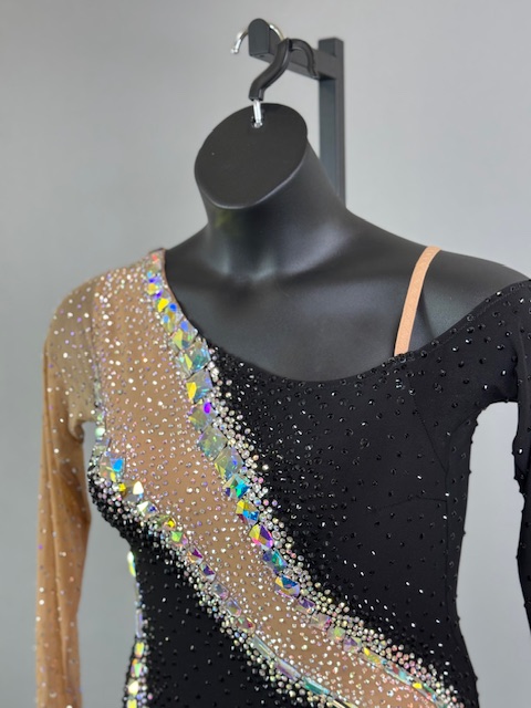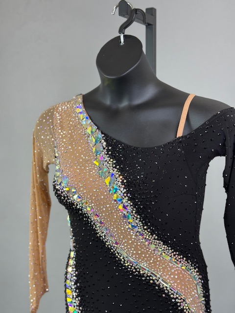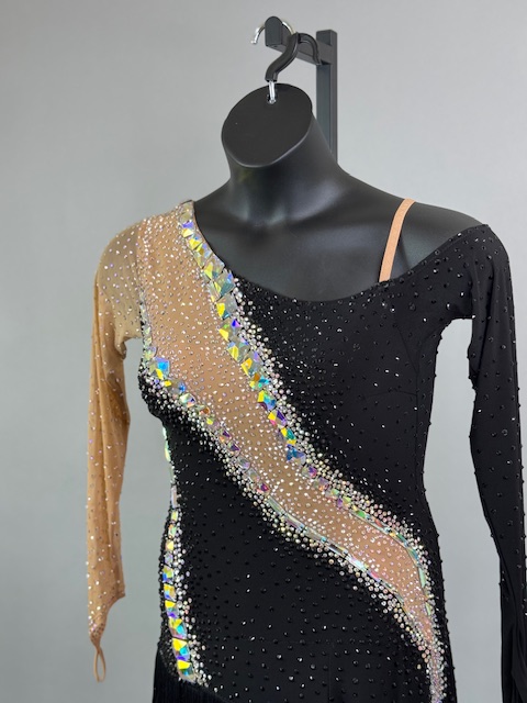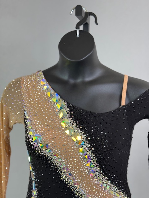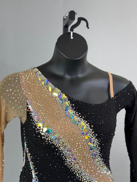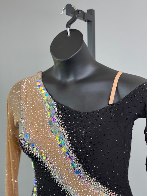 This is a stunning black and tan Rhythm/Latin dress! It’s a unique style, looks amazing on the dance floor. Stoned with Austrian Crystals.