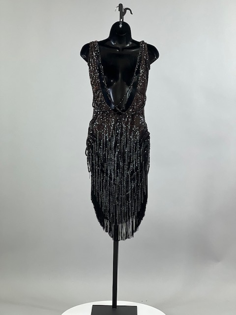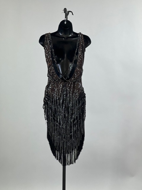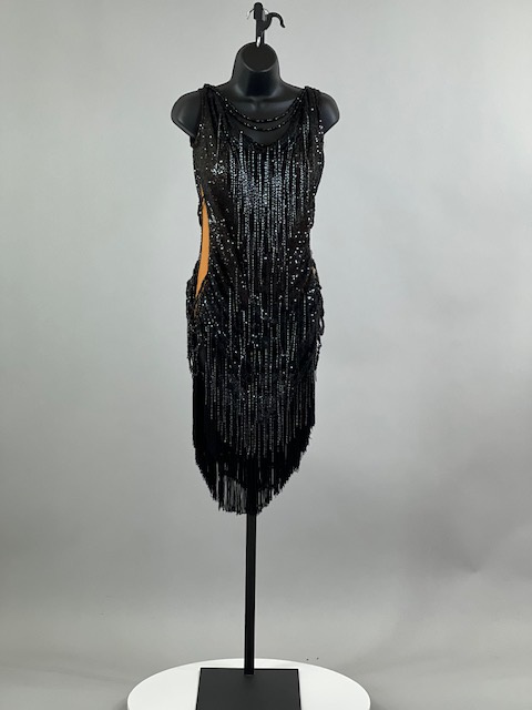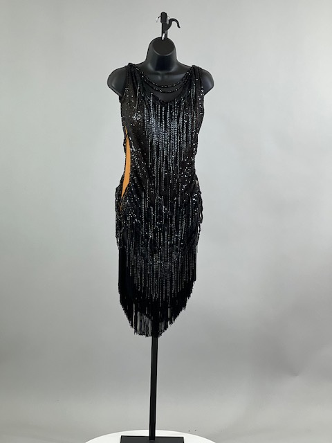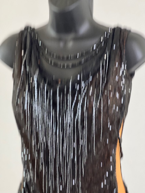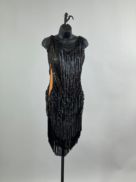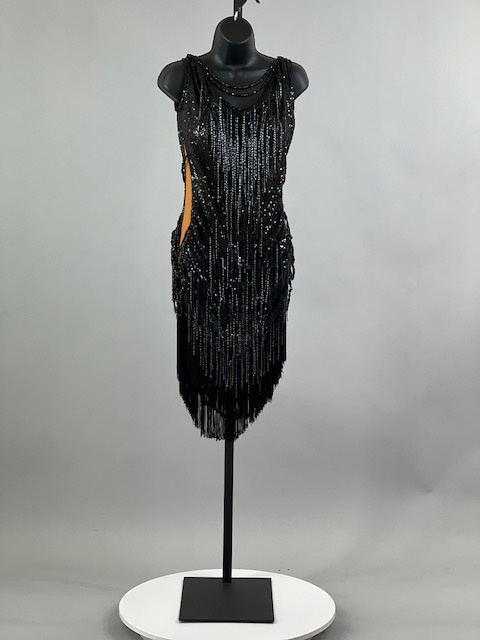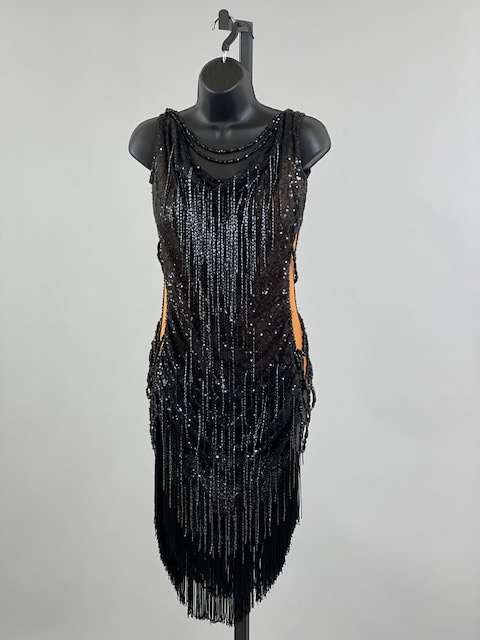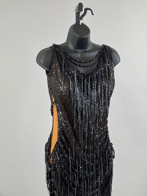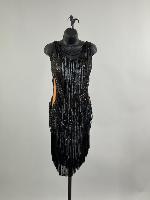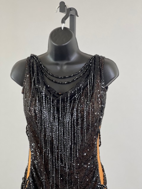 This is a beautiful black sequin Rhythm/Latin Dress. It’s a very unique style style. Trimmed with Austrian Crystals.