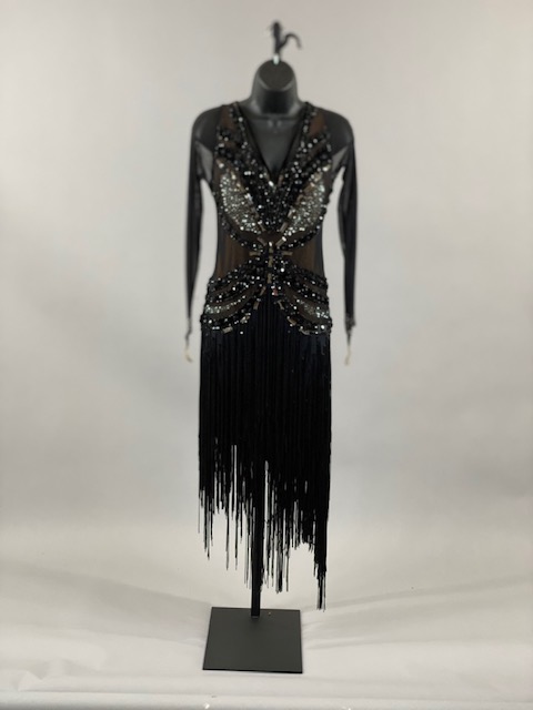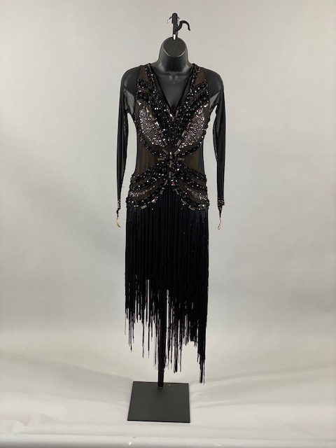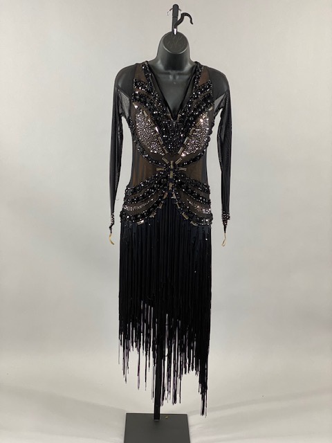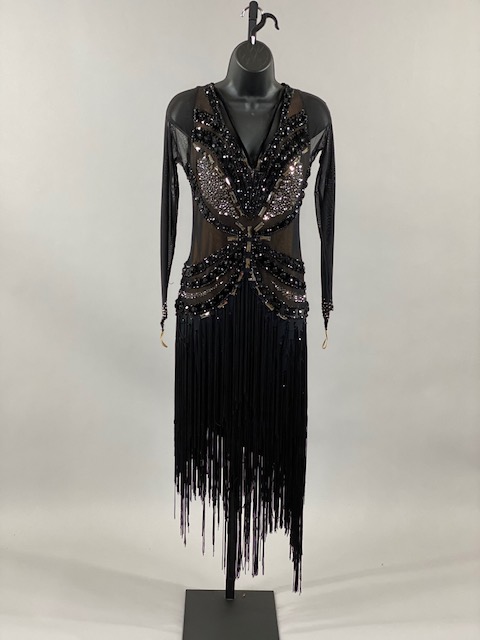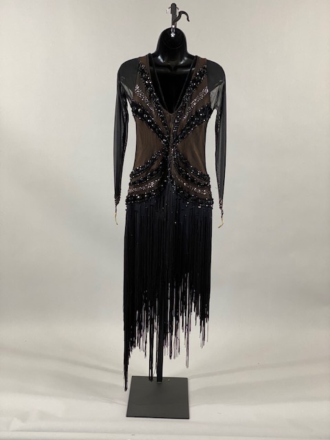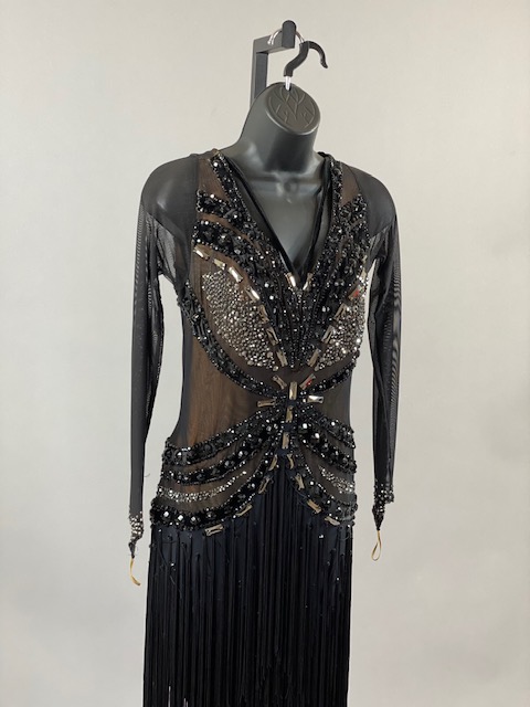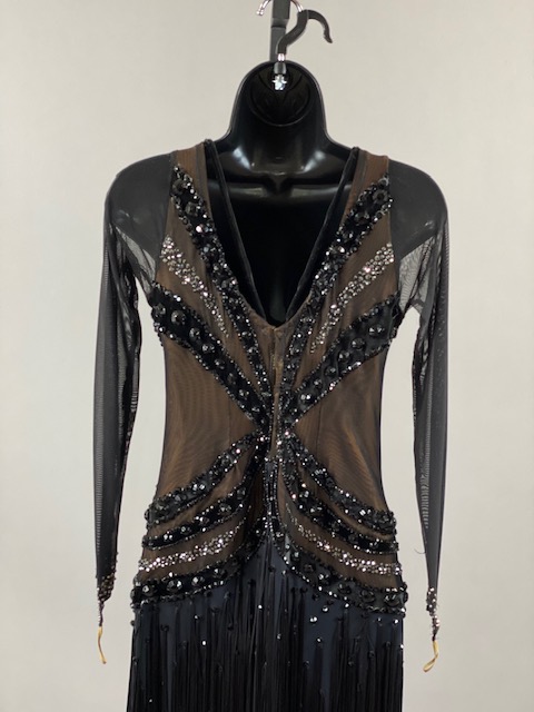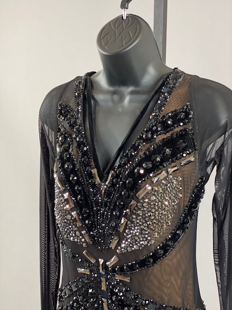This black and nude rhythm/latin dress is very unique, skirt creates a great effect on the dance floor. Dress designed by Artistry in Motion by Julia Gorchakova. This dress is stoned with Austrian Crystals.