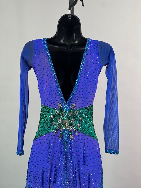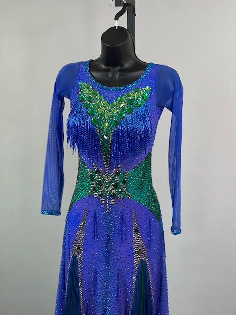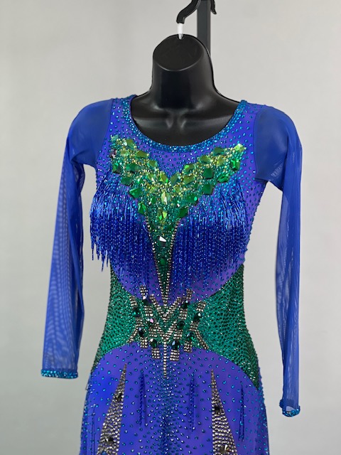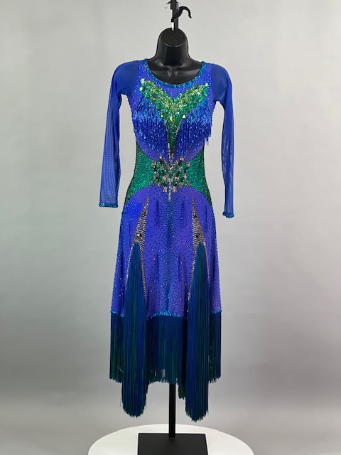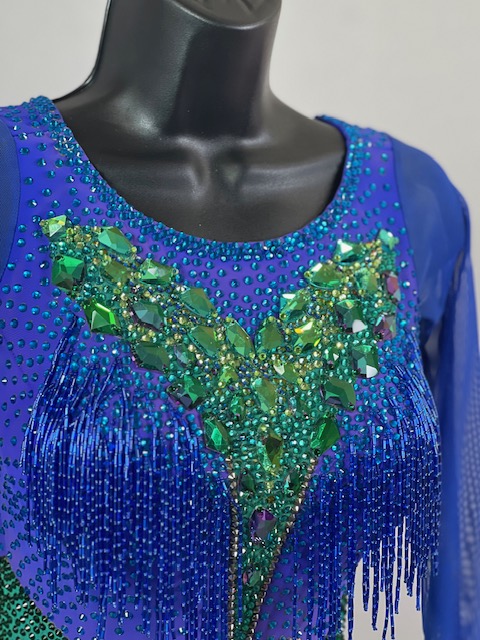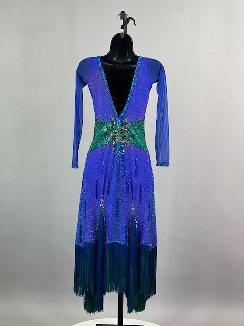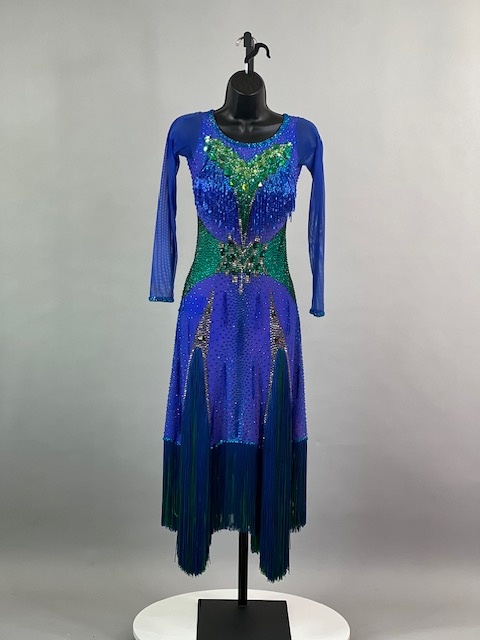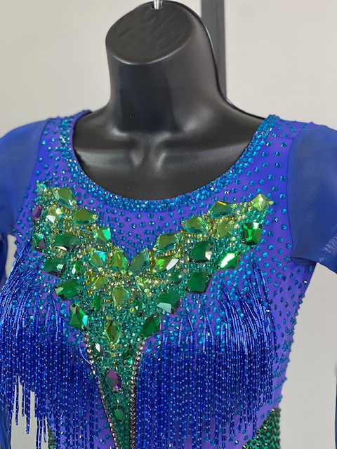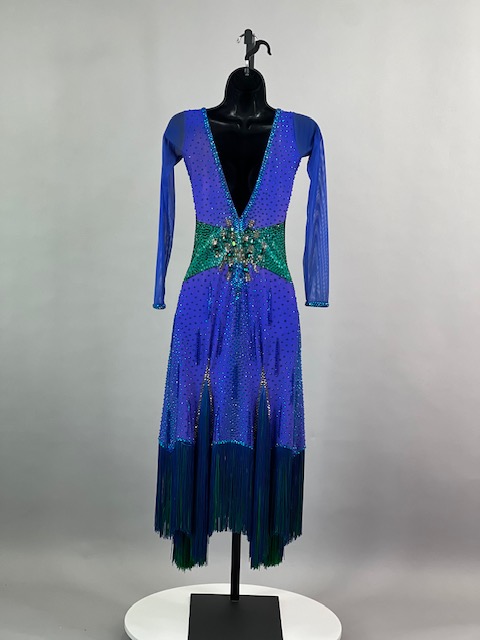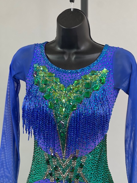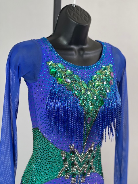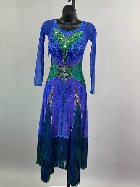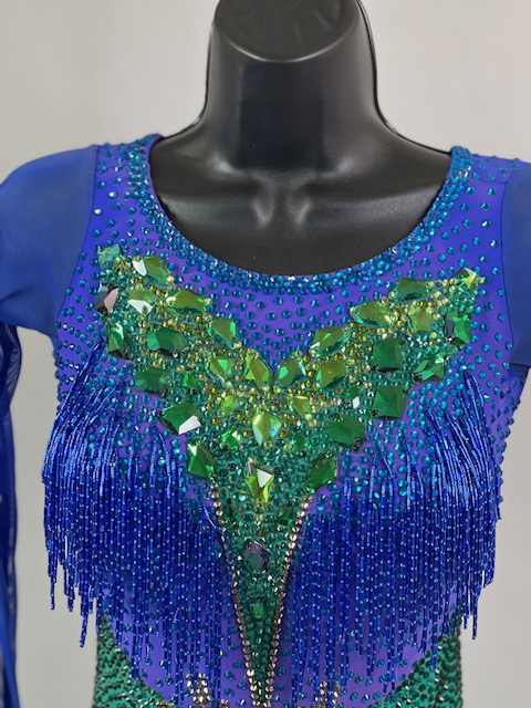 This is a stunning bright blue and green Rhythm/Latin dress designed by ARTI! It’s an art piece, fringes moves amazing on the dance floor. Trimmed with Austrian Crystals.