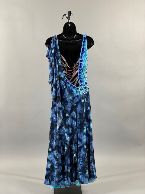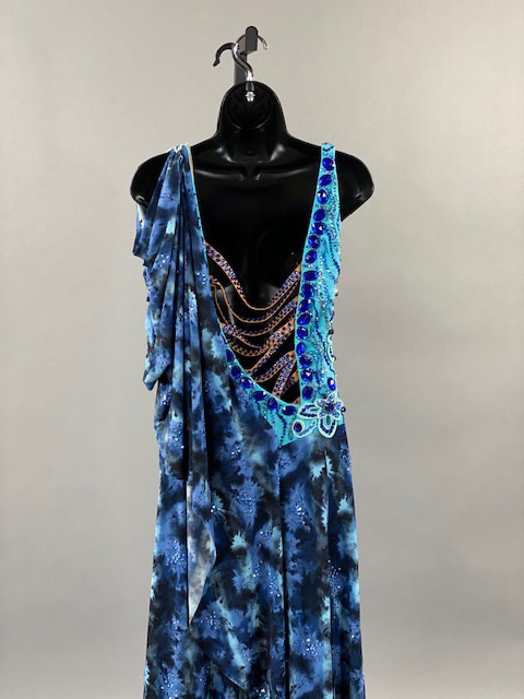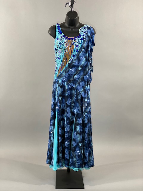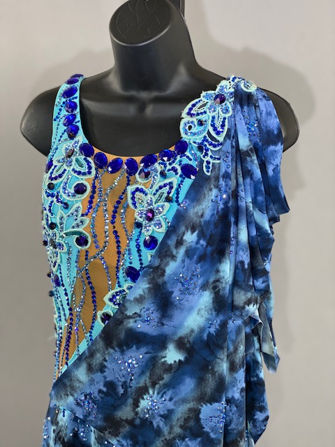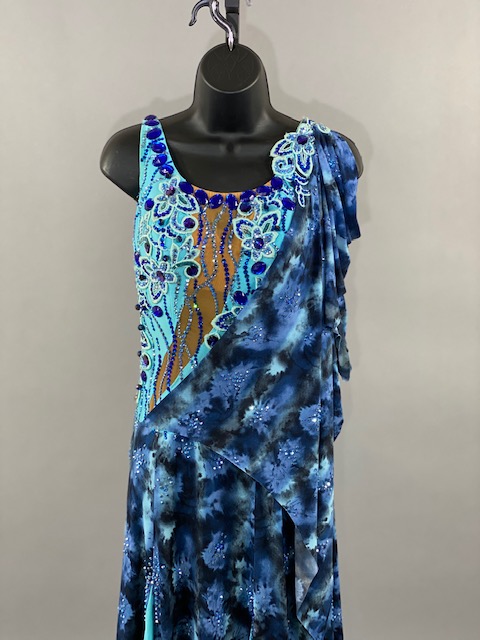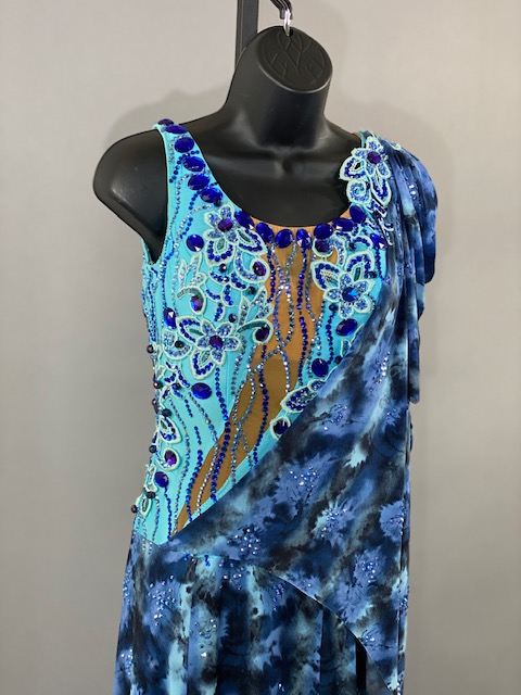 Beautiful blue with floral accents in dark blue trimmed with Austrian Crystals. Skirts creates an amazing effect on the dance floor. Simple stunning! Dress designed by Artistry in Motion by Julia Gorchakova.