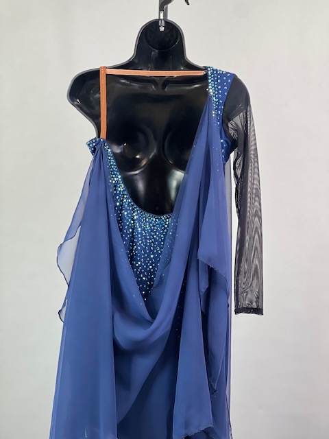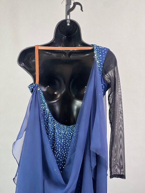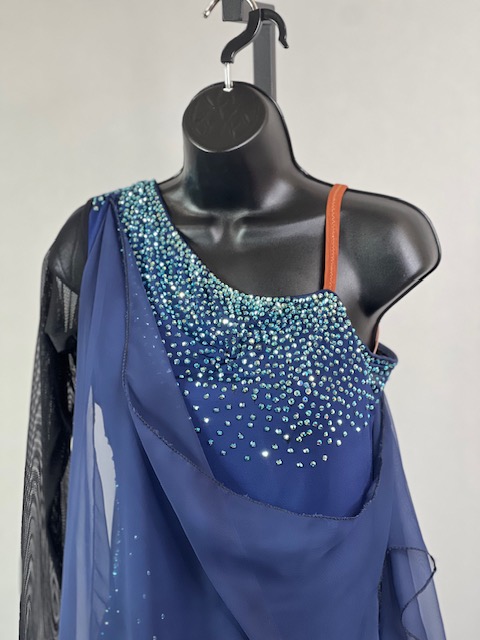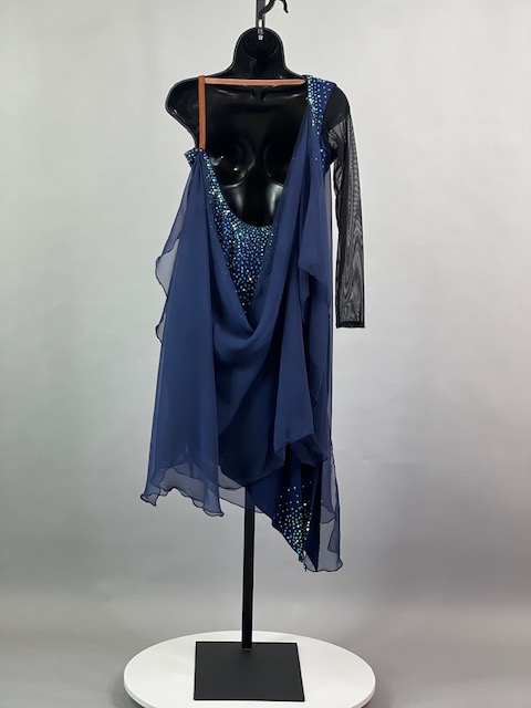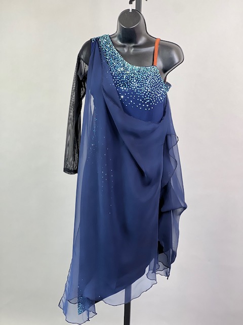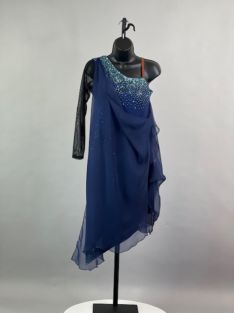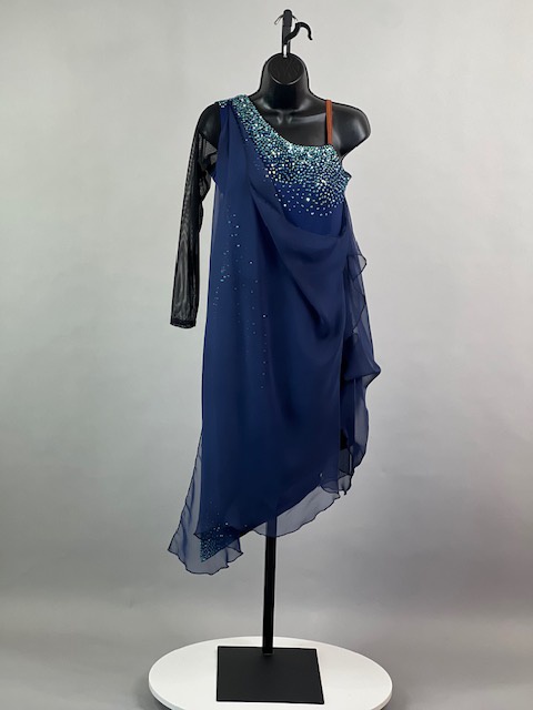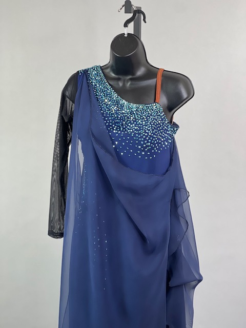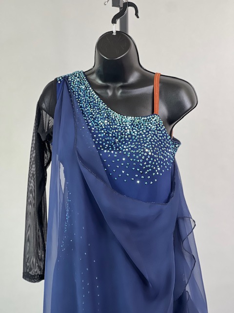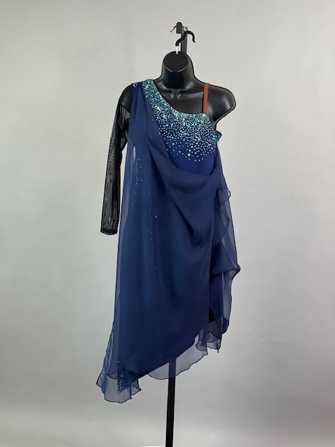 This is a beautiful navy blue Rhythm/Latin dress designed by Petrosyan! It moves amazing on the dance floor! Trimmed with Preciosa crystals.