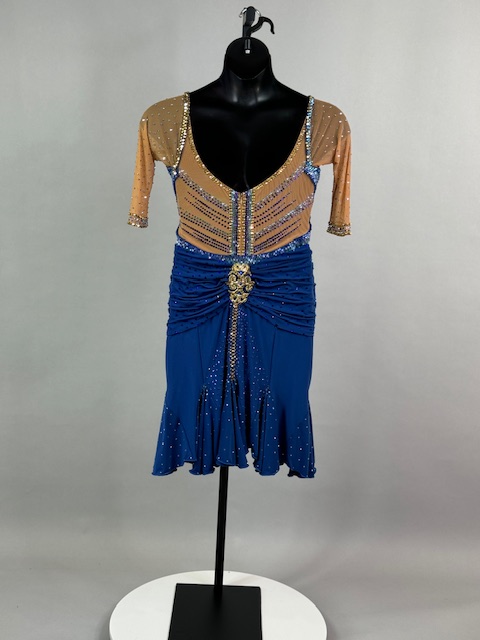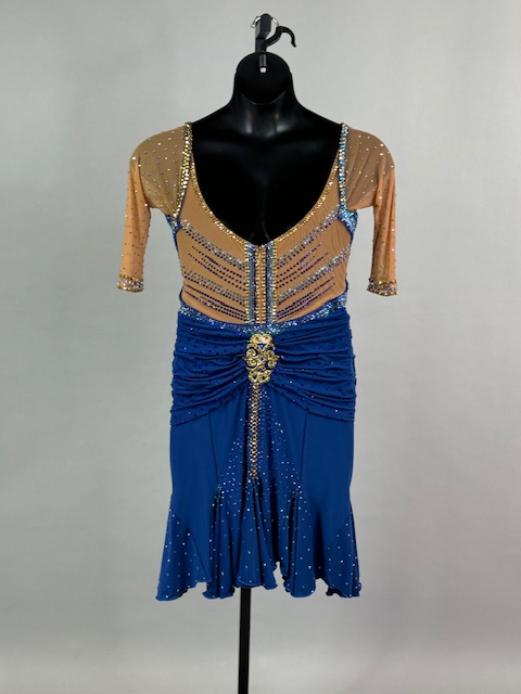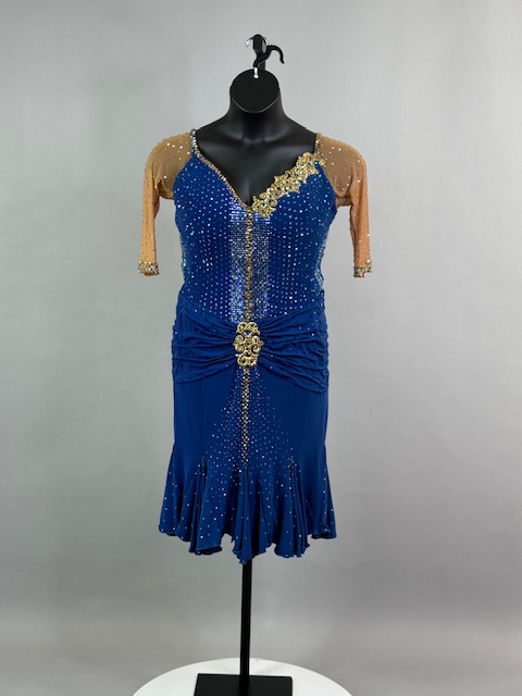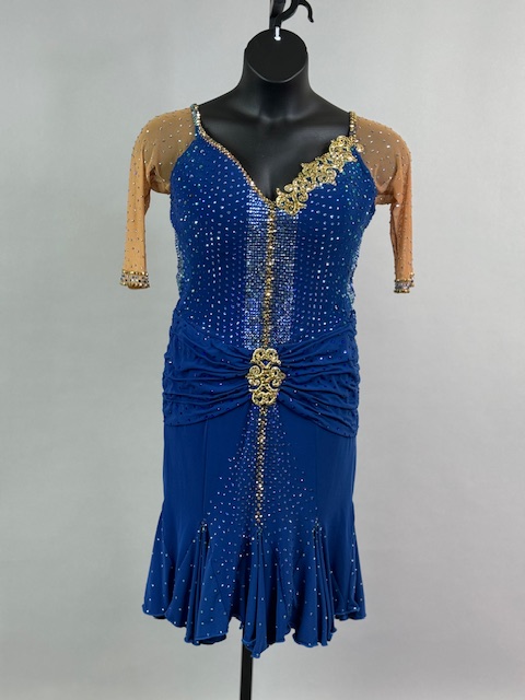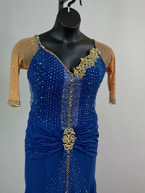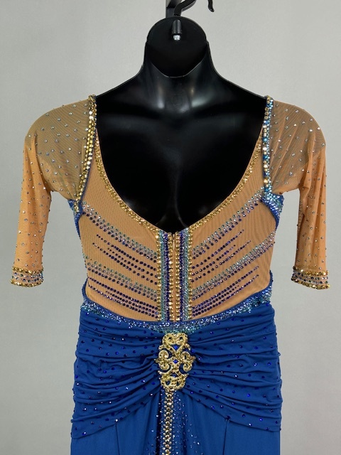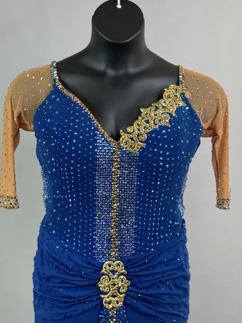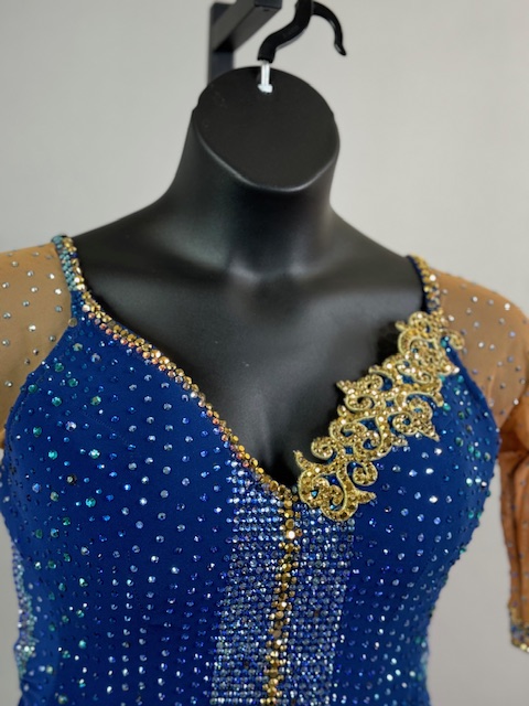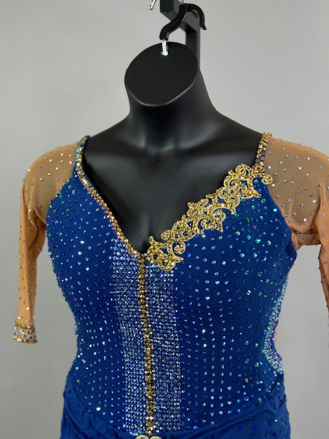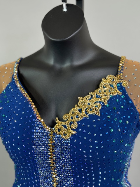 This is a beautiful blue and gold Rhythm/Latin dress designed by Artistry in Motion! It’s a bright style, an eye catcher on the dance floor. Trimmed with Austrian Crystals.