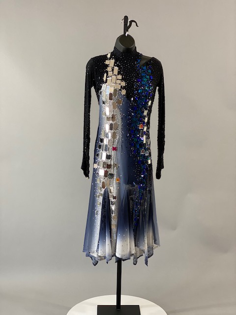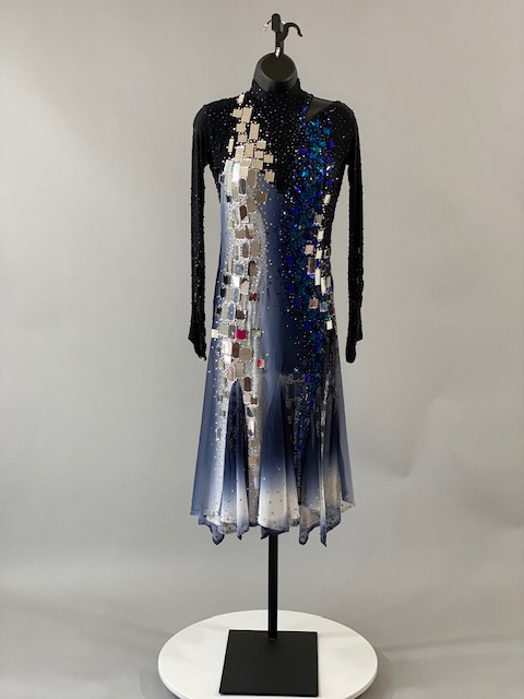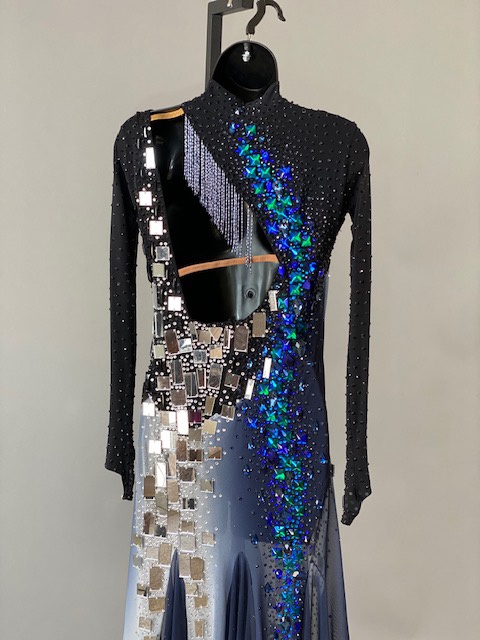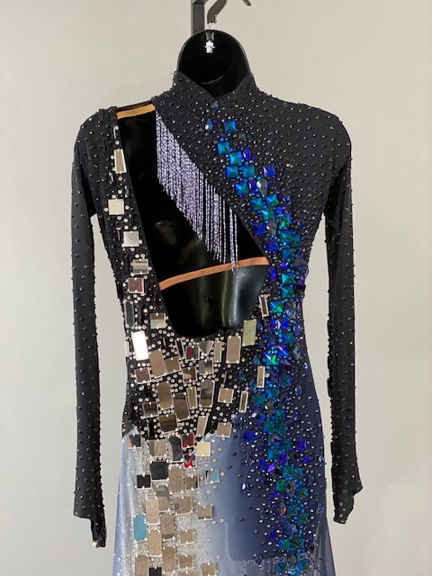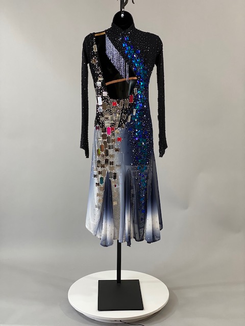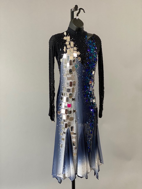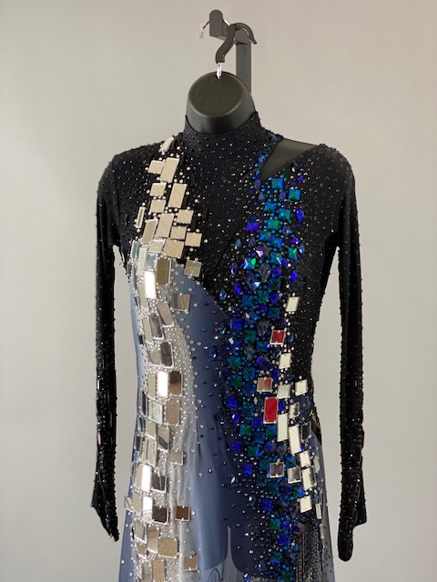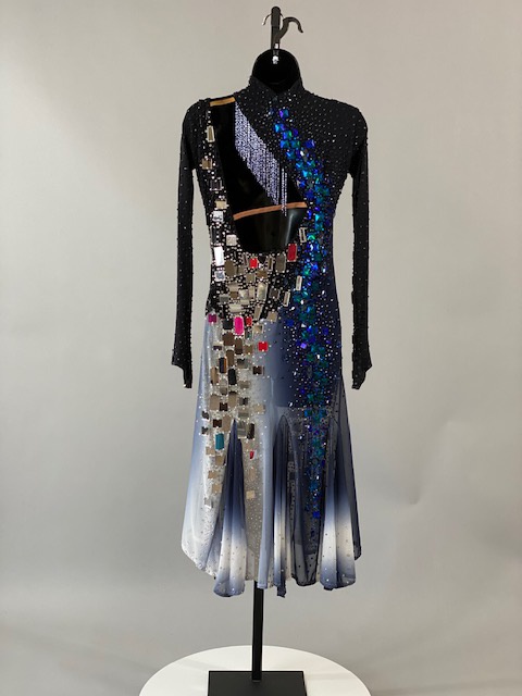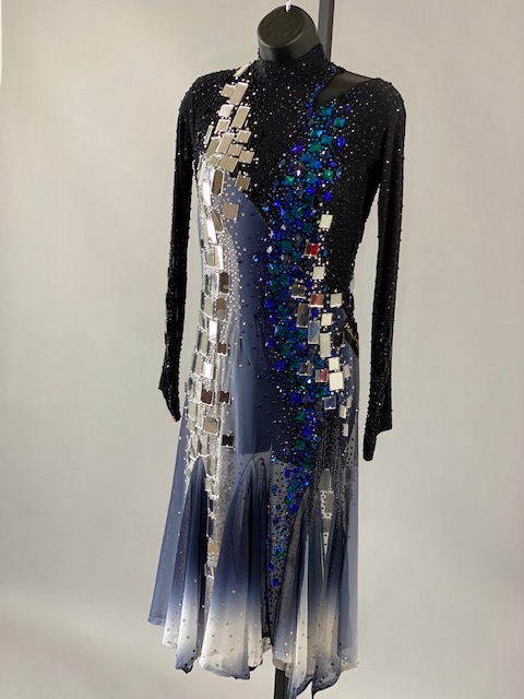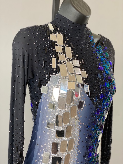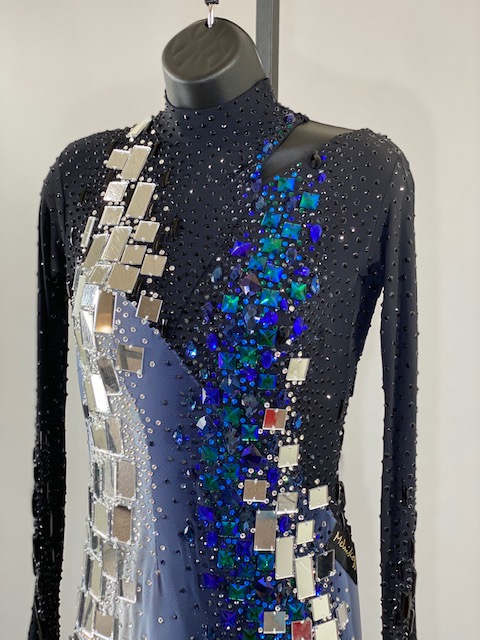 This is a stunning black/blue Rhythm/Latin Dress, very unique style. It moves amazing on the dance floor, will definitively stand out. Trimmed with beautiful Austrian crystals. Designed by Melnikoff’s.