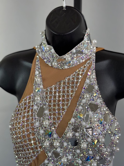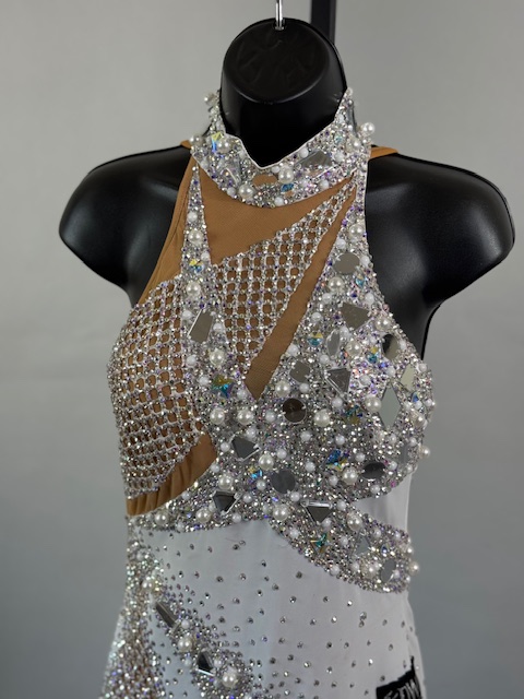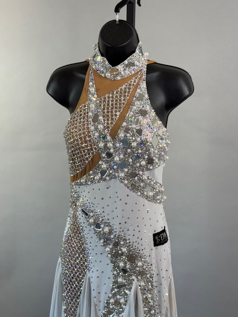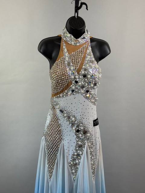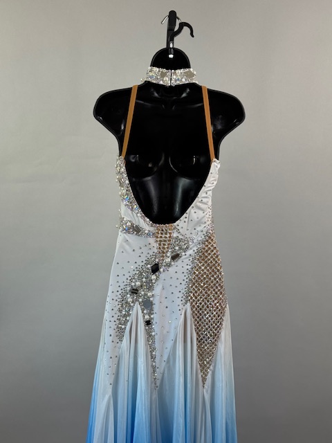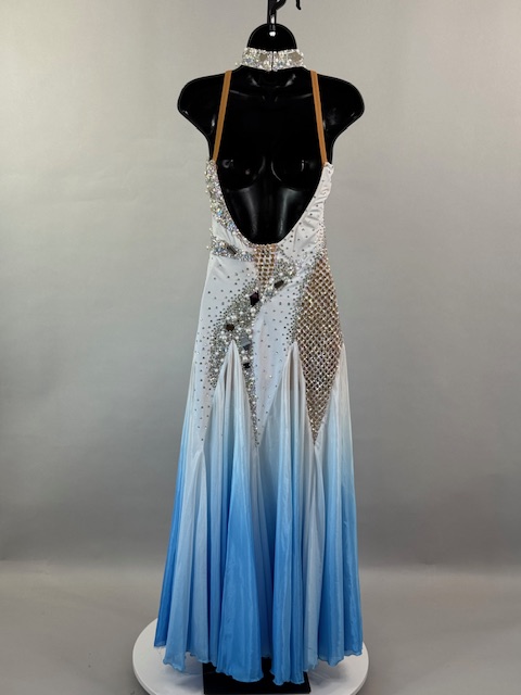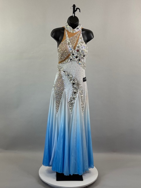 This is a beautiful white and blue ombre smooth dress designed by DWW! It moves amazing on the dance floor. Trimmed with Austrian and Preciosa Crystals.
