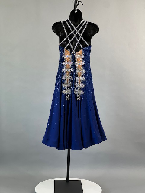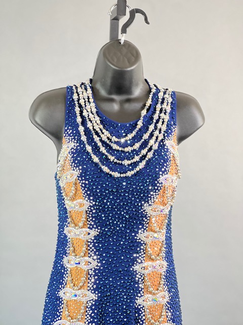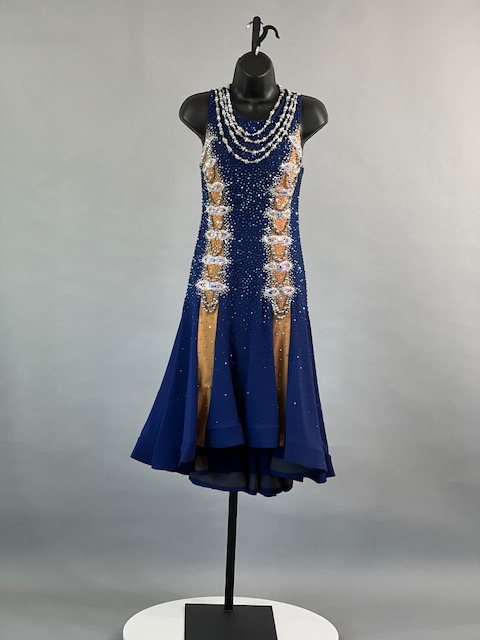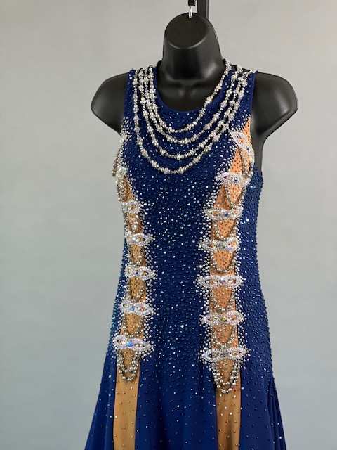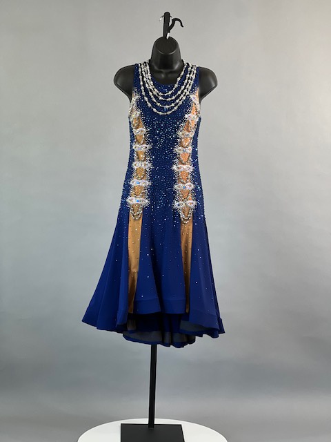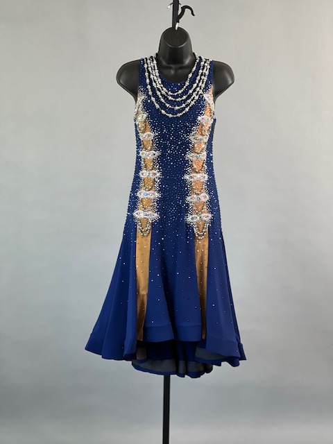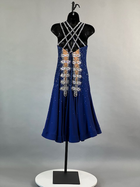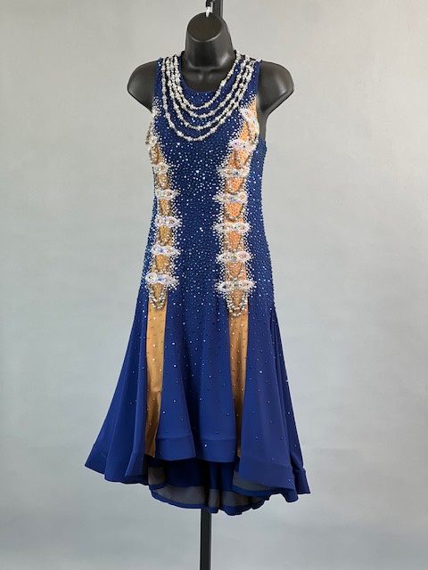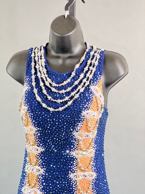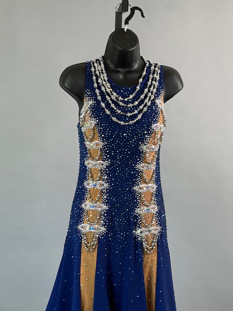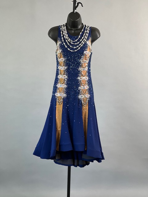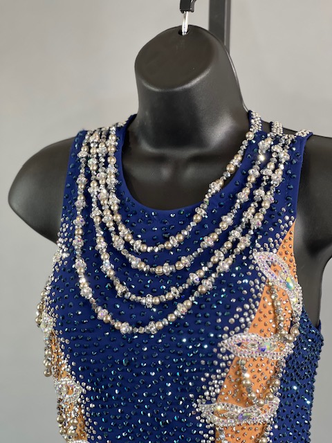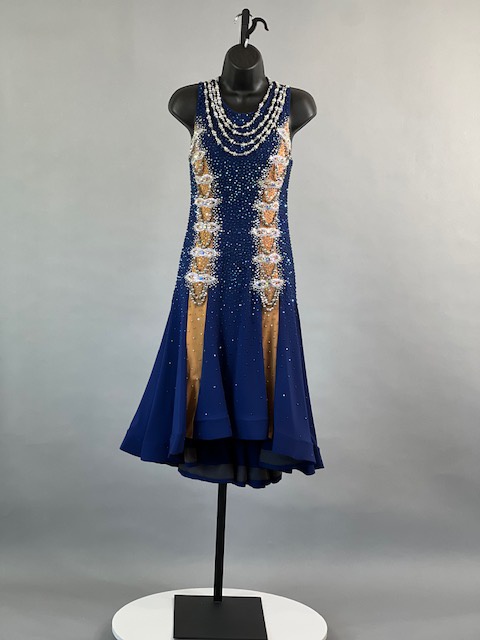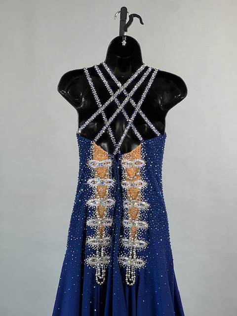 This is a beautiful navy blue Rhythm/Latin Dress designed by Artistry in Motion by Julia Gorchakova! Unique style, skirt moves amazing on the dance floor. Trimmed with Austrian Crystals.