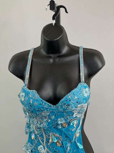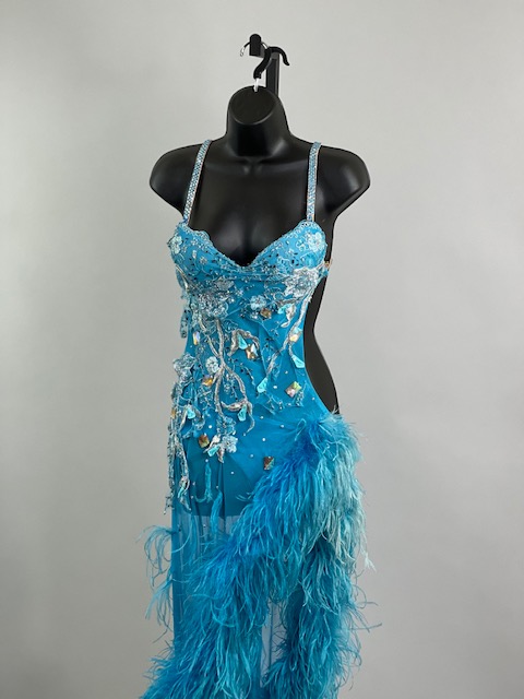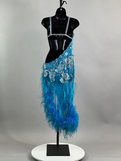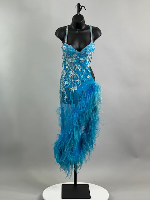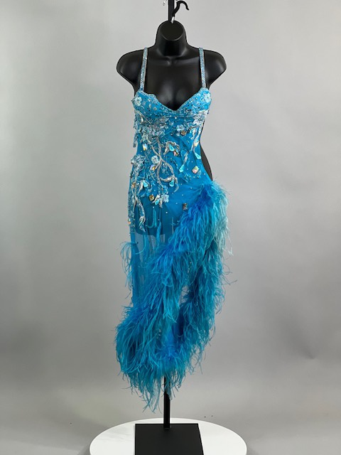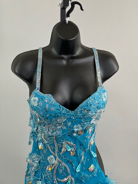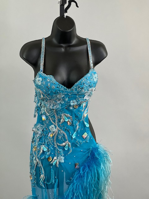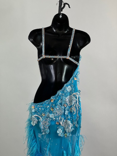 This is a beautiful turquoise blue Rhythm/Latin dress with Ostrich Feathers! Very unique style! It moves amazing on the dance floor!