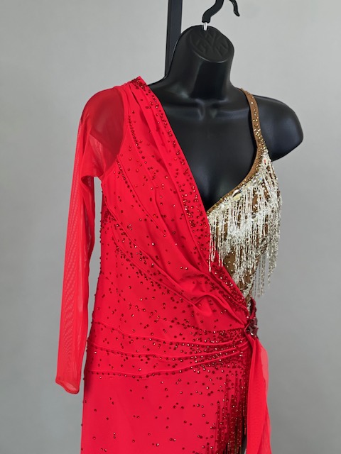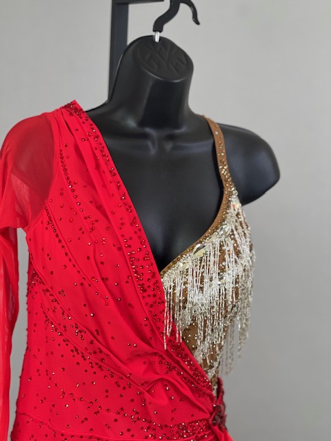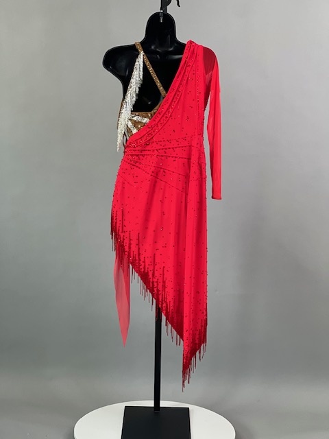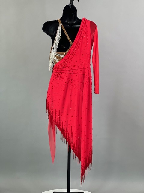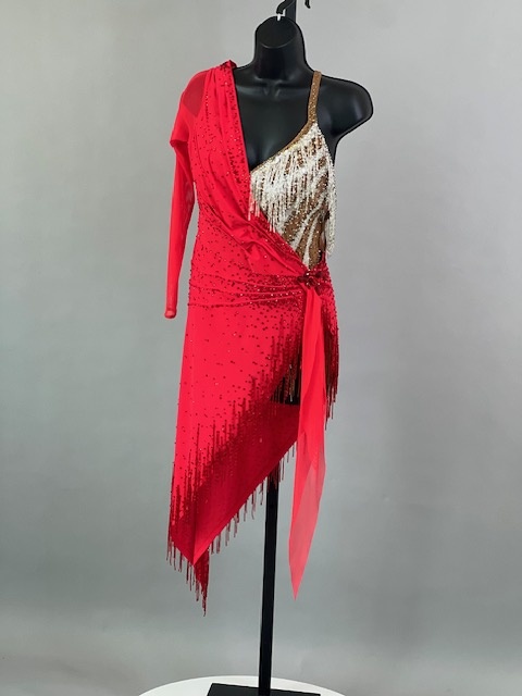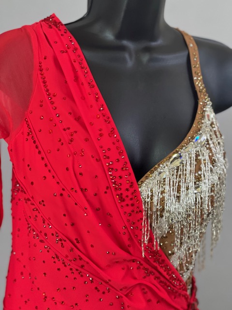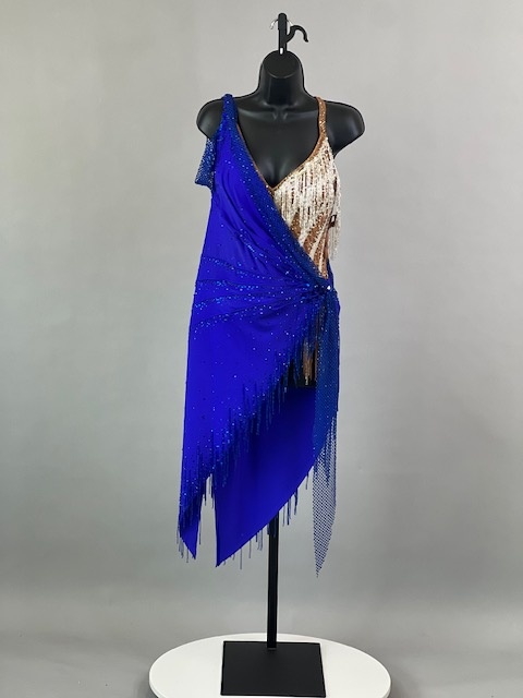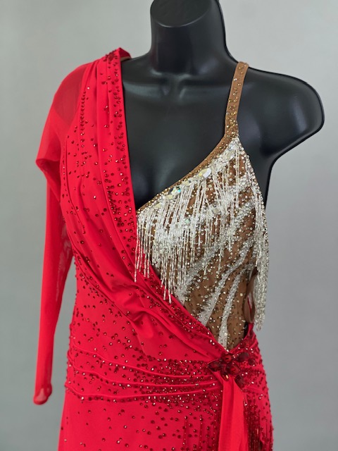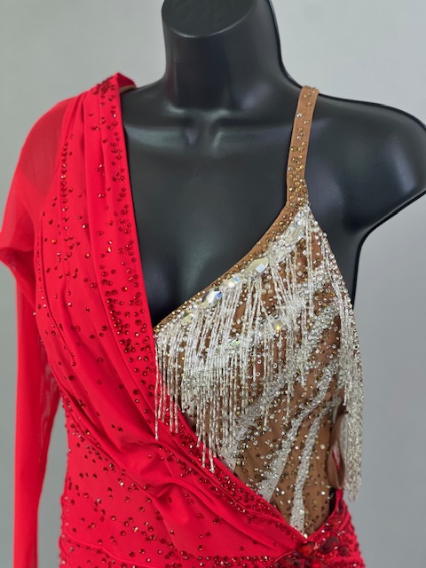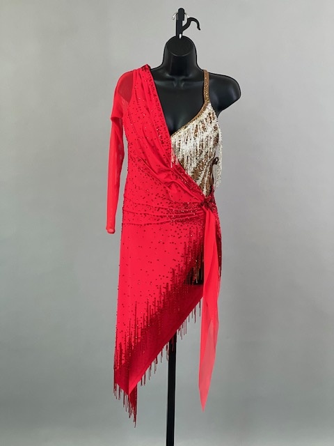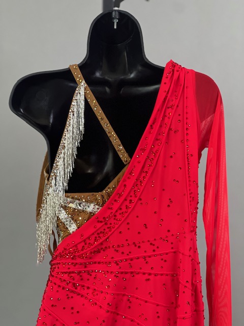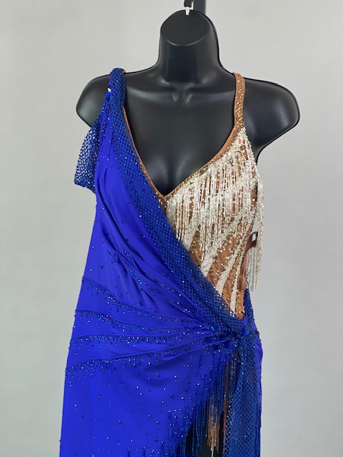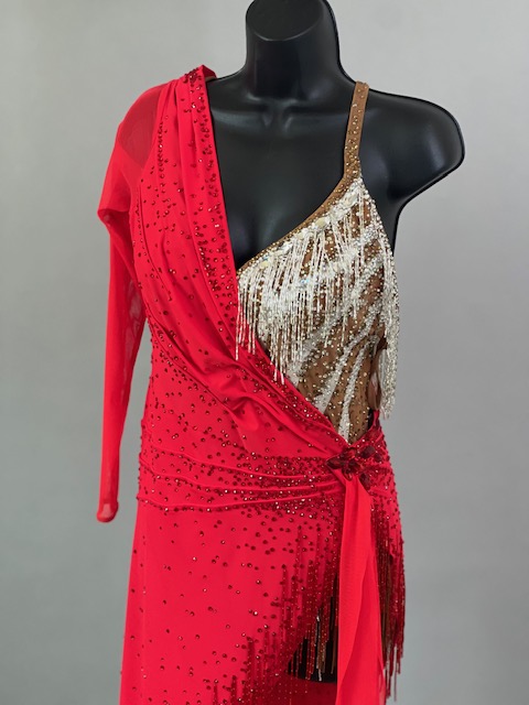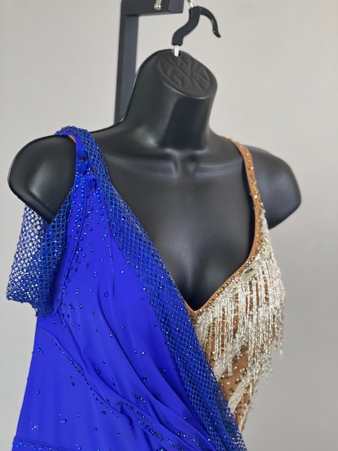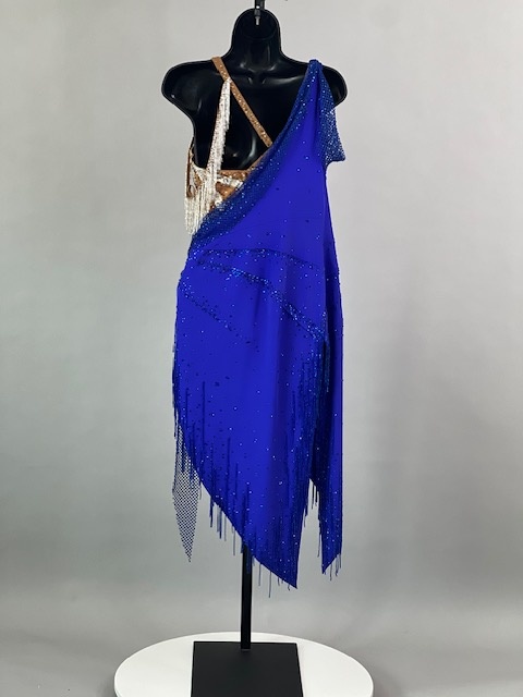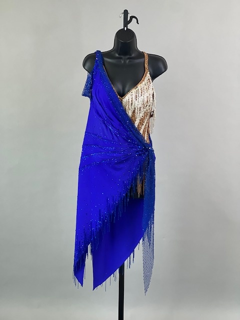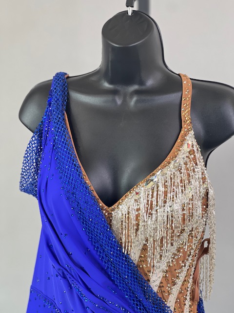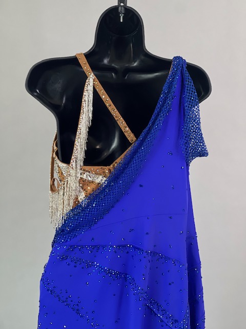 This is a stunning three piece Rhythm/Latin dress that could be change into a red or a blue style. It’s a unique design, it moves amazing on the dance floor. Trimmed with Austrian Crystals.