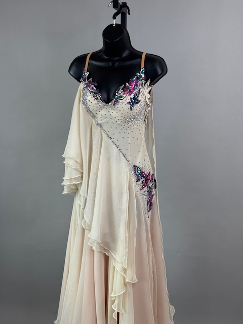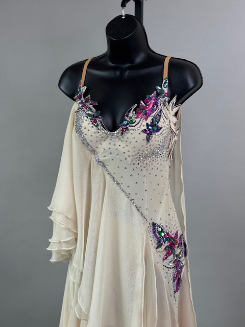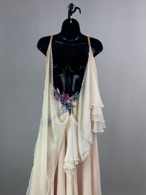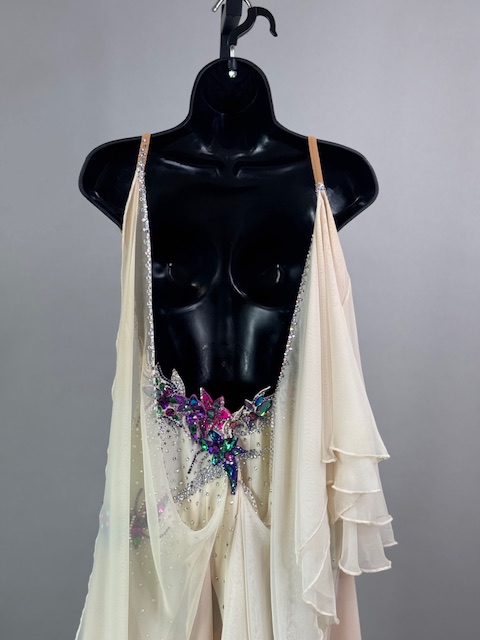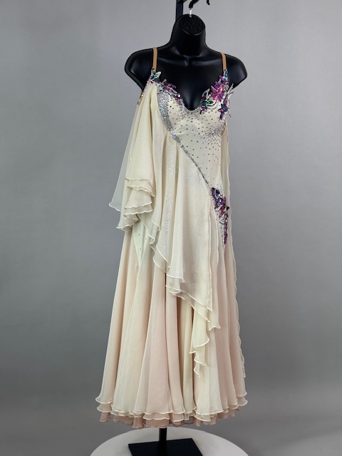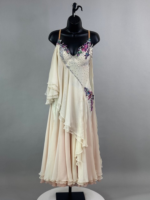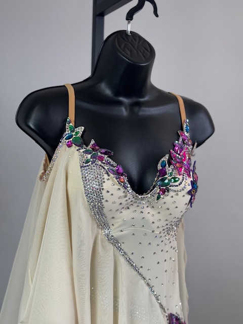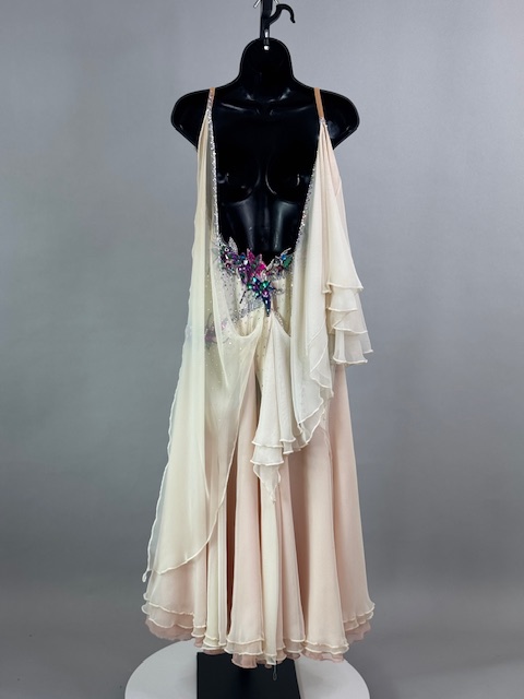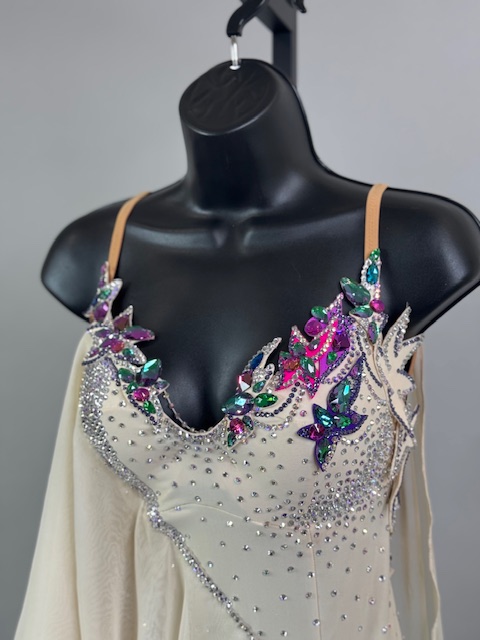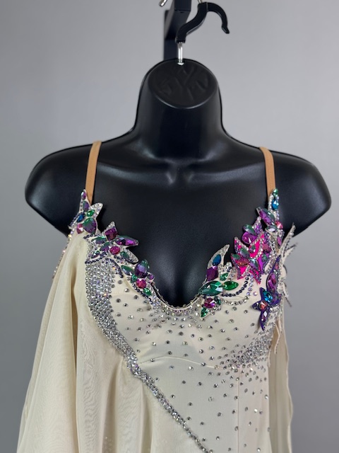 This is a stunning colorful beige smooth dress! It moves amazing on the dance floor, a true beauty! Trimmed with Austrian Crystals.