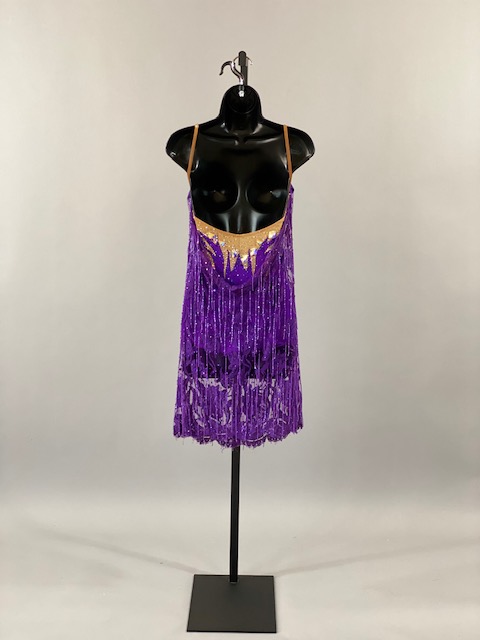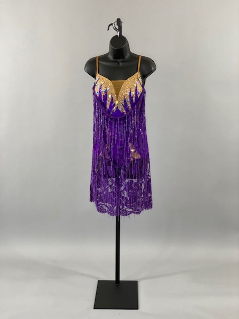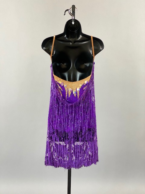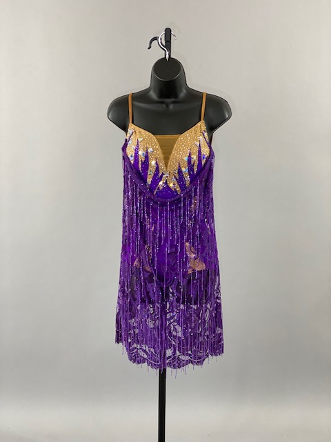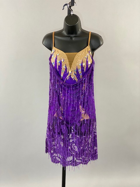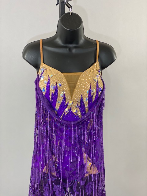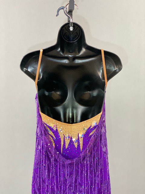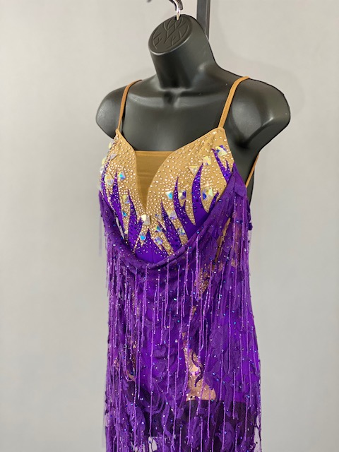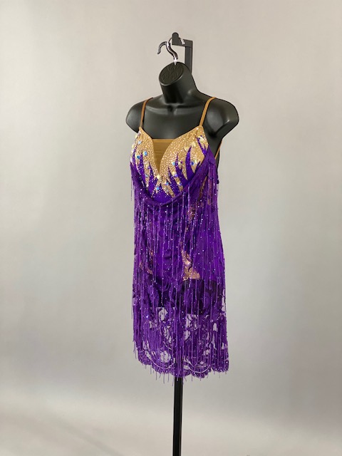 This beautiful bright purple and tan Rhythm/Latin dress is very unique, lines creates a great effect on the dance floor. Great for showcase or theatrical arts. This dress is stoned with Austrian Crystals.
