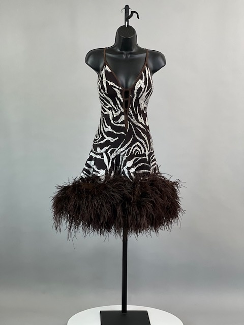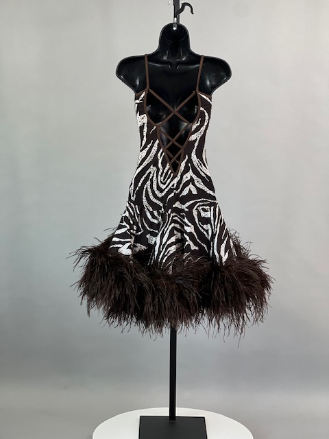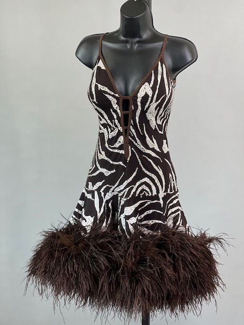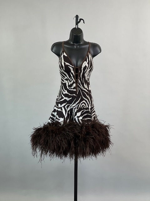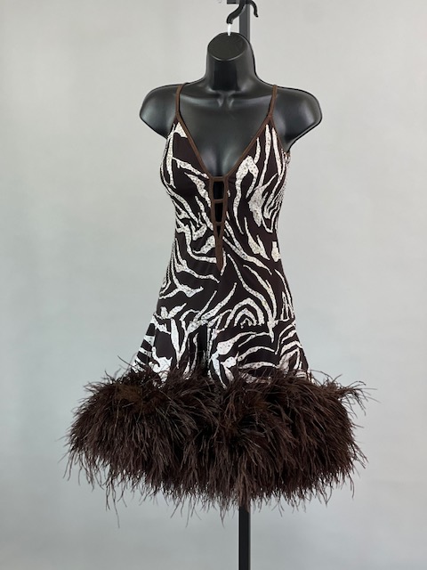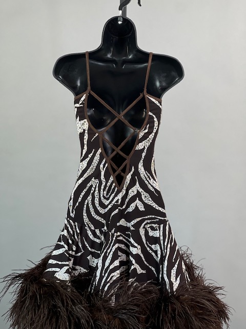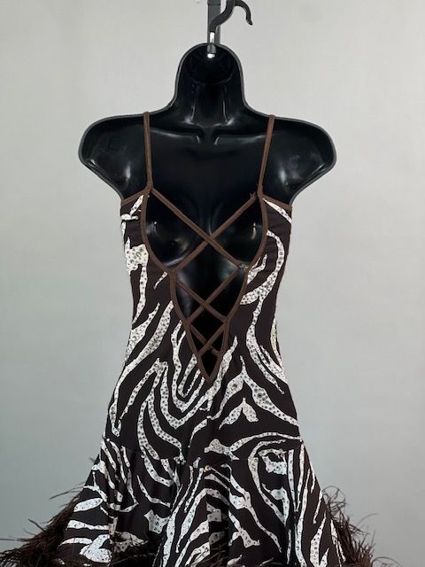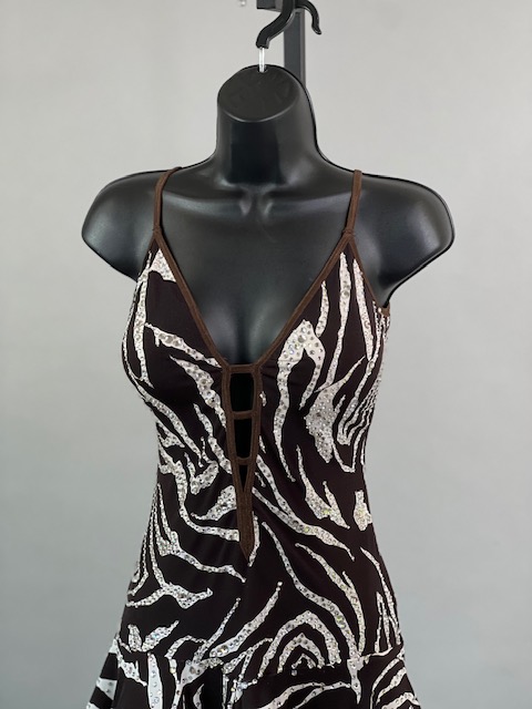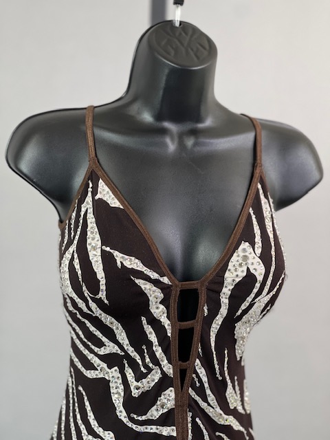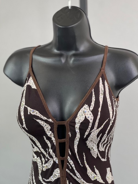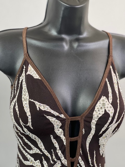 This is a beautiful brown zebra pattern Rhythm/Latin dress designed by Dore Designs! Skirt creates a great effect on the dance floor. Trimmed with Austrian Crystals.