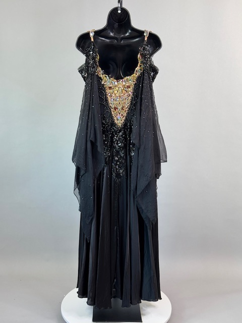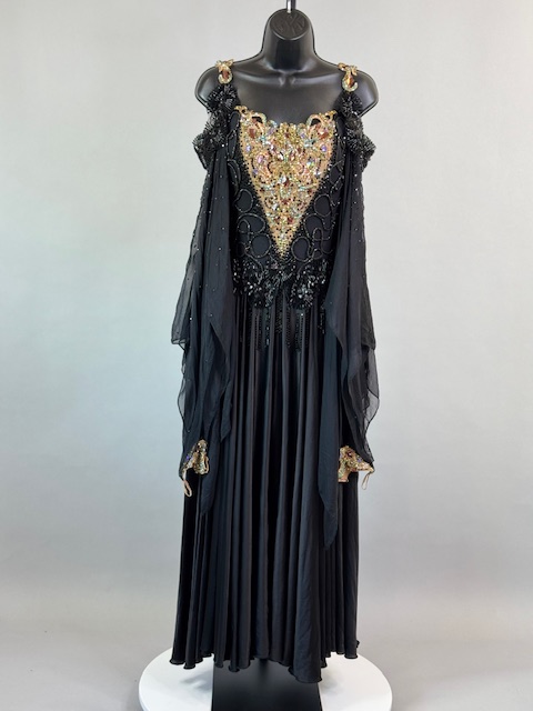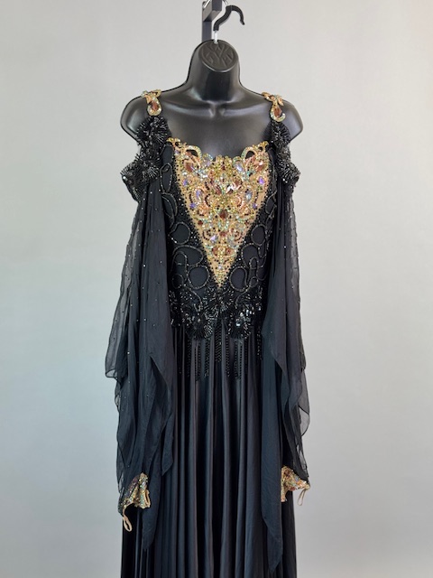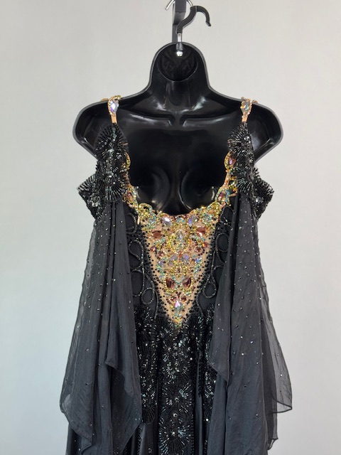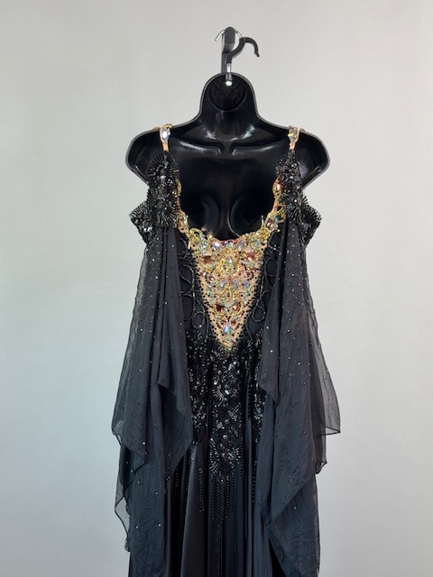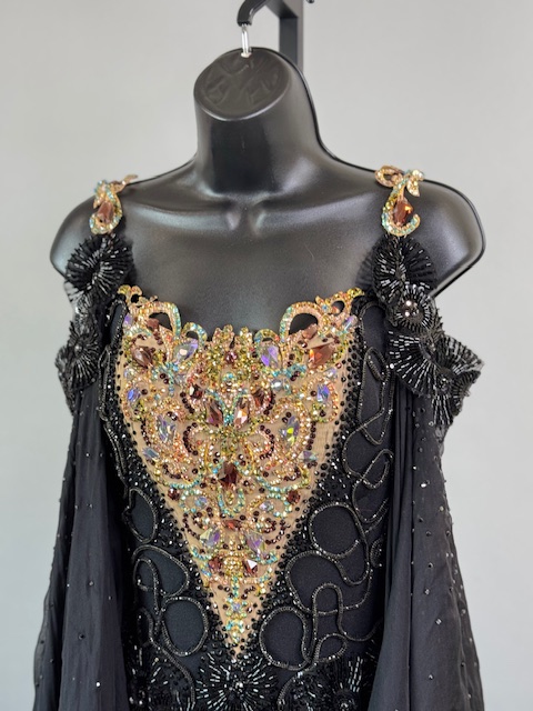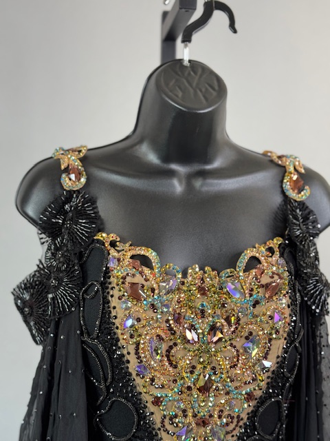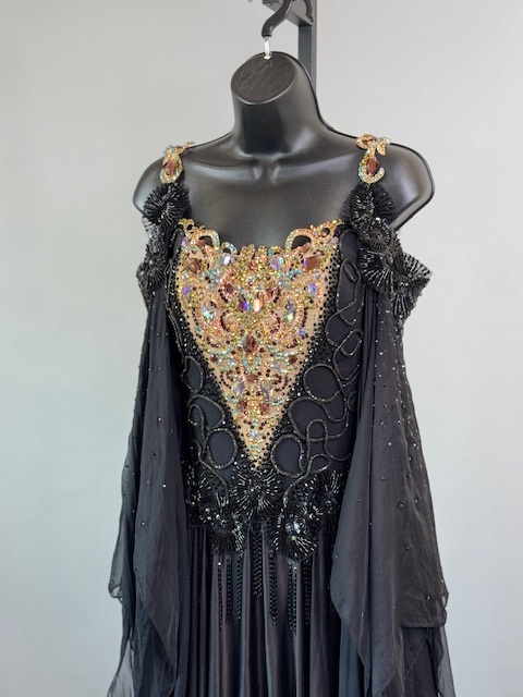 This is a stunning black and gold smooth/standard Dress! It moves amazing on the dance floor, a true beauty! Trimmed with Austrian and Preciosa Crystals.
