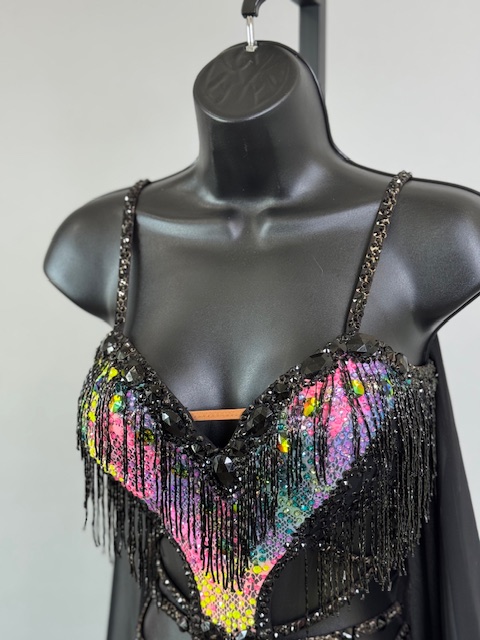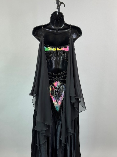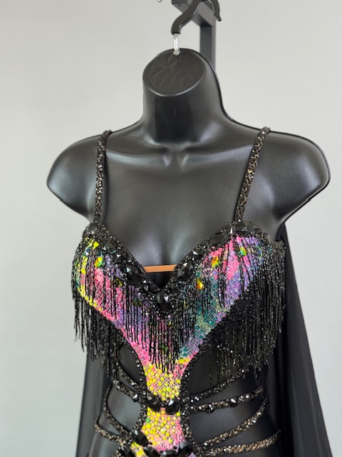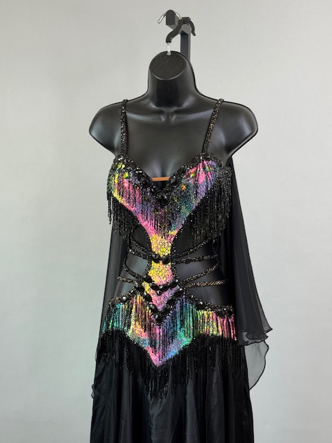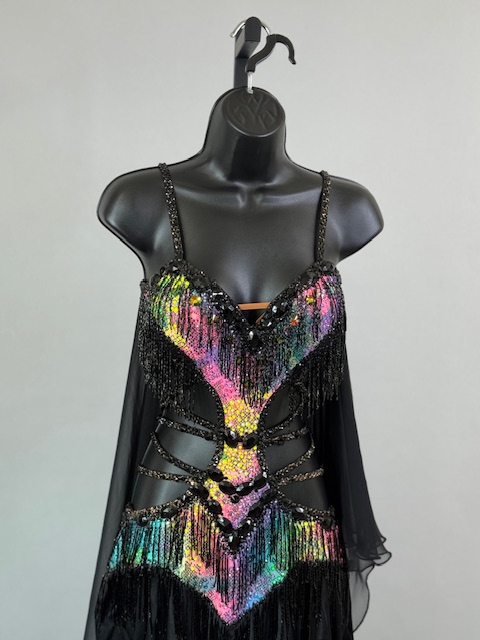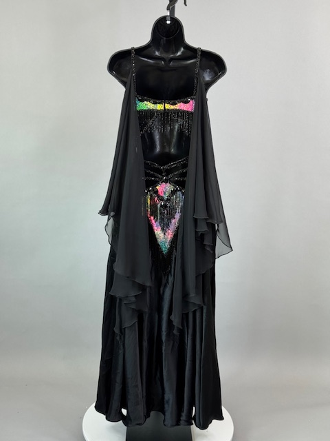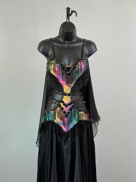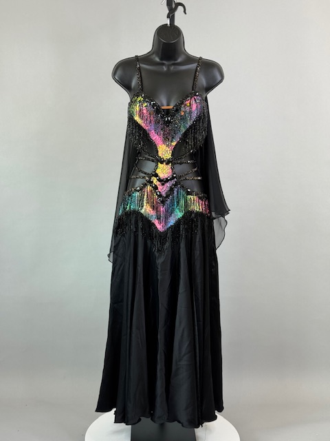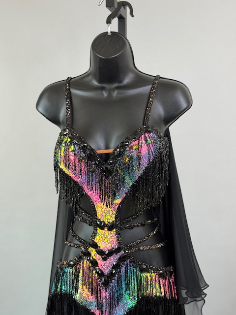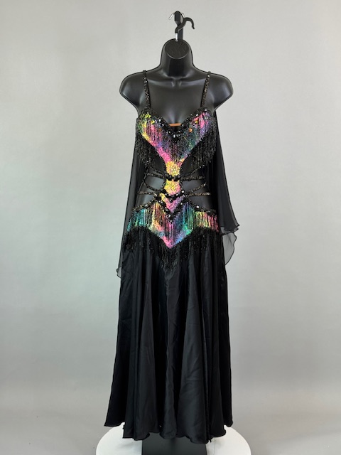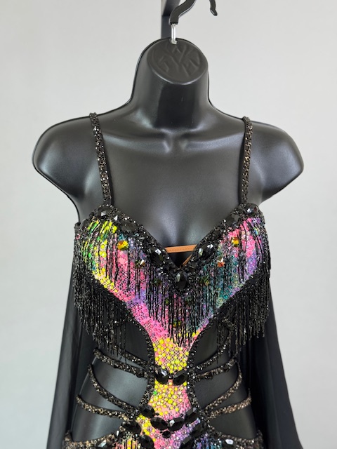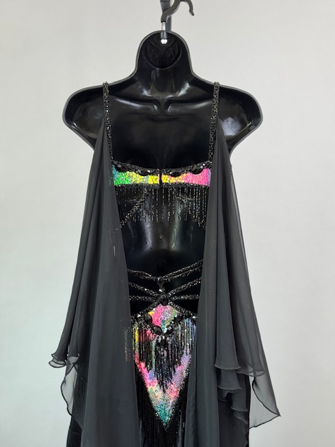 This is a beautiful black with bright color accents smooth dress designed by Dore Designs! It moves amazing on the dance floor. Trimmed with Austrian Crystals.