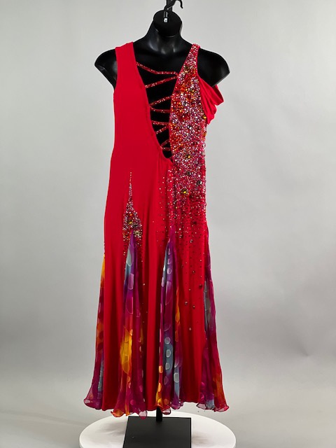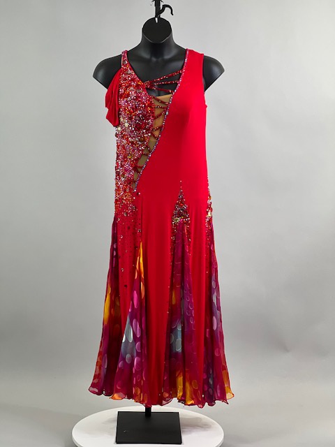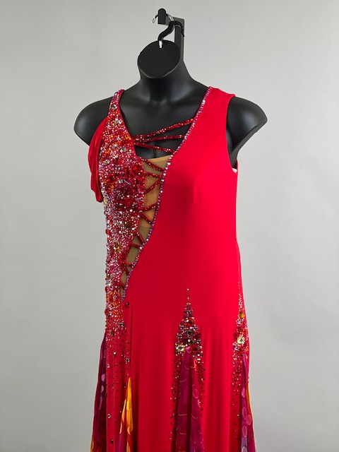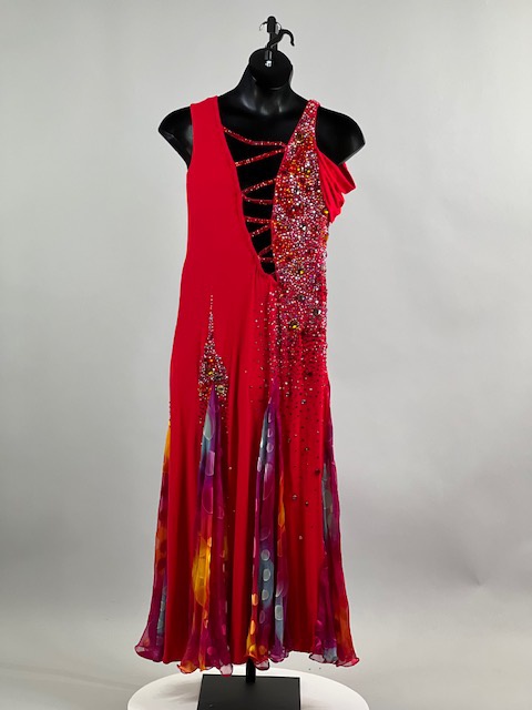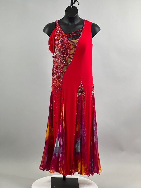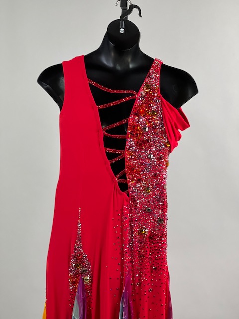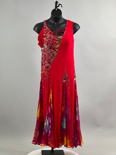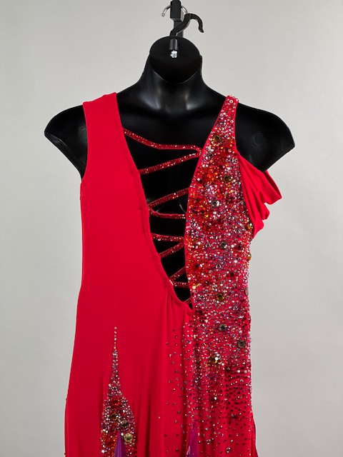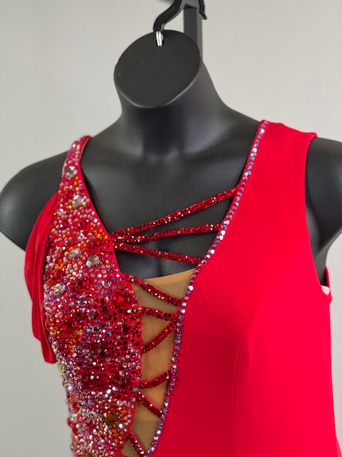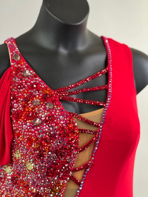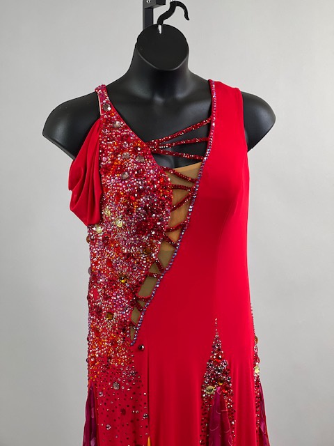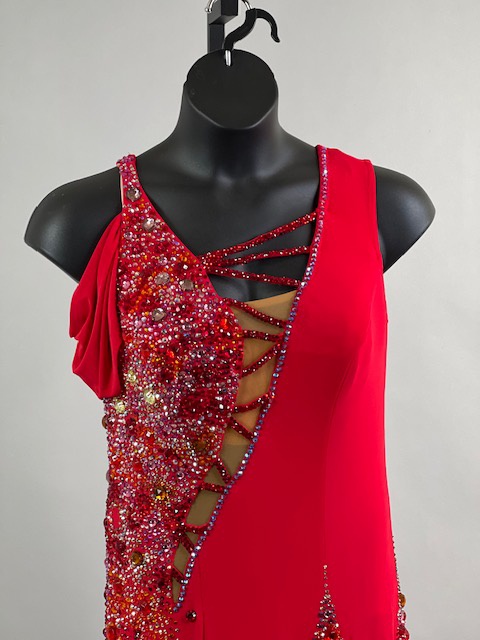 This is a beautiful red smooth dress! Skirt creates a great effect on the dance floor. Dress designed by Artistry in Motion by Julia Gorchakova. Trimmed with Austrian Crystals.