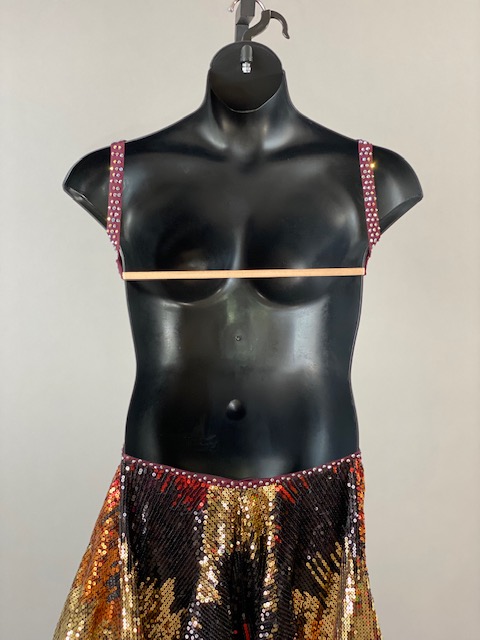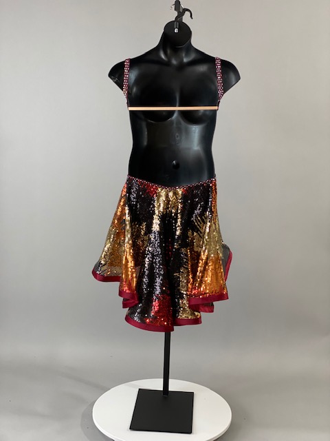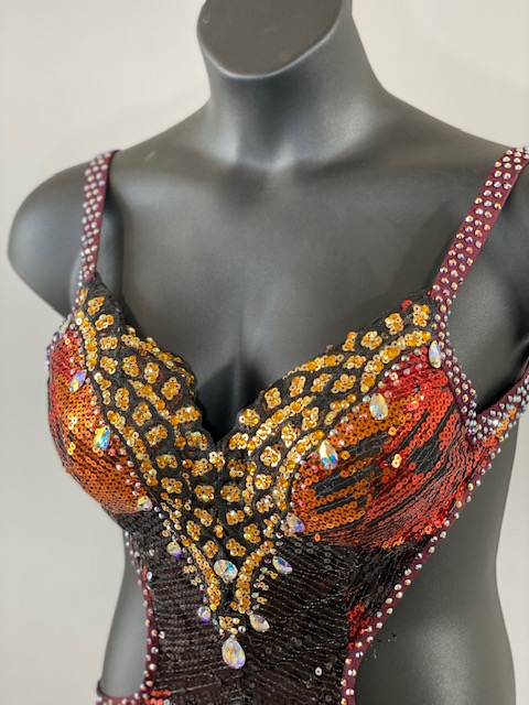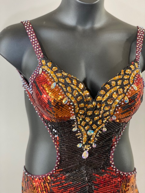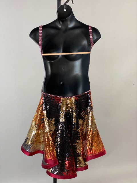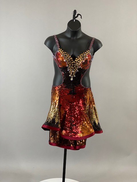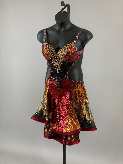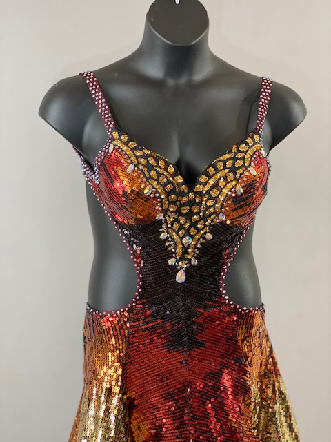This is a beautiful copper, yellow and brown sequin Rhythm/Latin dress! Great for your next showcase/ competition.