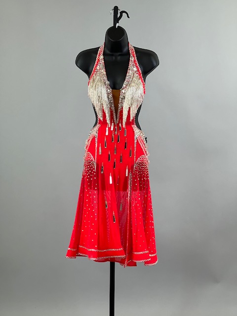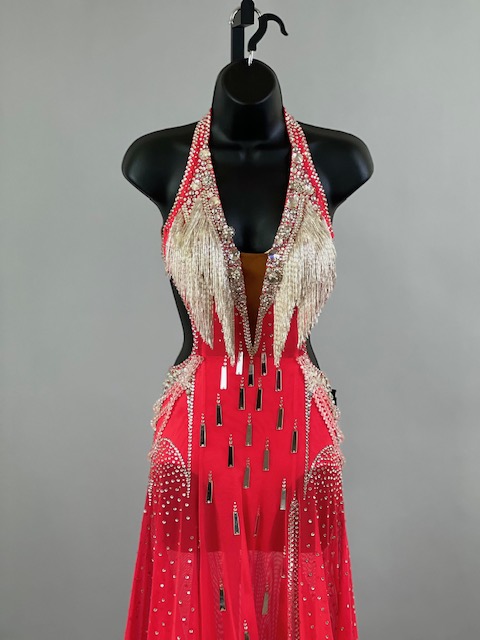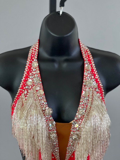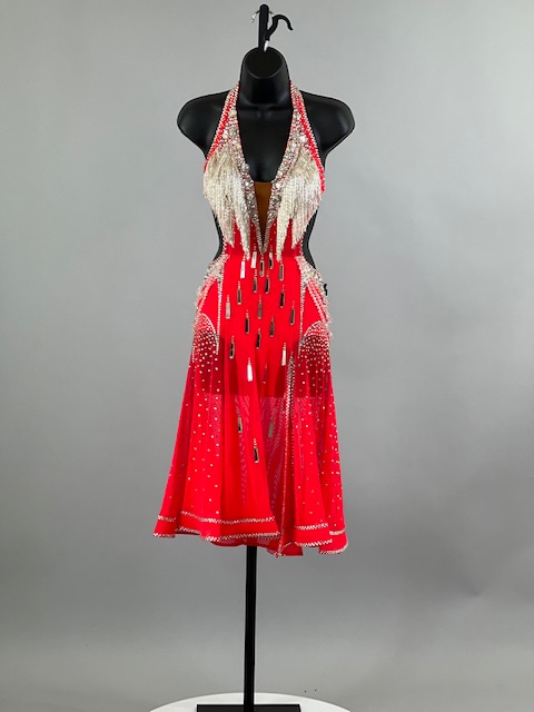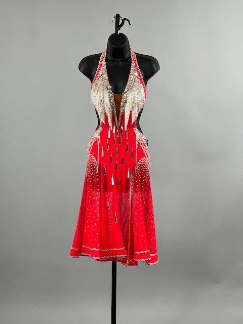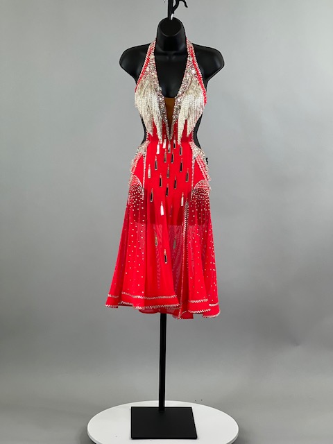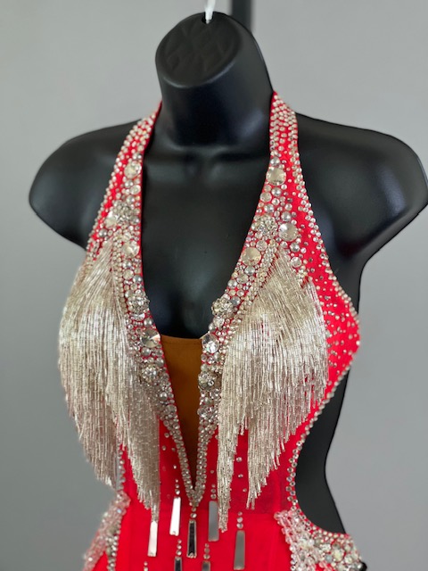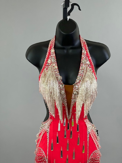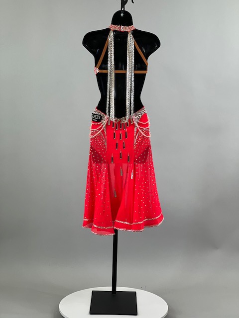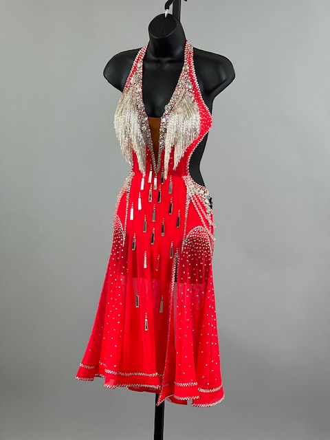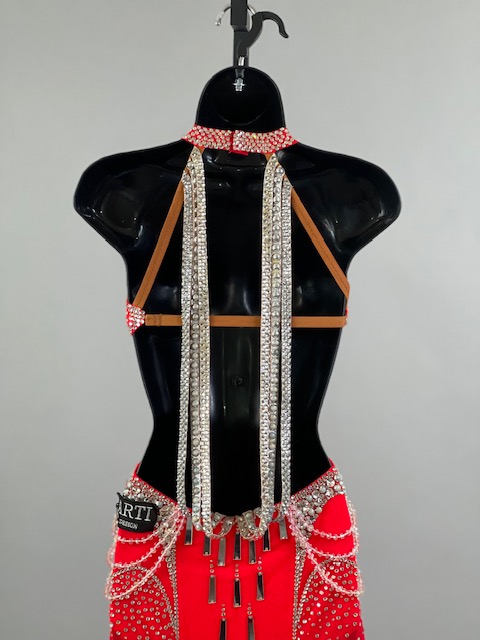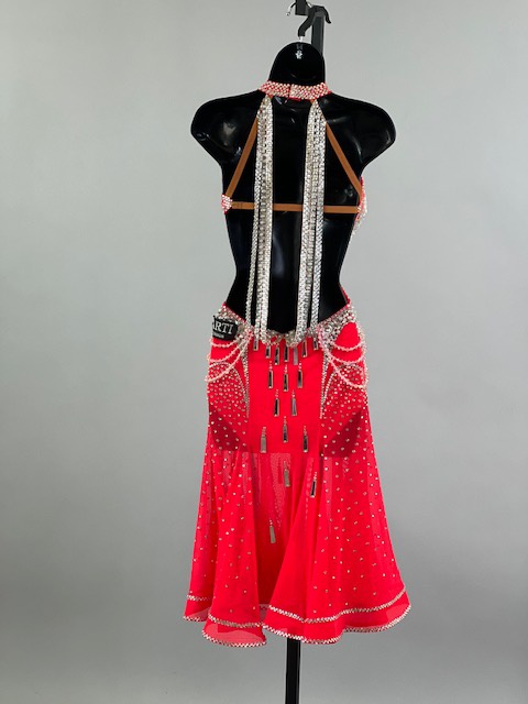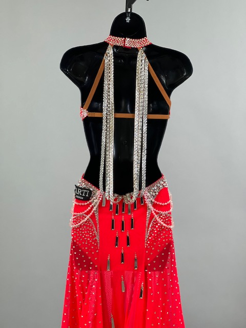 This is a beautiful bright coral/red rhythm/Latin dress designed by ARTI. Skirt moves amazing on the dance floor, a unique style.