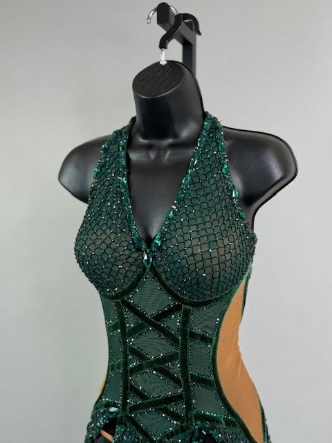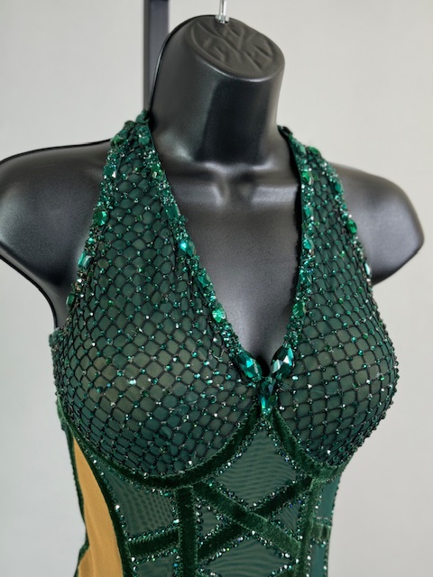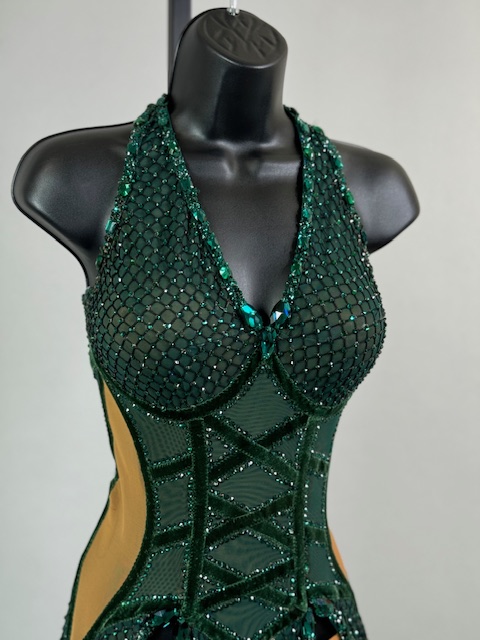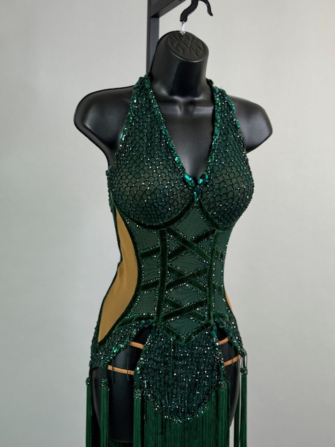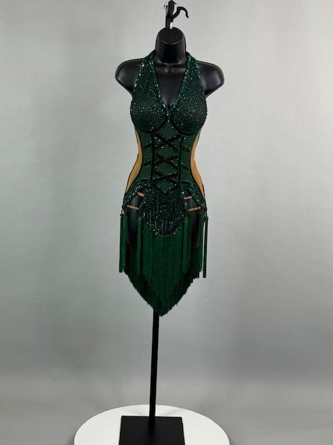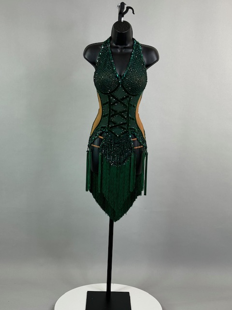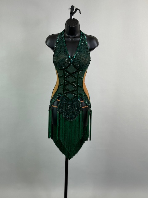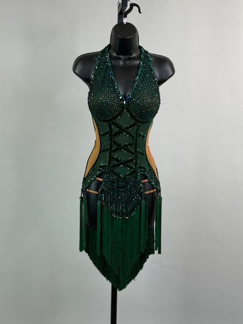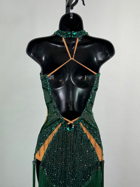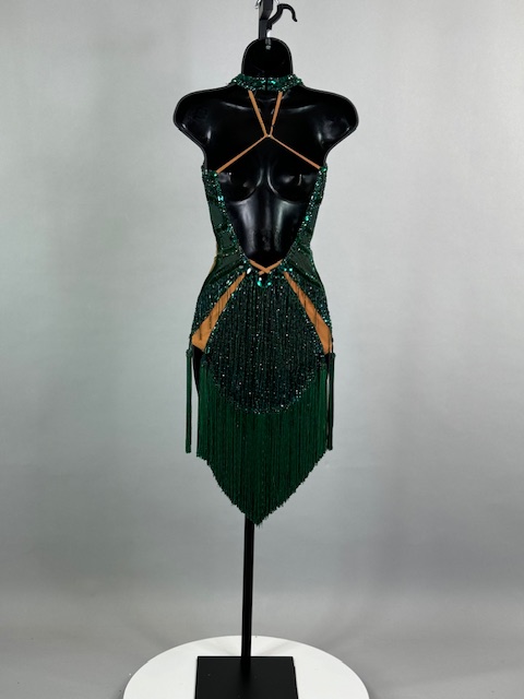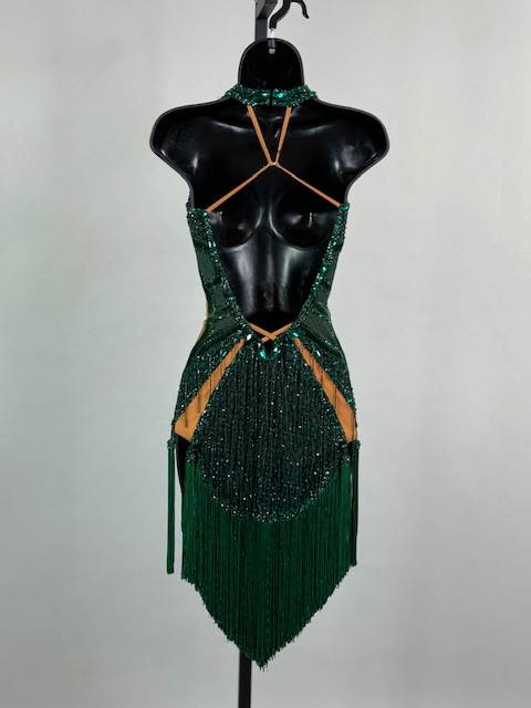 This emerald green Rhythm/Latin dress is very unique, fringes creates a great effect on the dance floor. Dress designed by Dore Designs. Trimmed with Austrian Crystals.