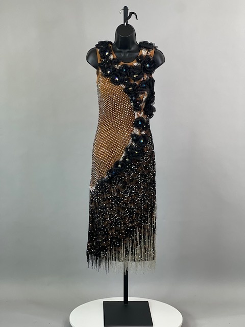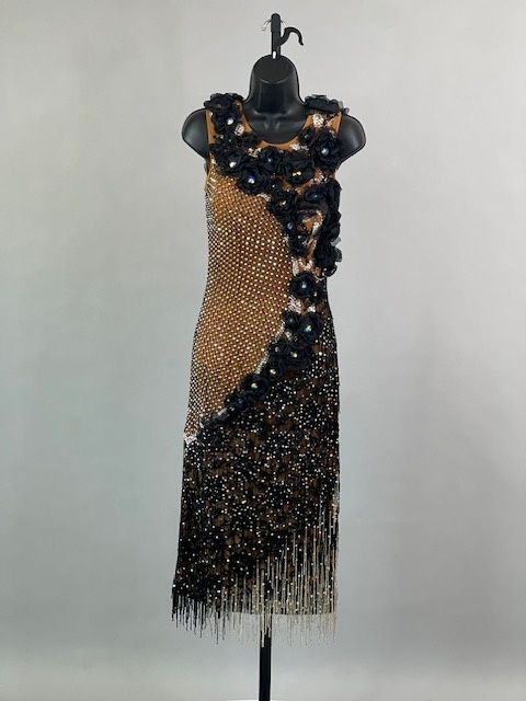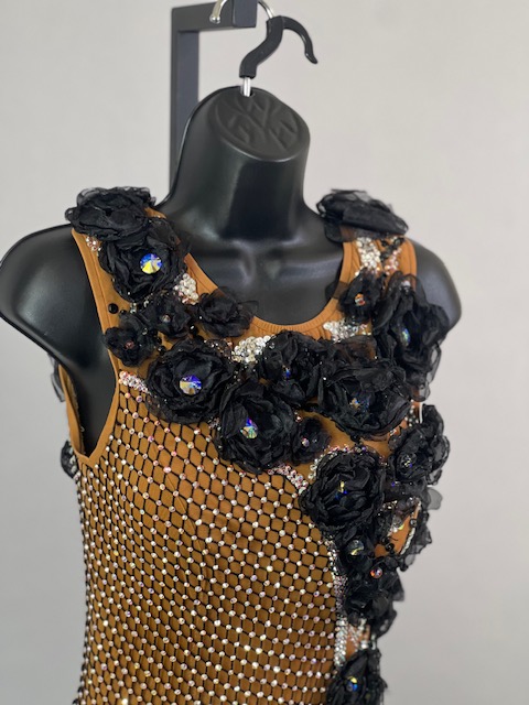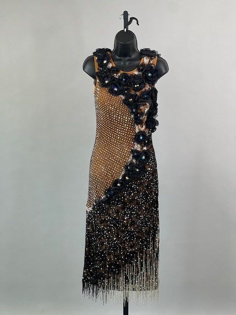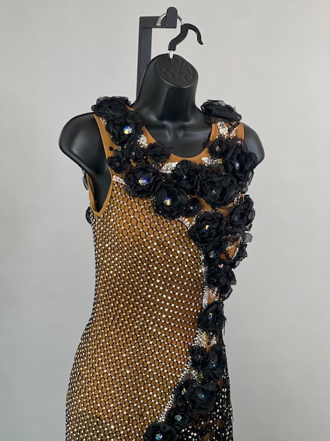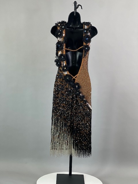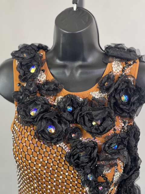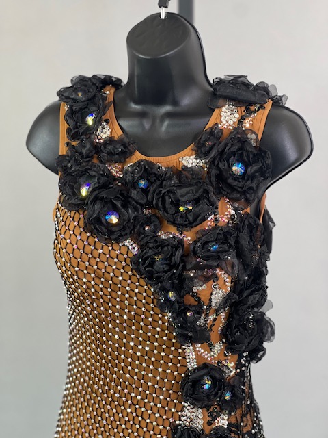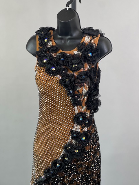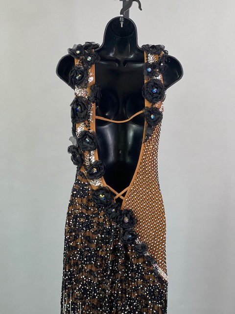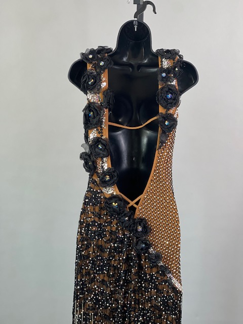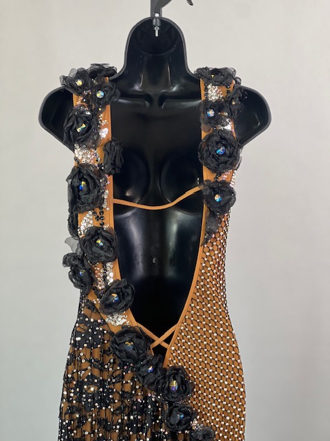 This is a beautiful black & tan Rhythm/Latin dress designed by Dore Designs! It’s a unique style, it moves amazing on the dance floor. Trimmed with Austrian Crystals.