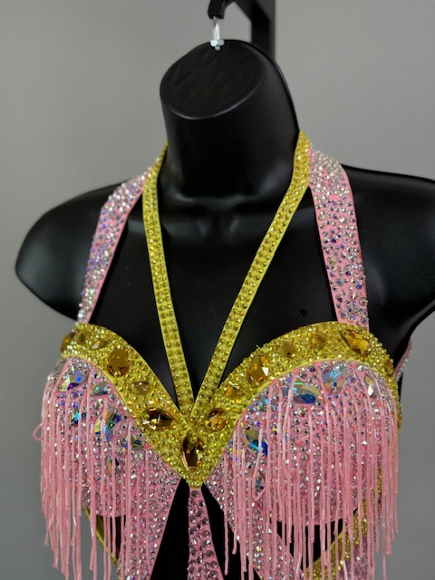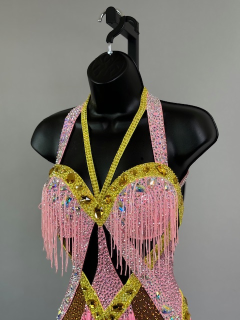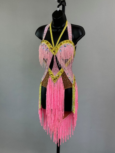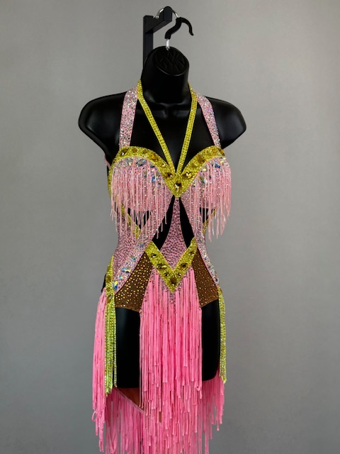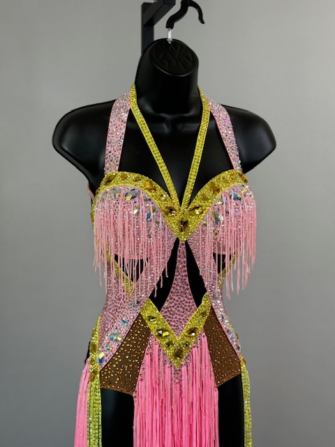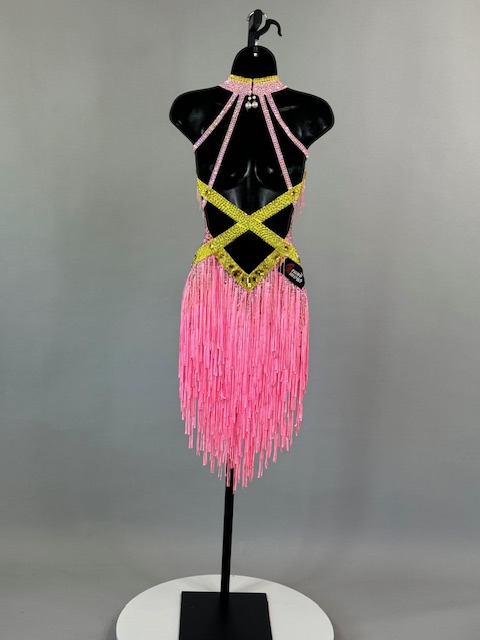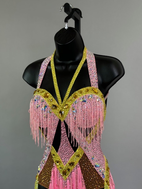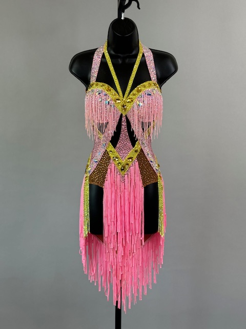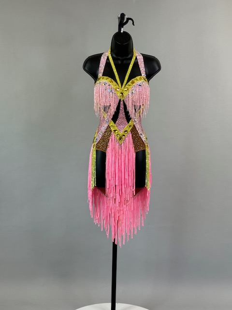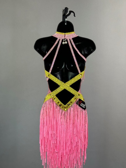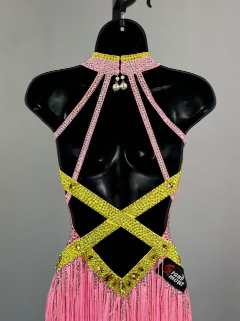 This yellow and pink Rhythm/Latin dress is very unique, fringes creates a great effect on the dance floor. Dress designed by Grand Amour. Trimmed with Austrian Crystals.