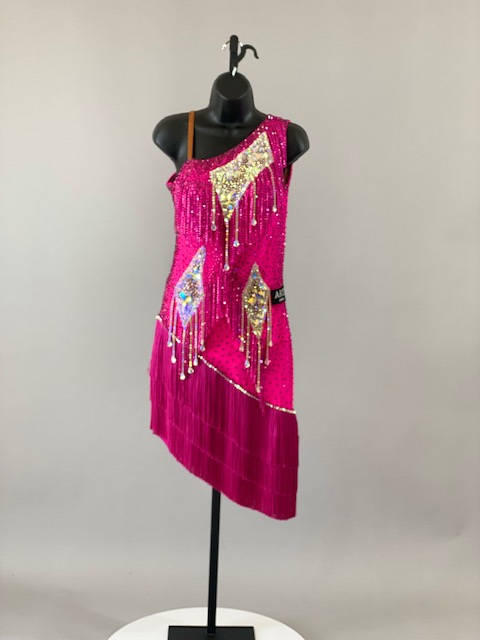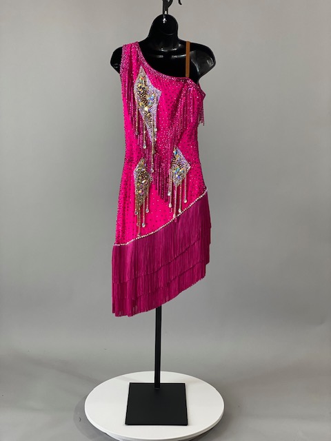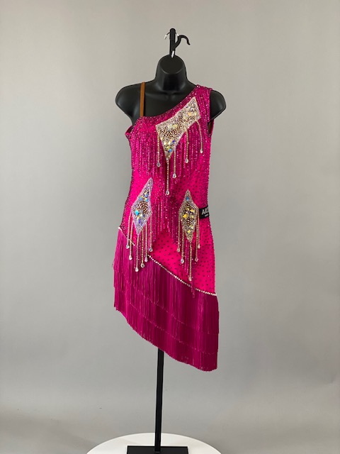 This is a gorgeous bright fuchsia Rhythm/Latin Dress! It’s an absolute stunning dress on the dance floor. Very unique style! Designed by ARTI. Trimmed with Austrian crystals.