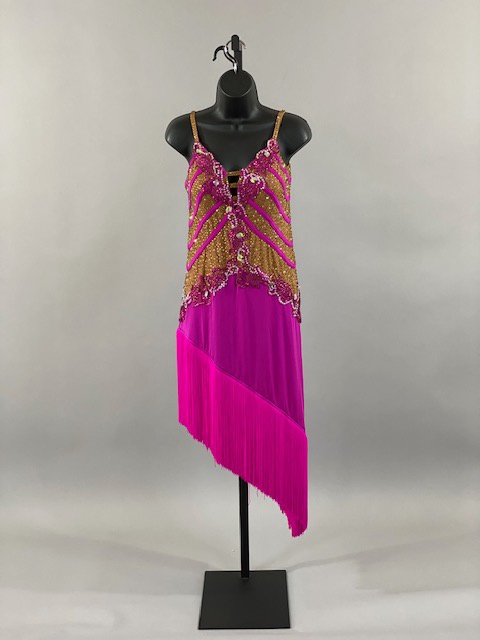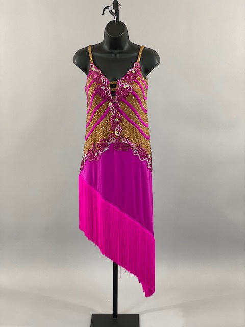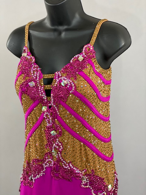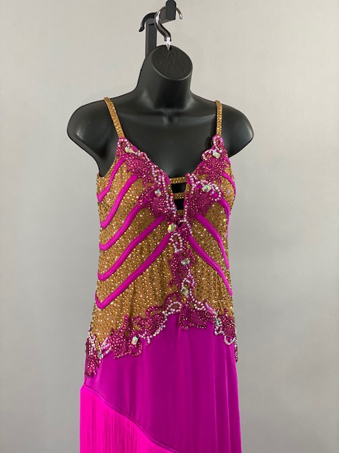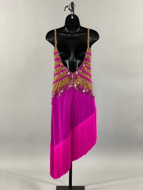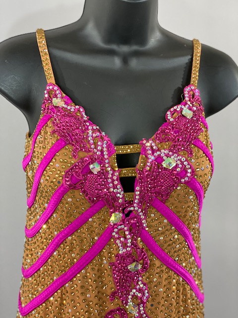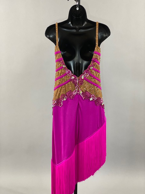 This beautiful bright pink and tan Rhythm/Latin dress is very unique, fringes creates a great effect on the dance floor. This dress is stoned with Korean Stones.