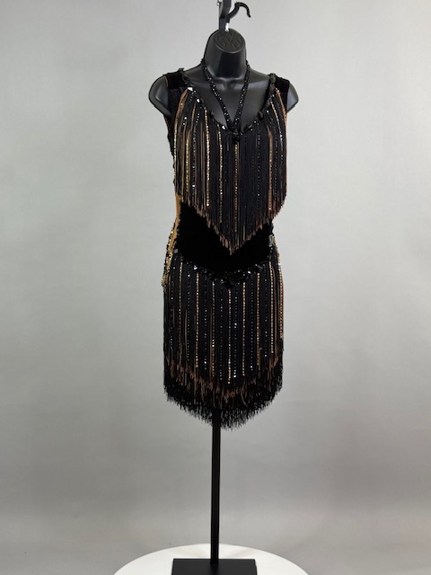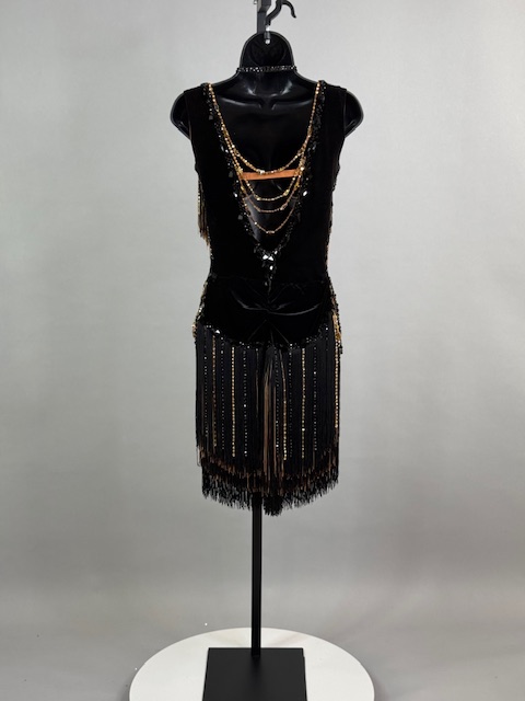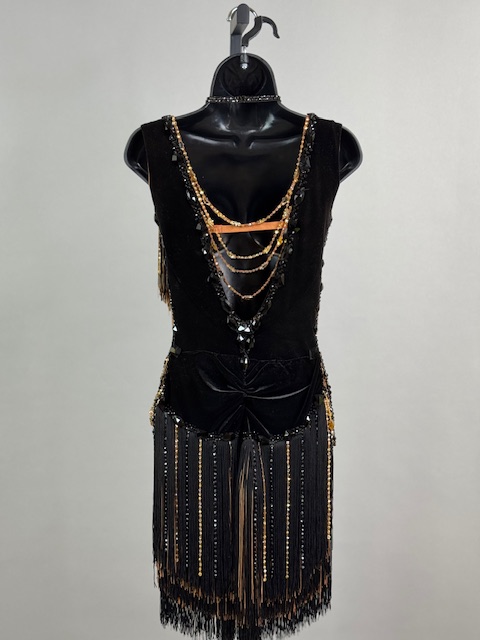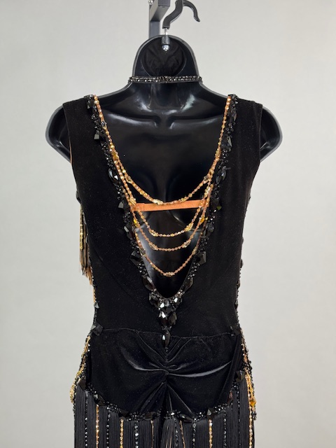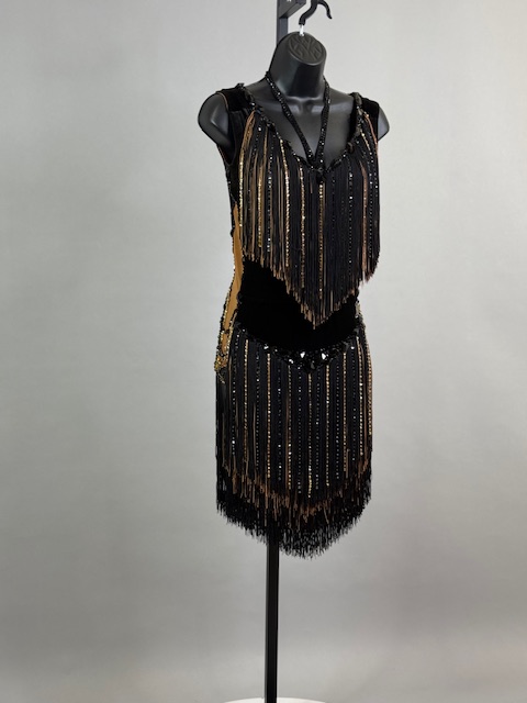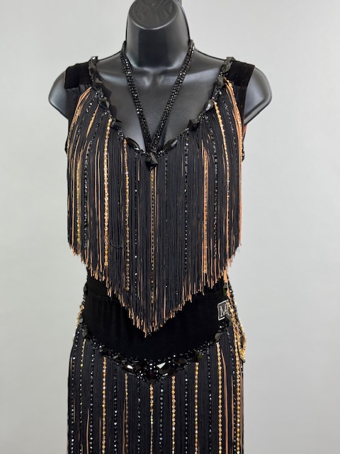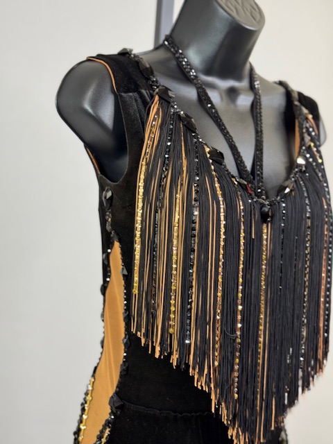 This is a gorgeous black and gold Rhythm/Latin dress! Fringes moves amazing on the dance floor. Trimmed with Austrian Crystals.