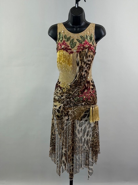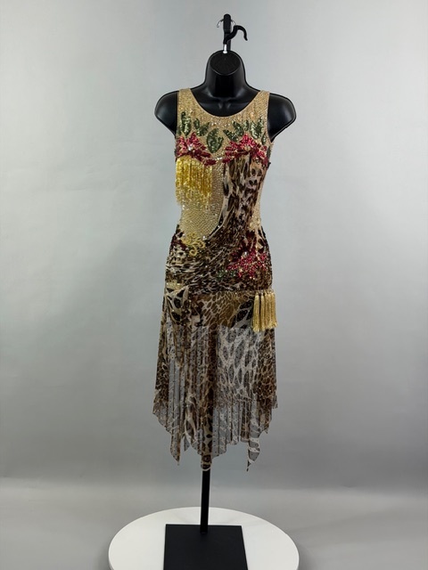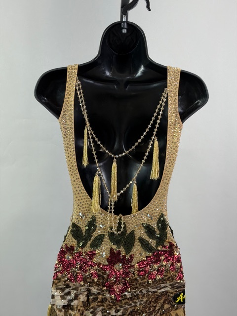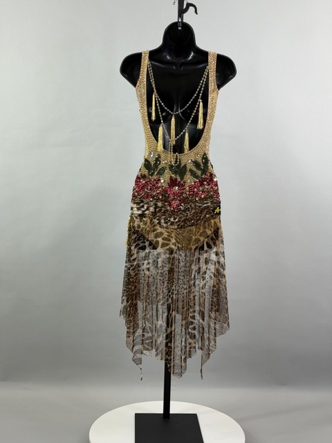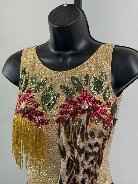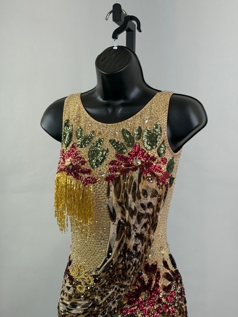 This is a beautiful colorful gold Rhythm/Latin dress. It moves amazing on the dance floor, a true beauty. Trimmed with Austrian Crystals.