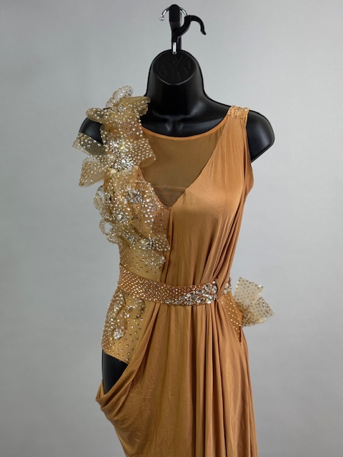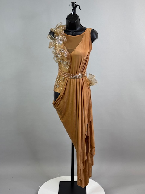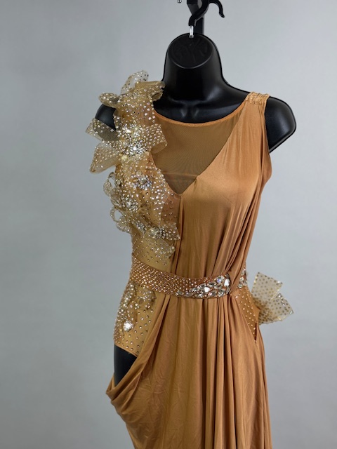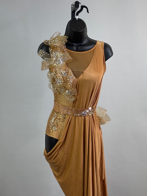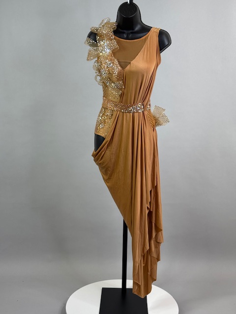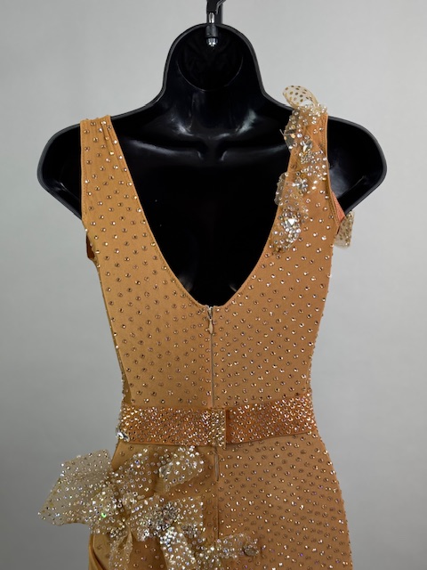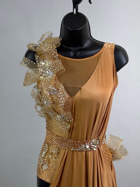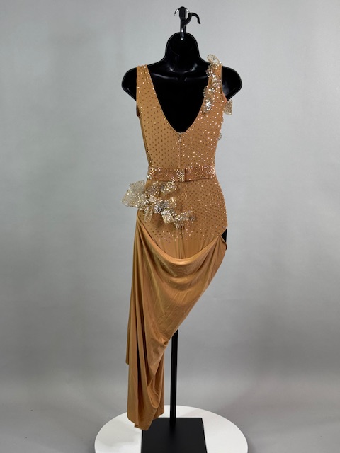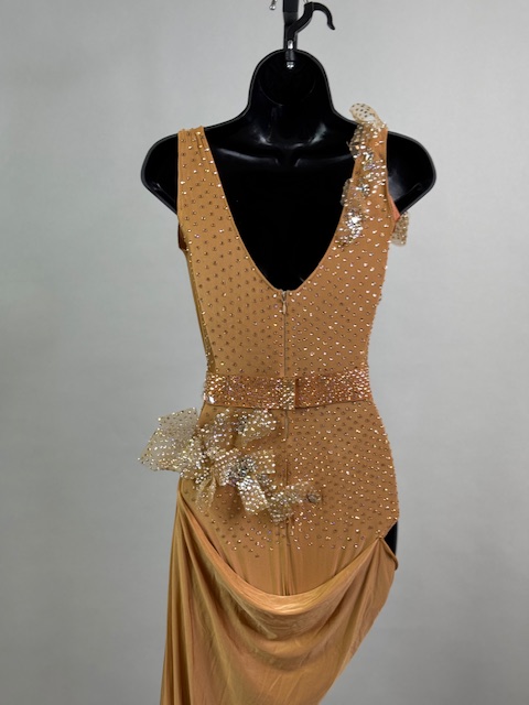 This is a beautiful gold/beige Rhythm/Latin dress! Great for competition, unique style. Trimmed with Austrian Crystals.