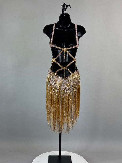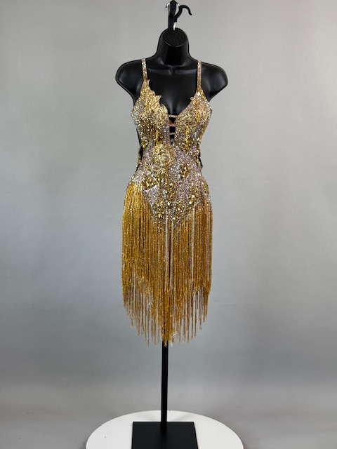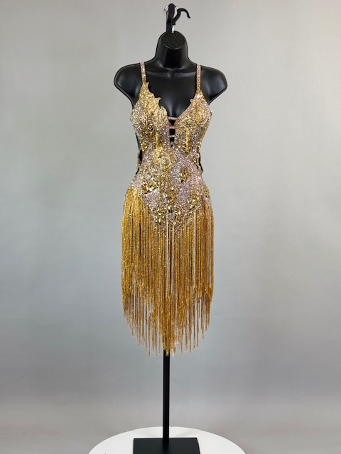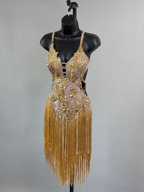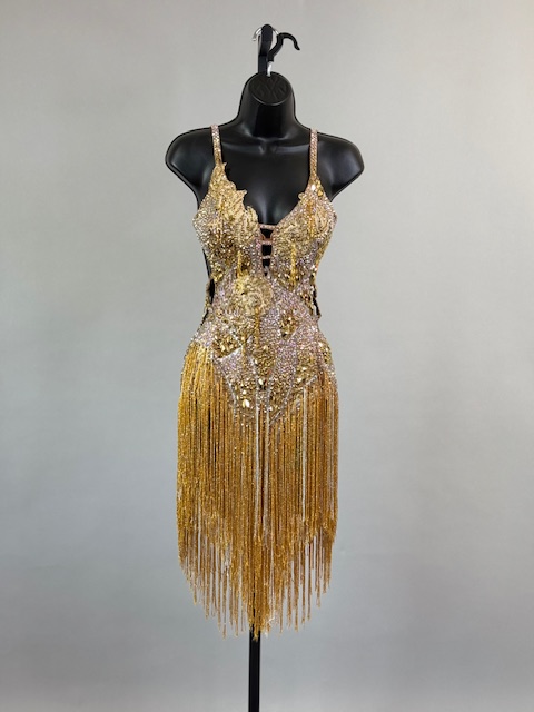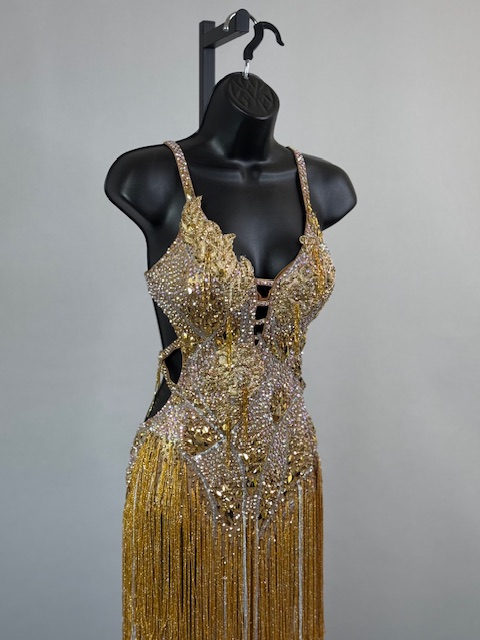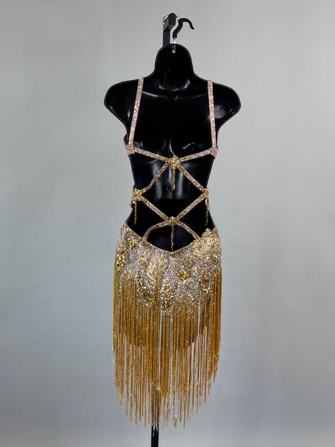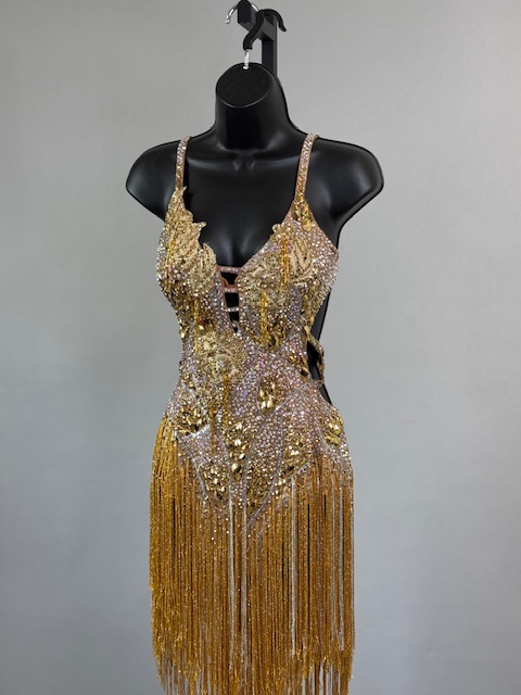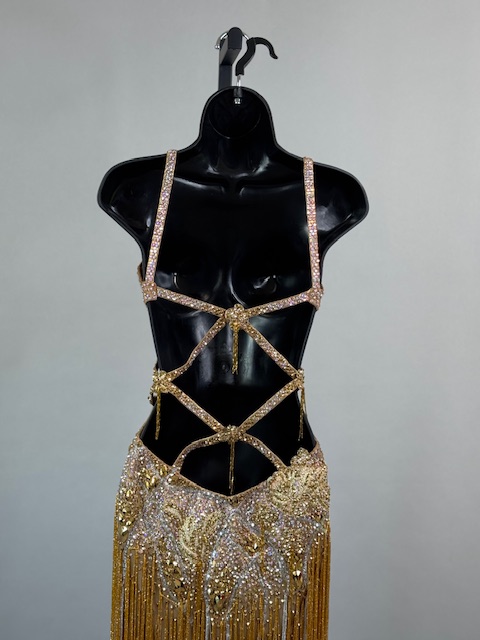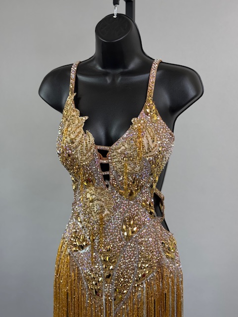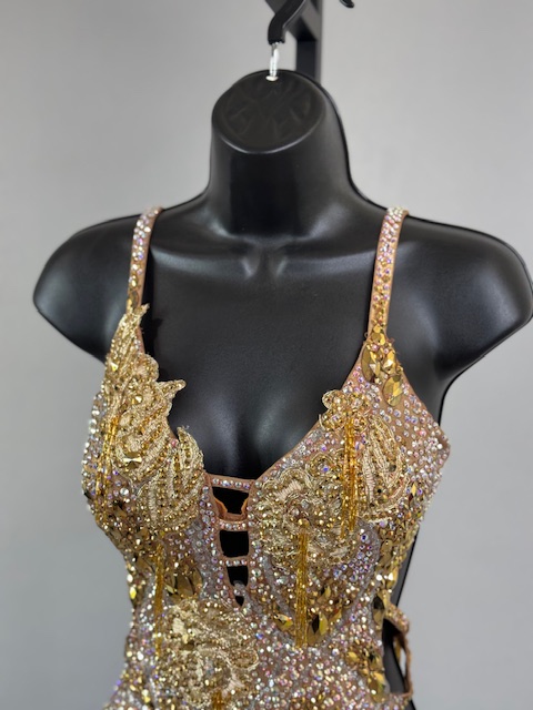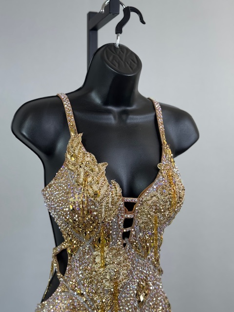 This is a stunning gold Rhythm/Latin dress designed by Artistry in Motion by Julia Gorchakova! It’s a unique style, looks amazing on the dance floor. Stoned with Austrian Crystals.