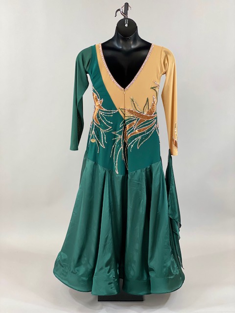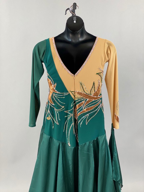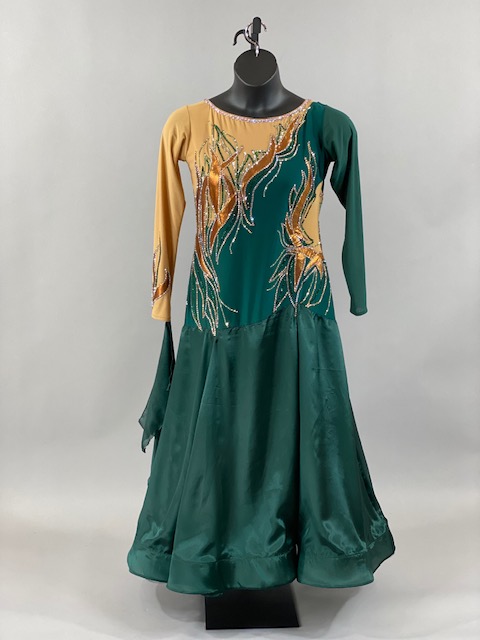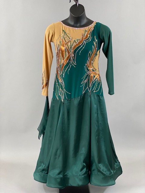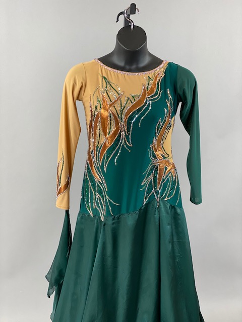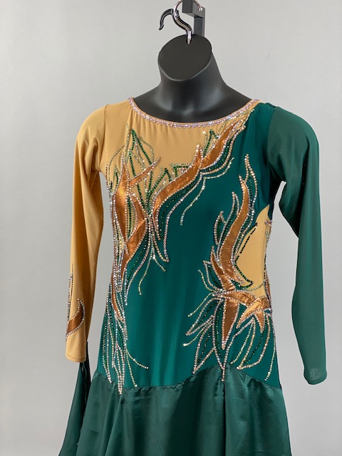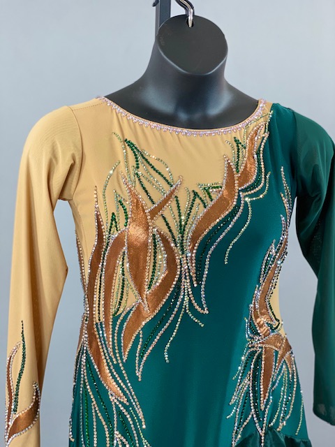This dress is very unique, beautiful style! Skirt moves amazing in the dance floor. Trimmed with Austrian Crystals.