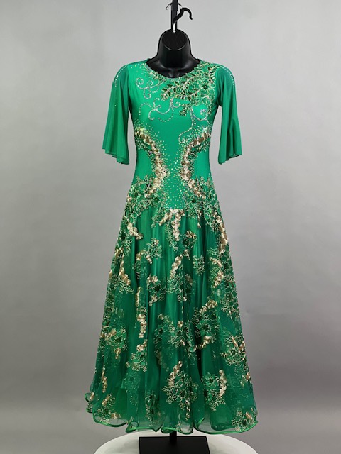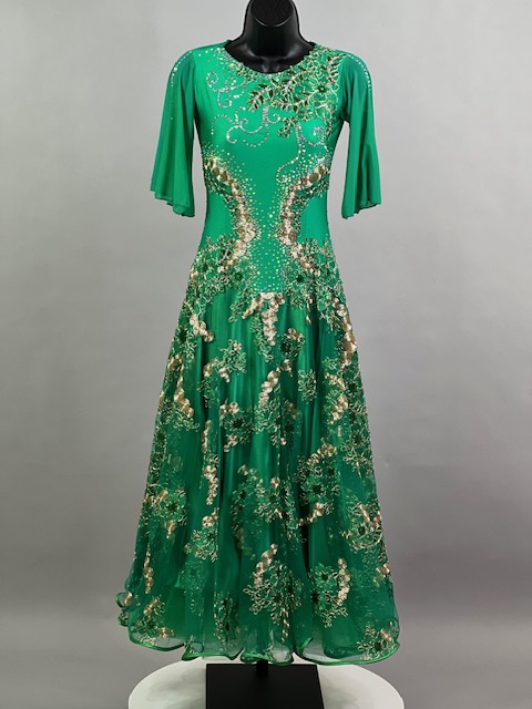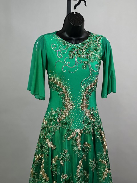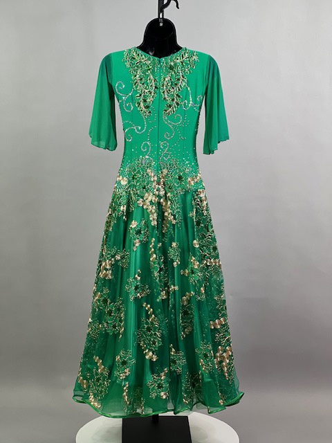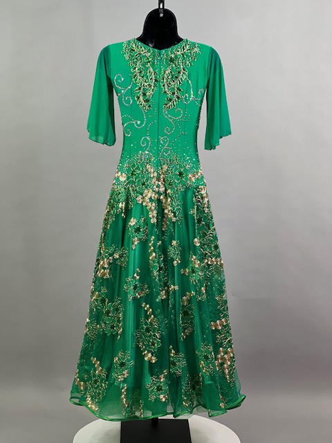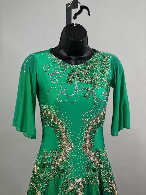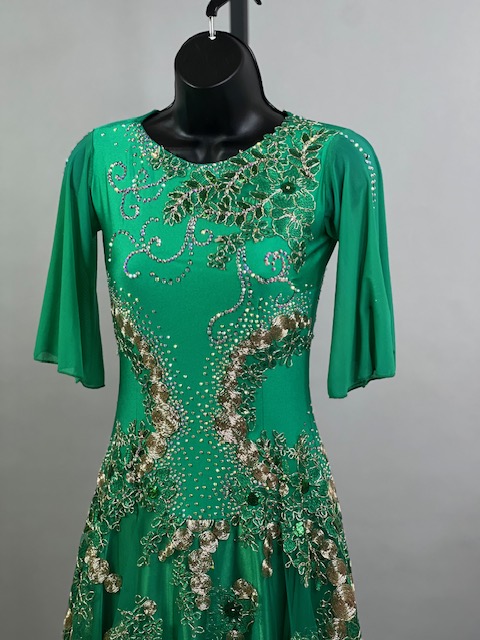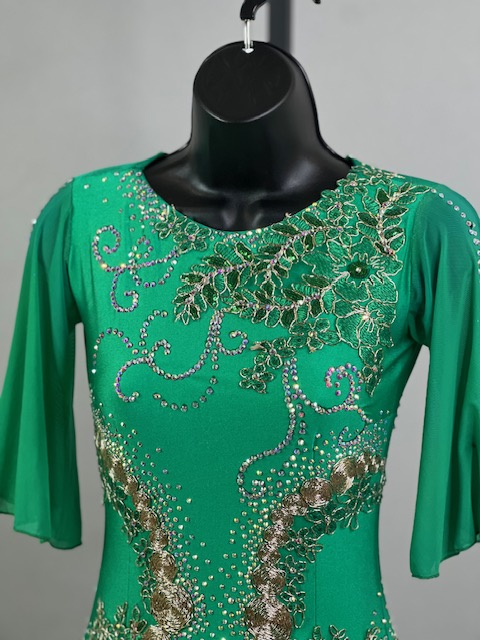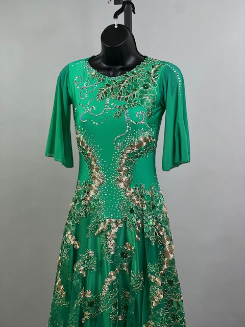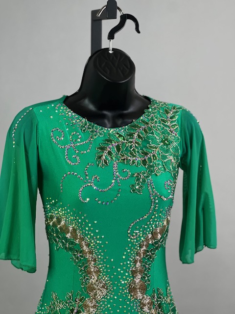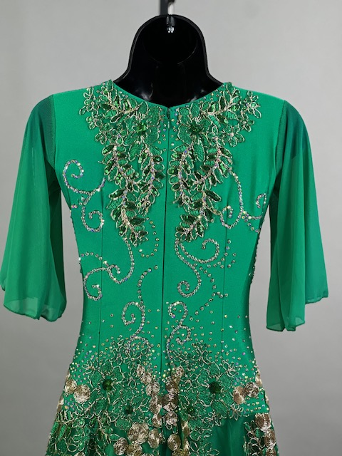 This is a beautiful bright green smooth dress designed by Cashay! It moves amazing on the dance floor! Trimmed with Preciosa crystals.