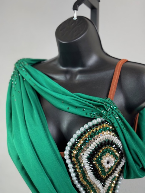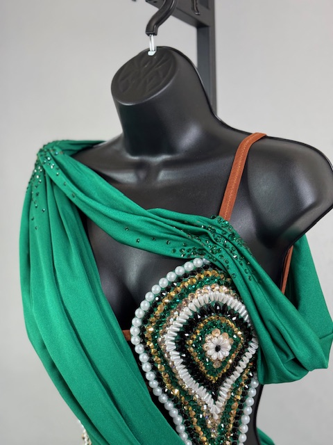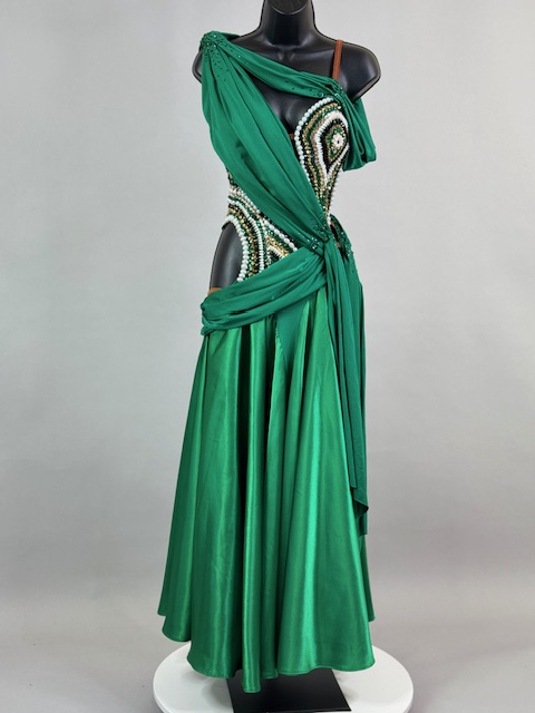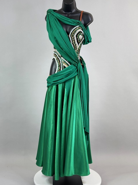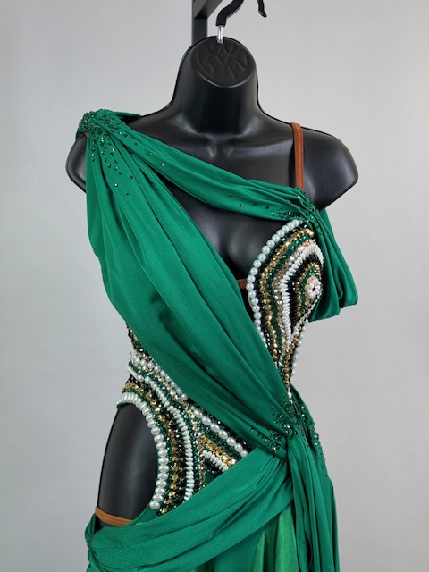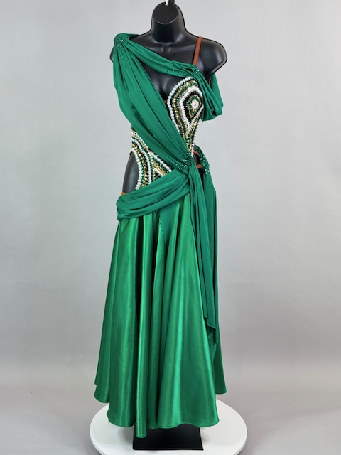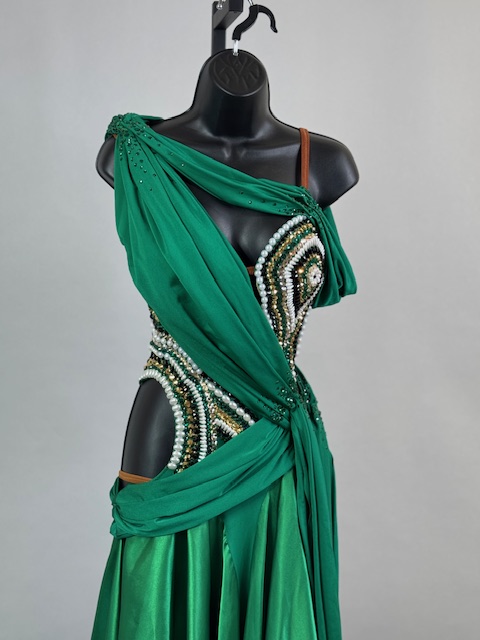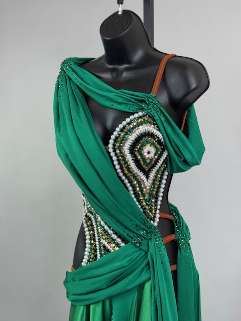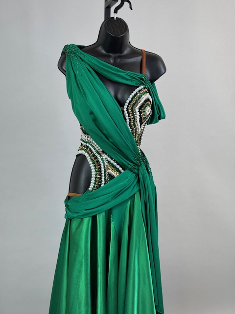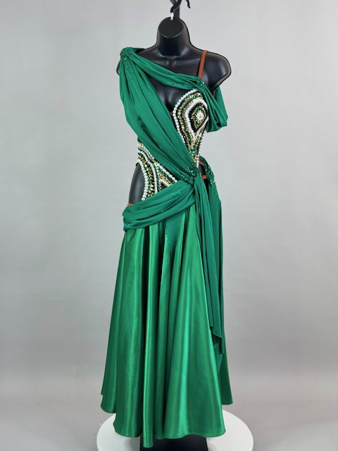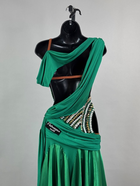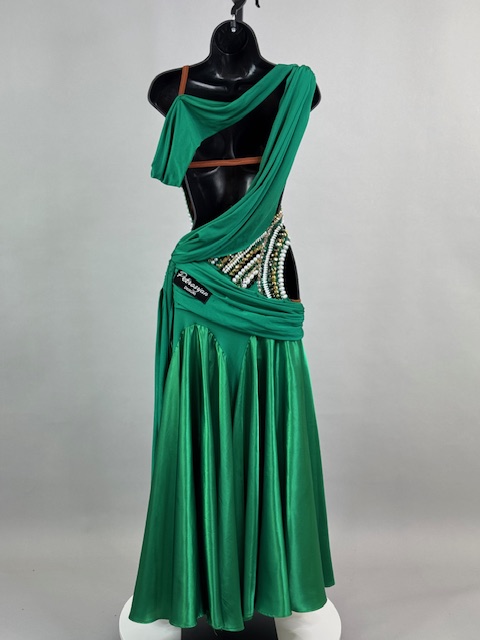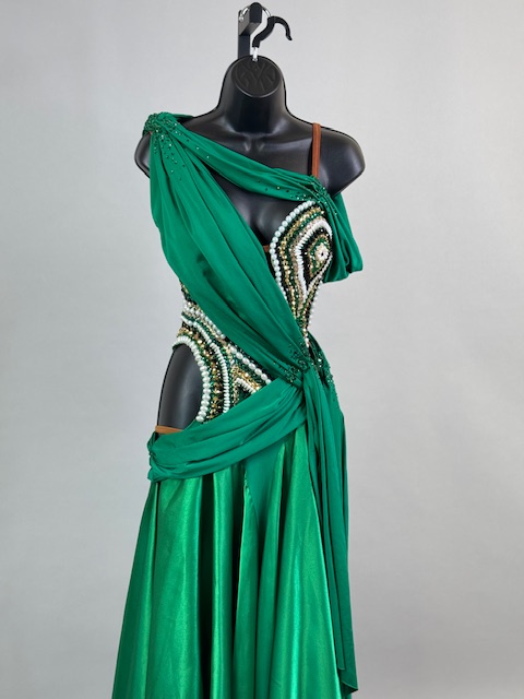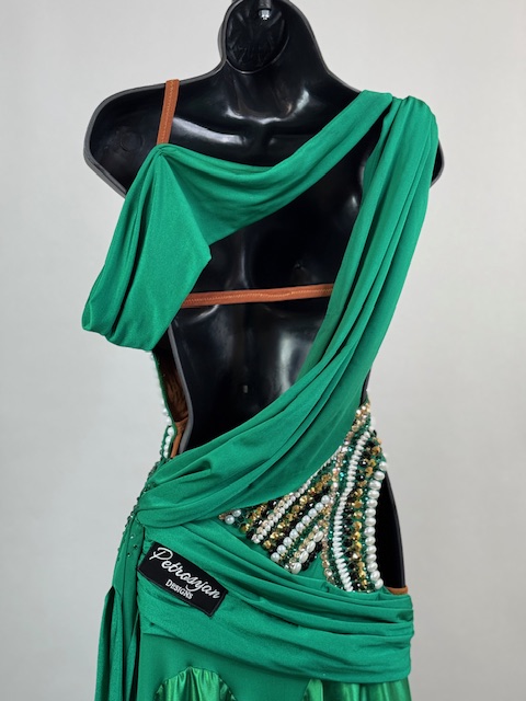 This is a beautiful bright emerald green smooth dress designed by Petrosyan Designs. It moves amazing on the dance floor, unique style. Trimmed with Austrian Crystals.