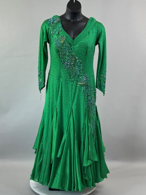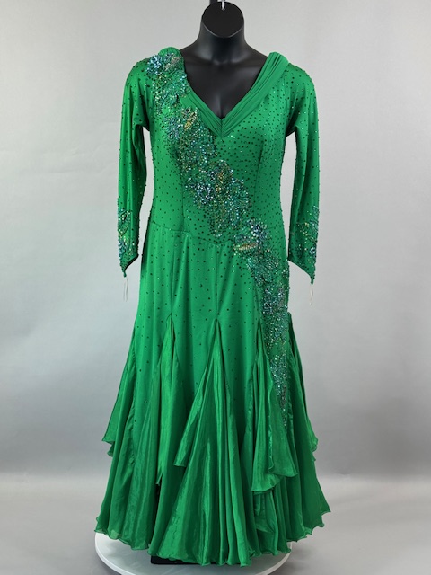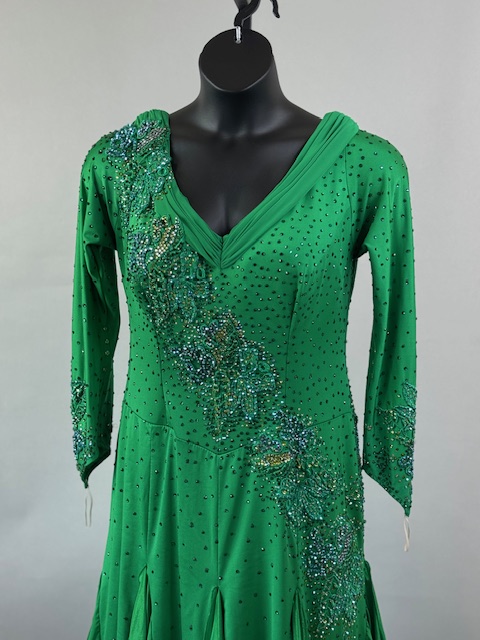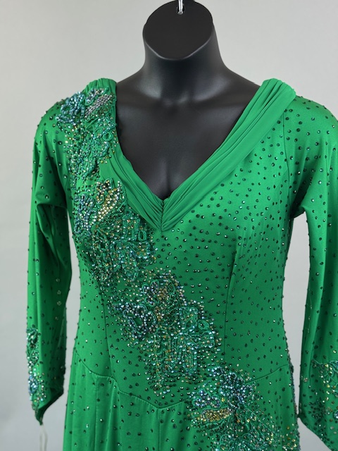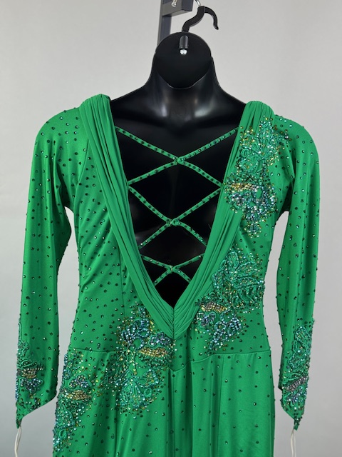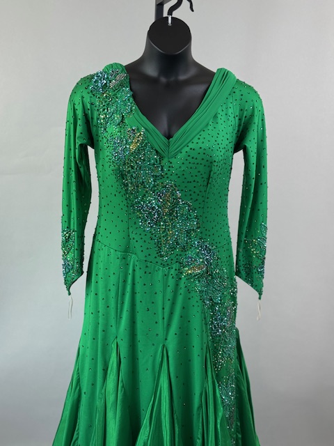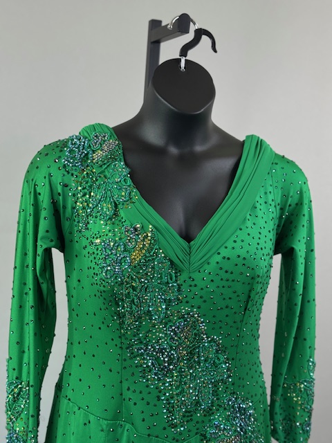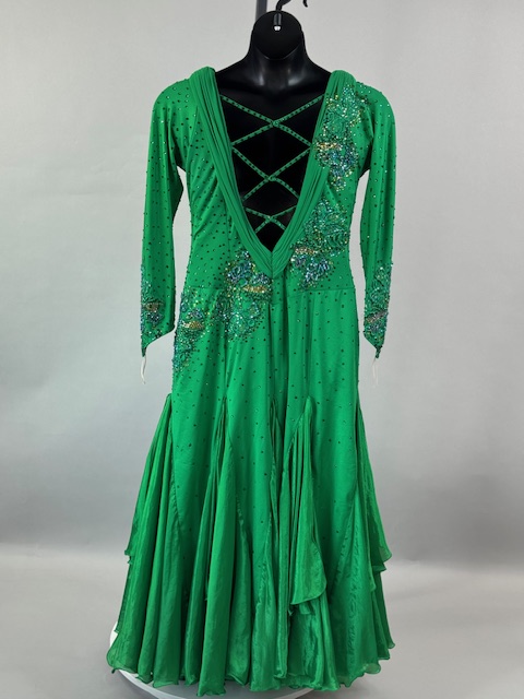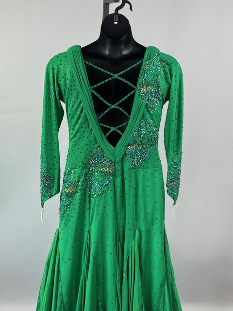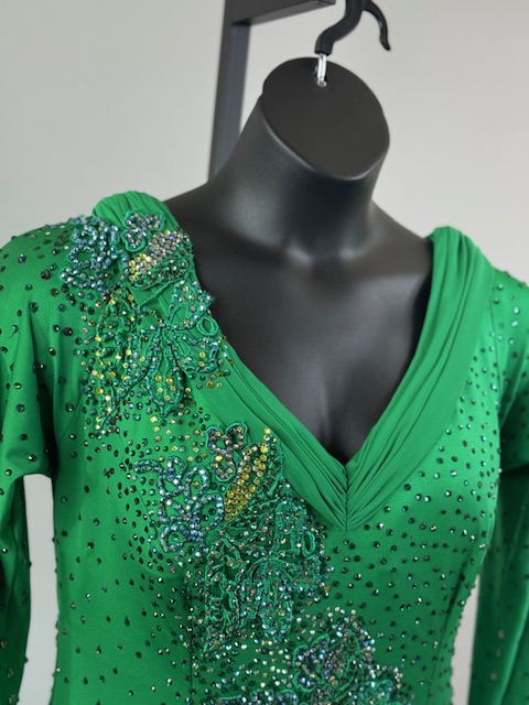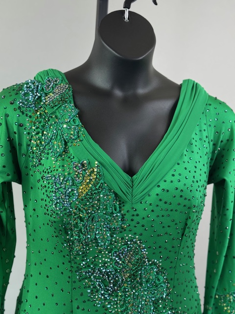 This is a stunning bright green smooth dress designed by Dress for Dance! Unique style, true beauty! Trimmed with Austrian crystals.