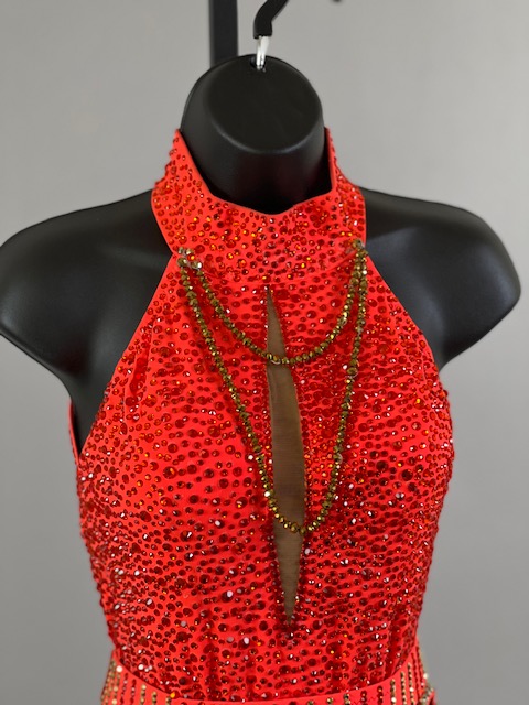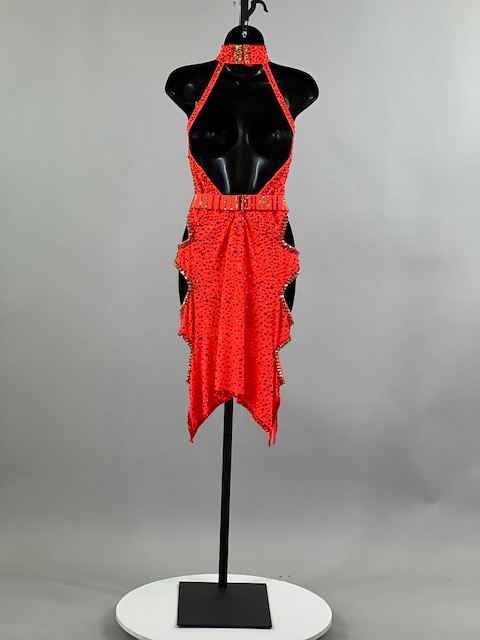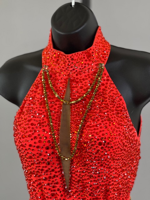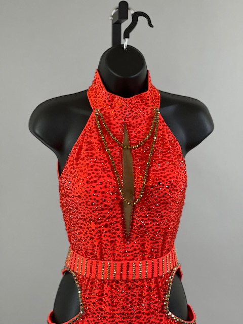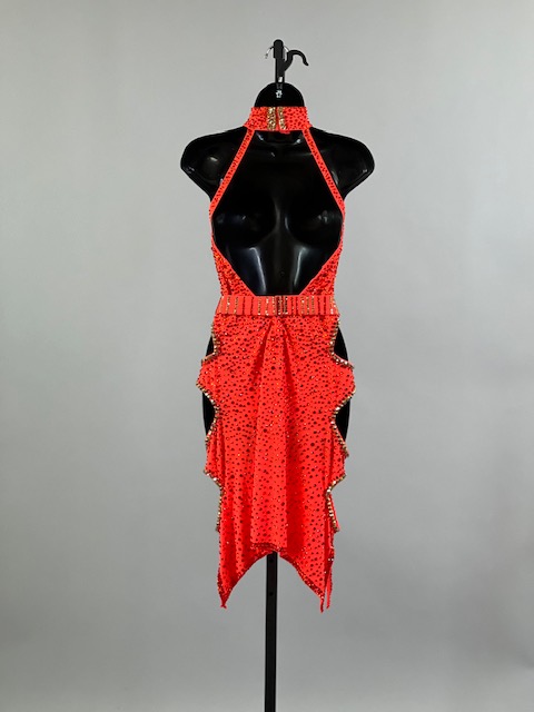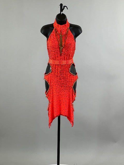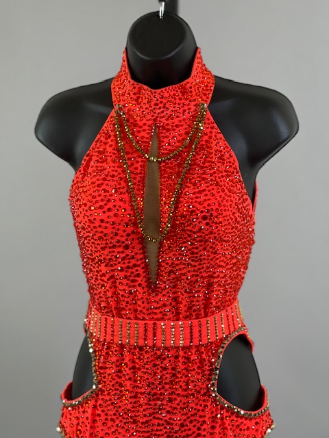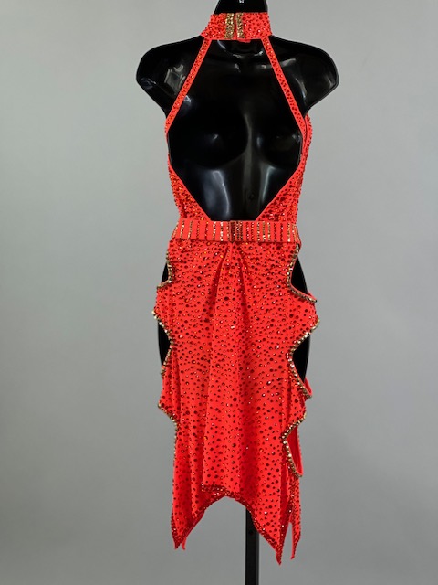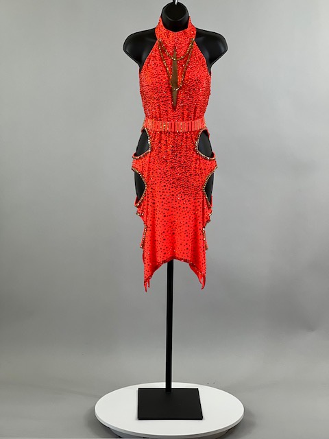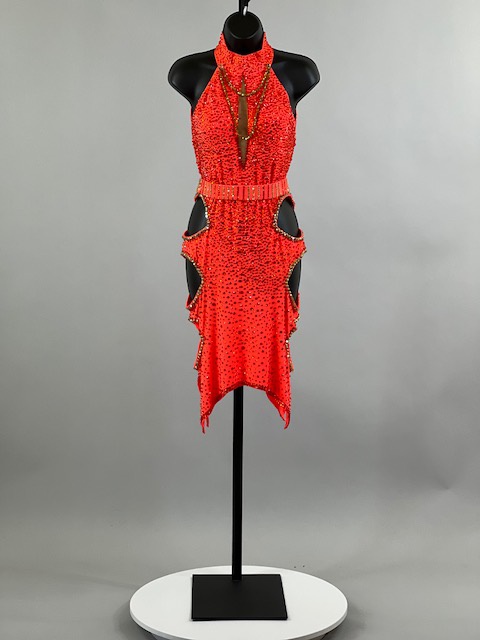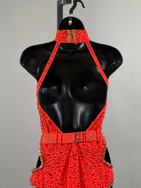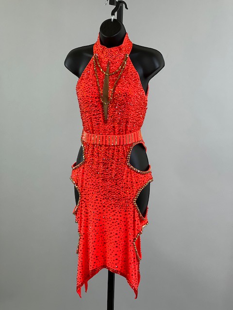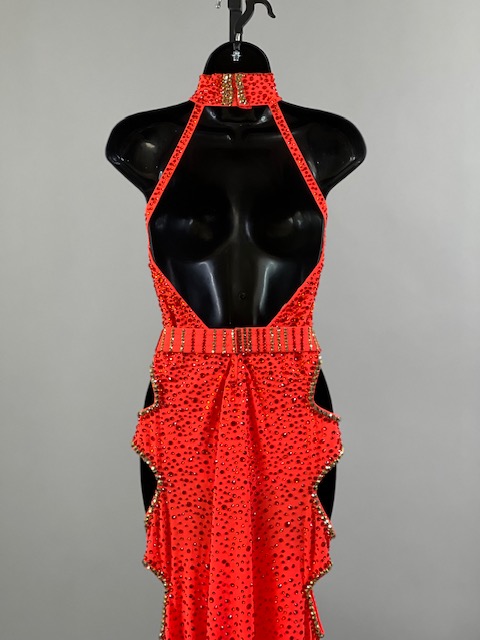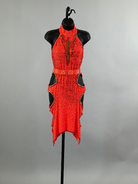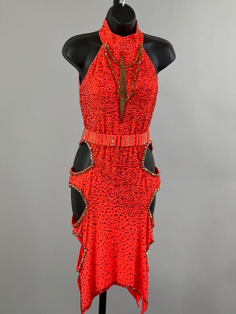 This is a beautiful bright orange Rhythm/Latin dress designed by Artistry in Motion by Julia Gorchakova. Skirt style creates a great leg effect in the dance floor. Trimmed with Austrian Crystals.