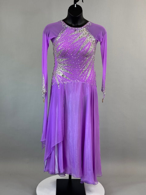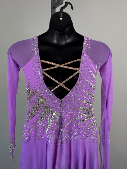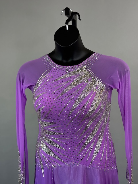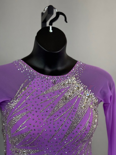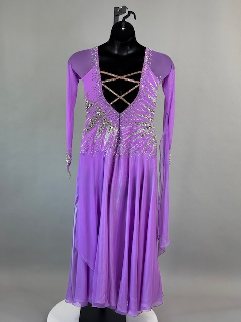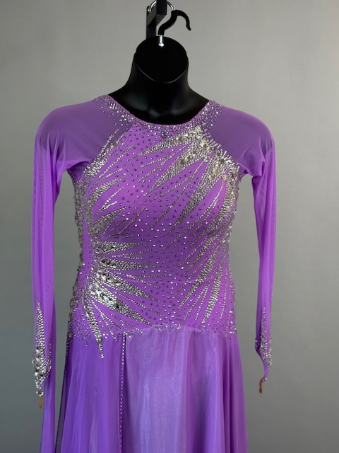 This is a stunning bright lavender smooth dress! It moves amazing on the dance floor, a true beauty! Trimmed with Austrian Crystals.