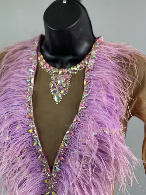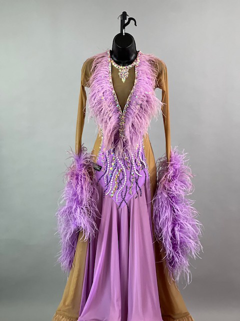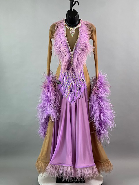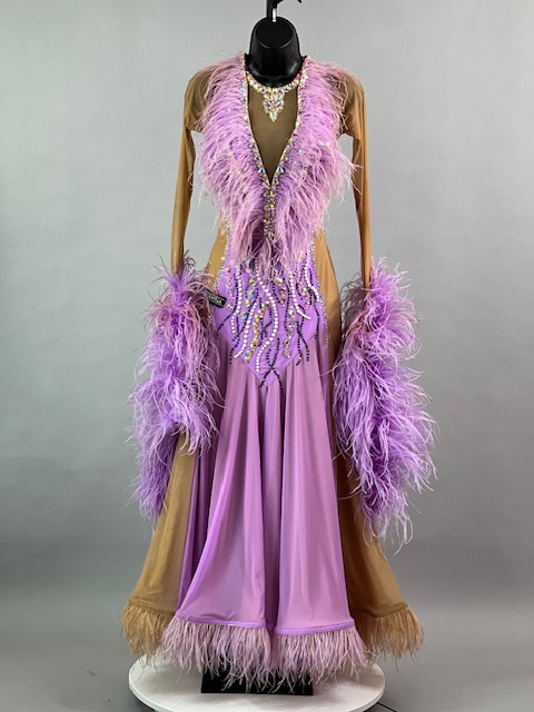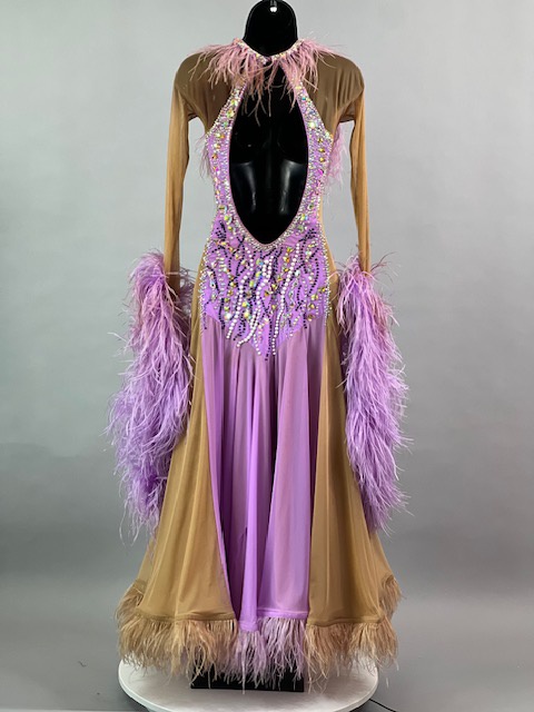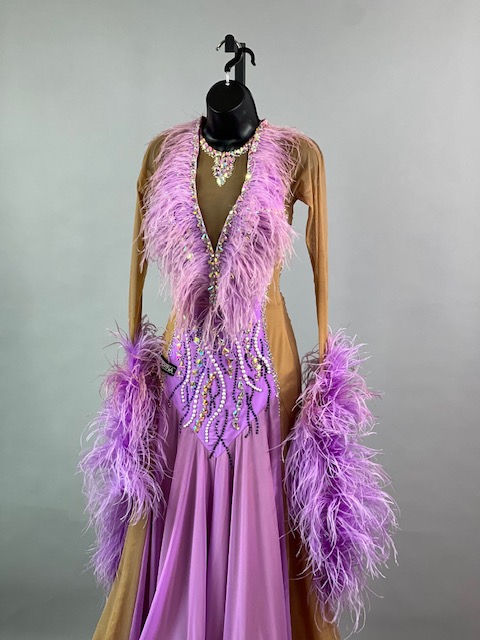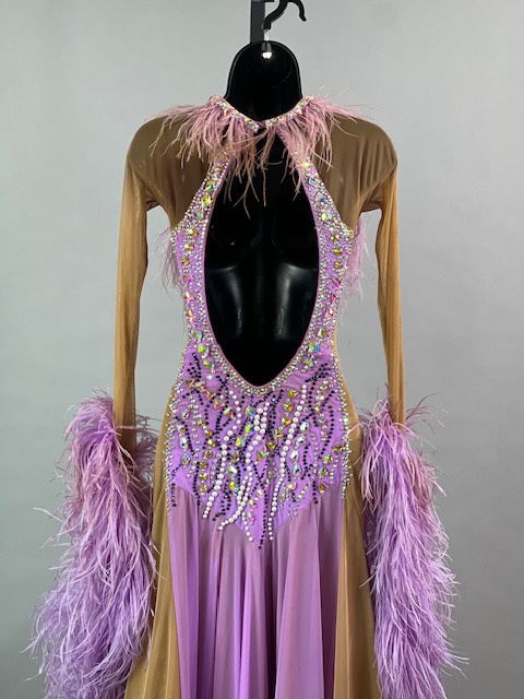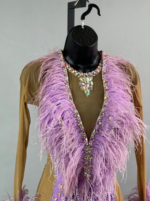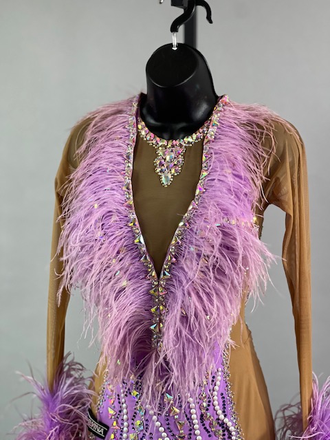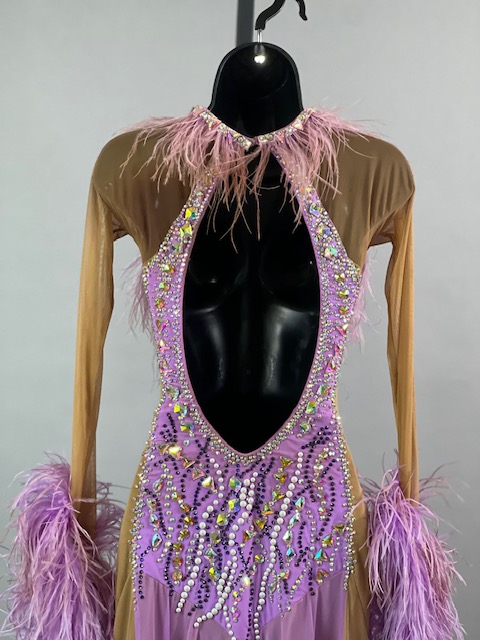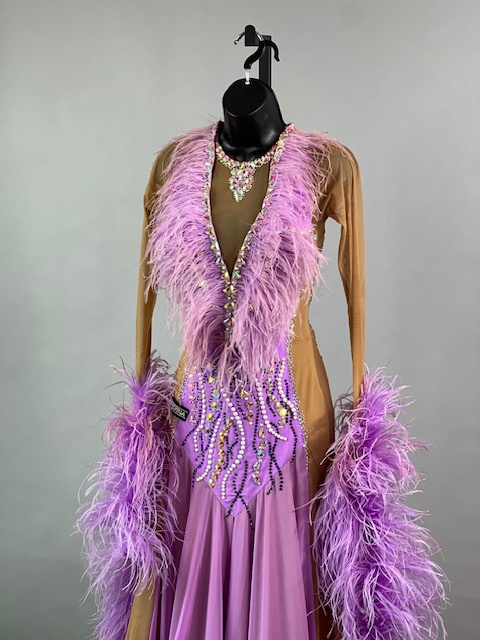This is a beautiful lavender standard/ballroom dress! It moves amazing on the dance floor. Trimmed with Austrian Crystals.