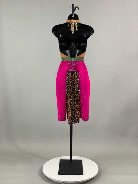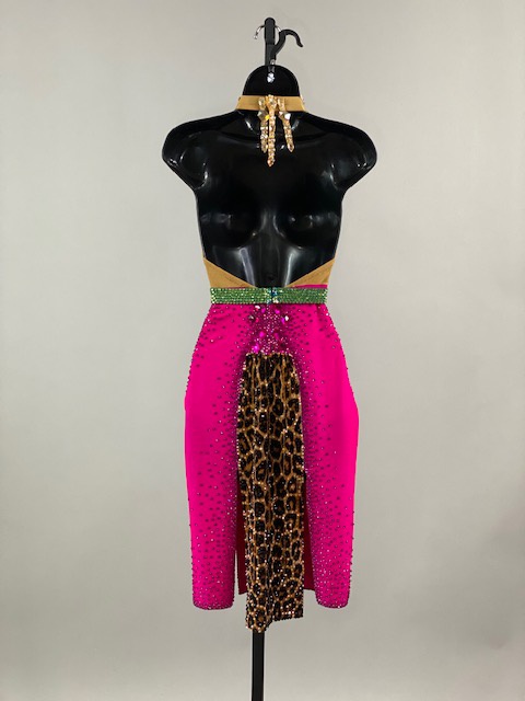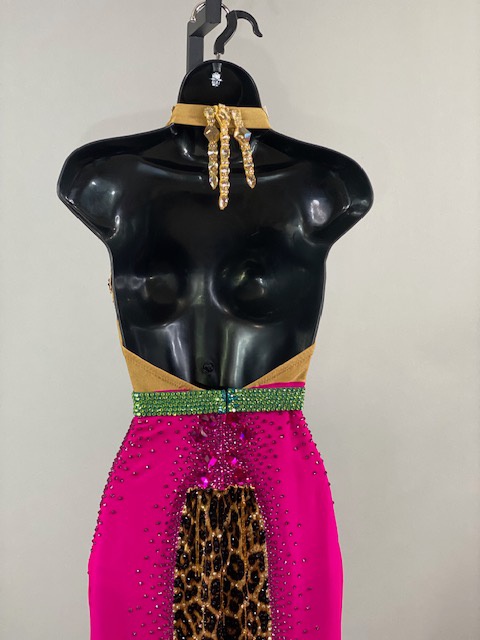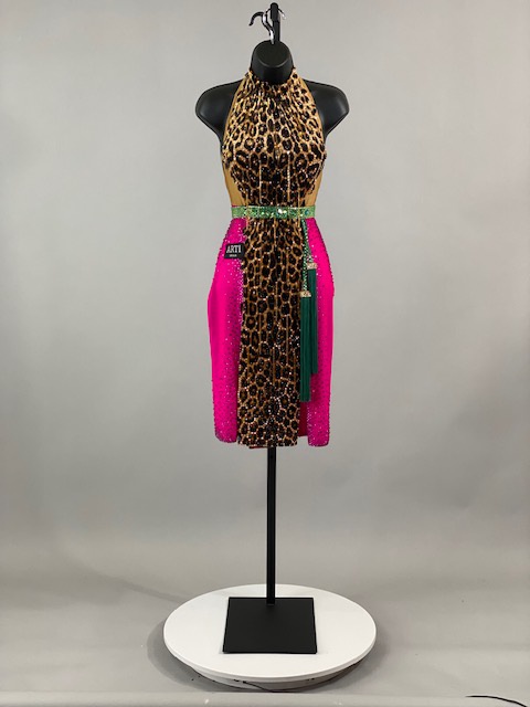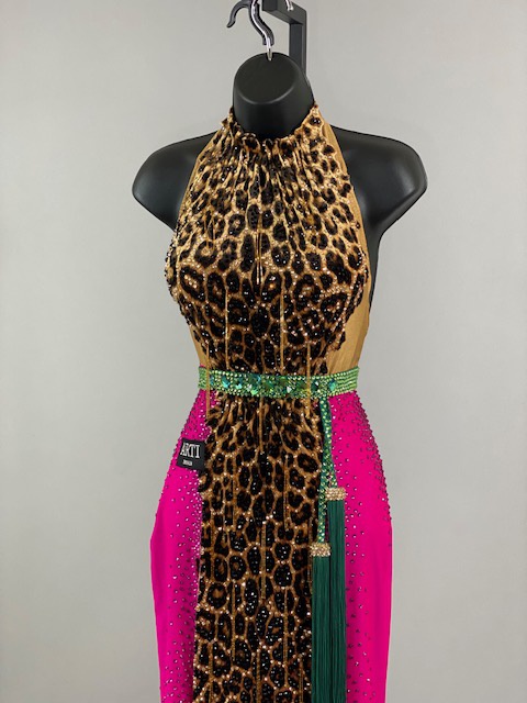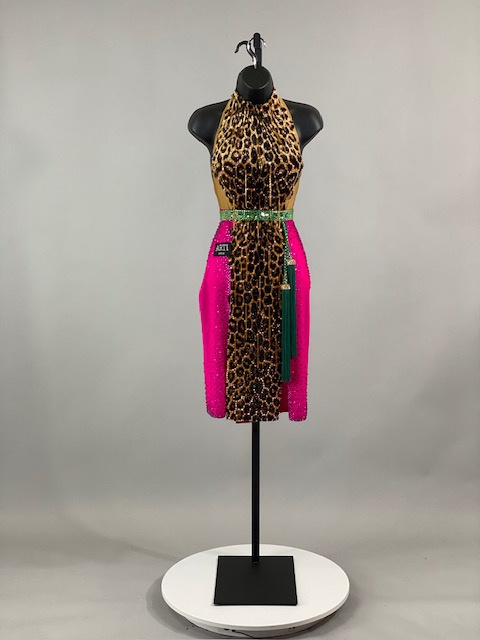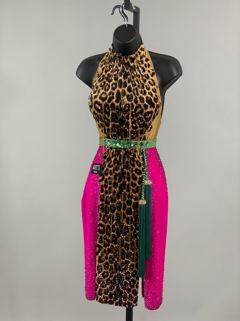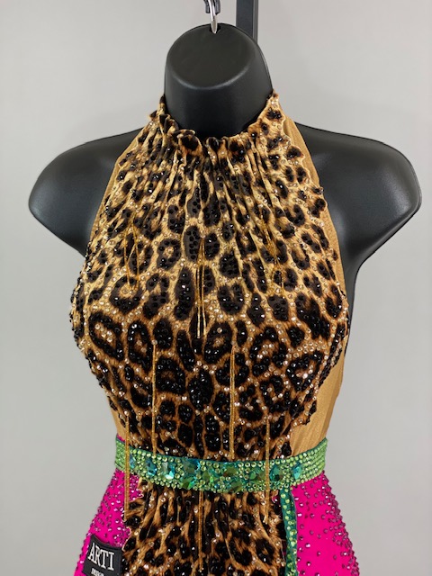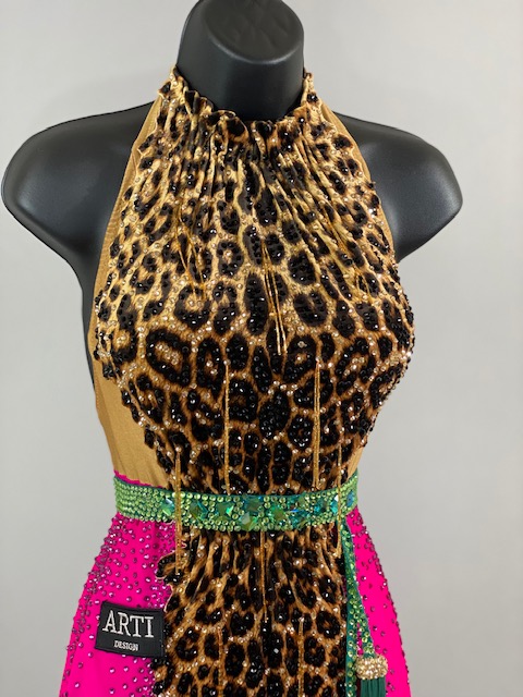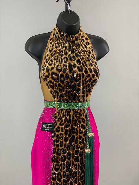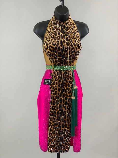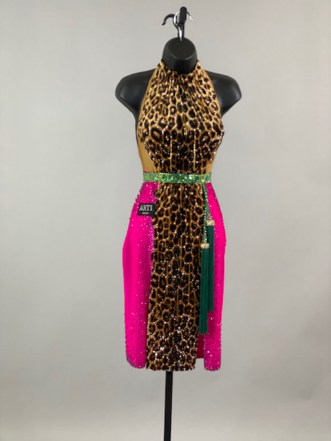 This is a beautiful leopard pink Rhythm/Latin Dress designed by ARTI! It’s an stunning dress, very unique style and it moves amazing on the dance floor! A true beauty! Trimmed with Austrian Crystals.
