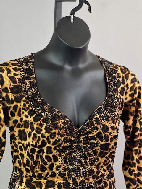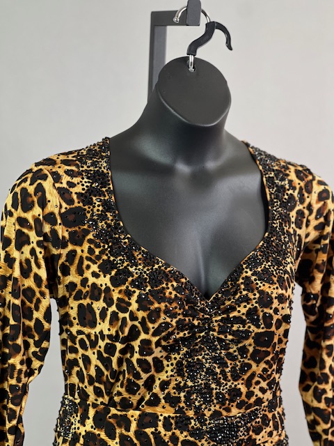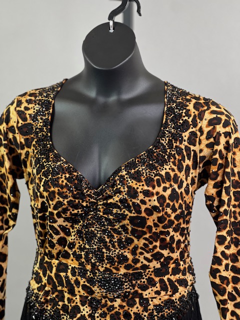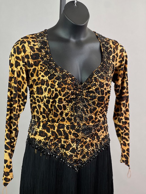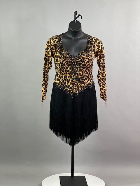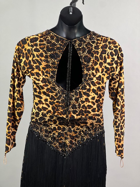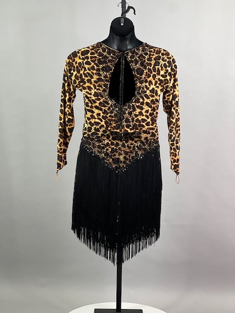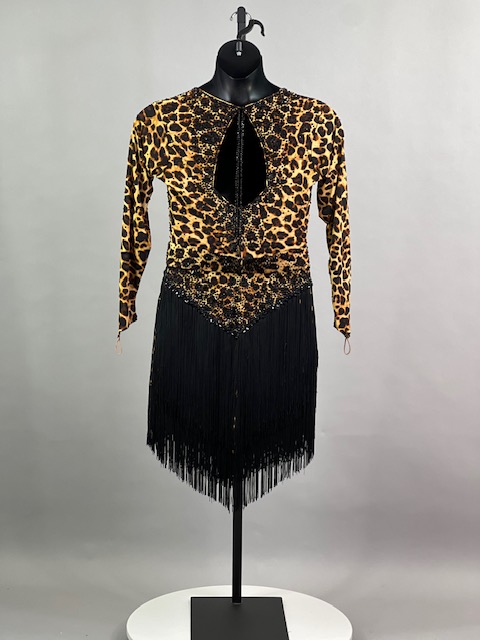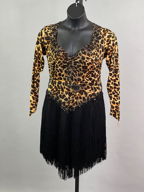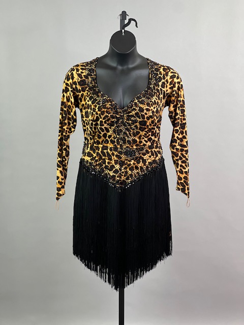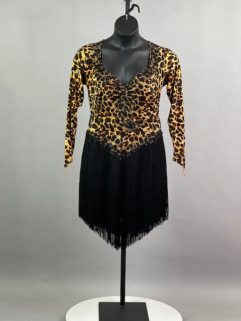 This is a beautiful black leopard Rhythm/Latin Dress! Fringes moves amazing on the dance floor. Trimmed with Austrian Crystals.