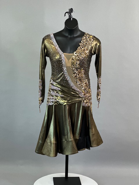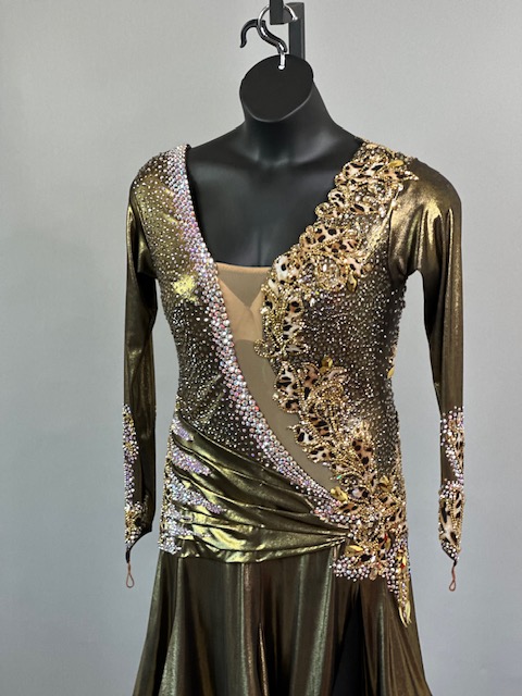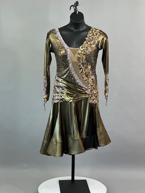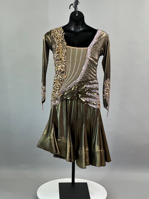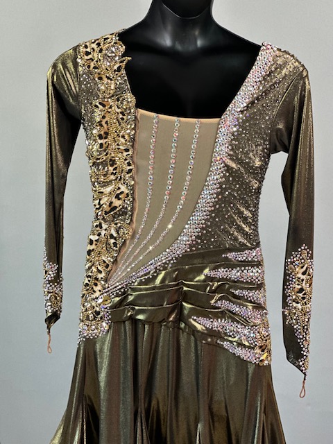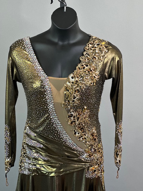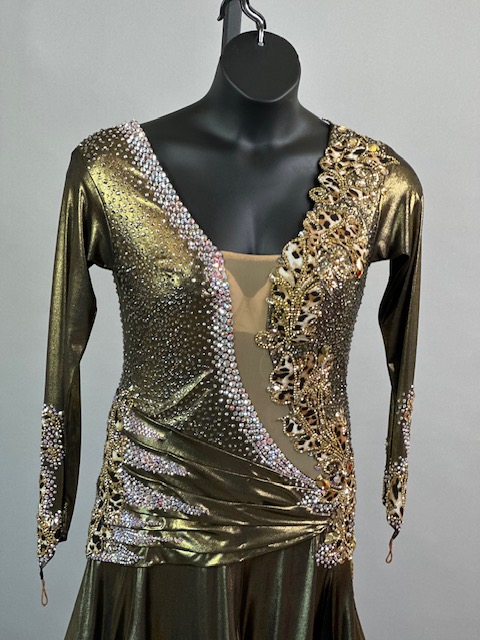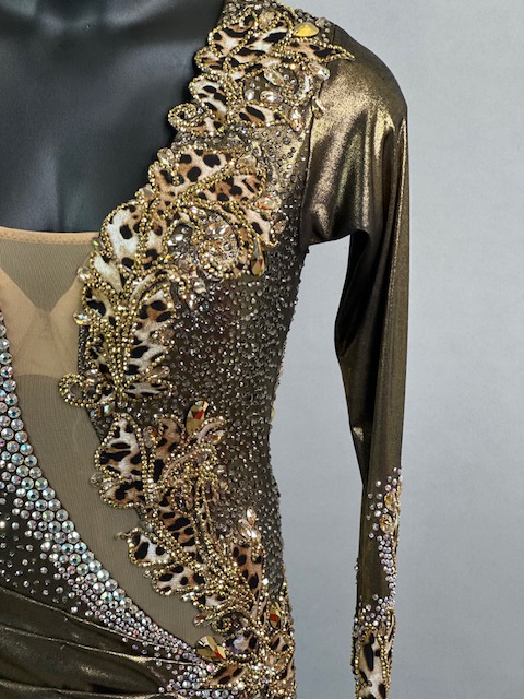 This is a stunning leopard gold shimmer Rhythm/Latin dress designed by Artistry in Motion by Julia Gorchakova! Skirt moves amazing on the dance floor, a true beauty! It’s Trimmed with Austrian crystals.