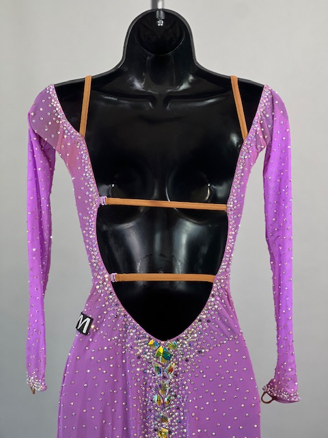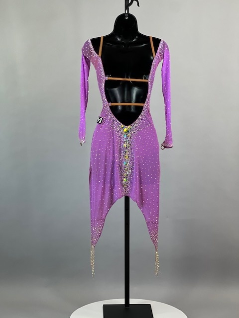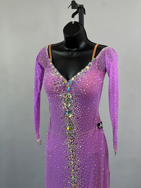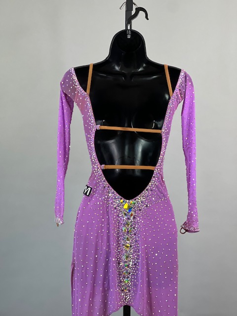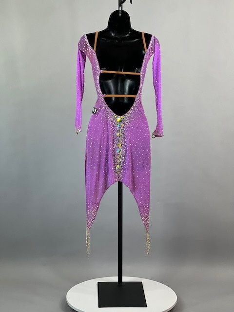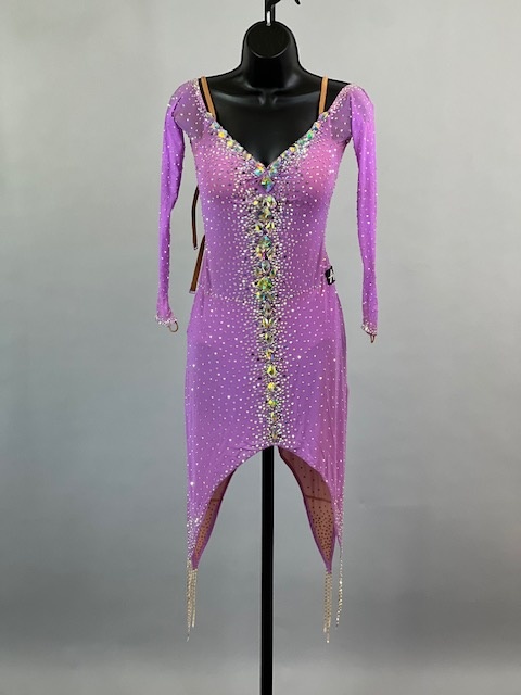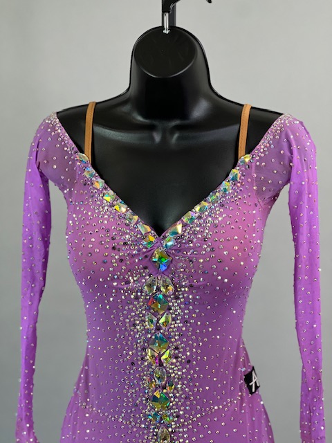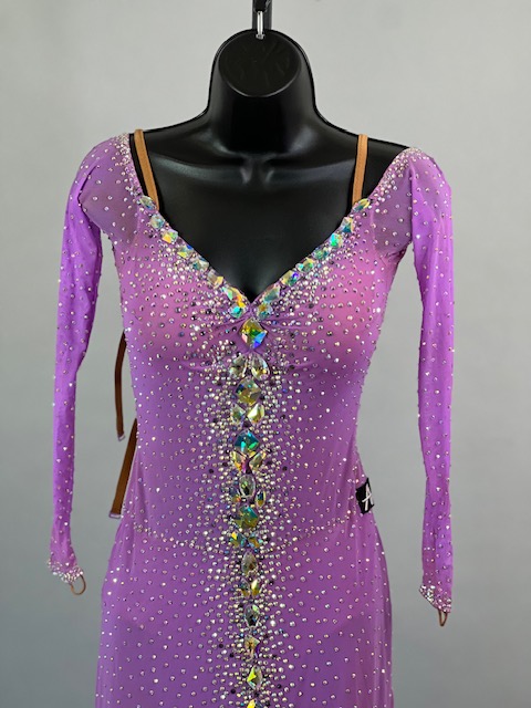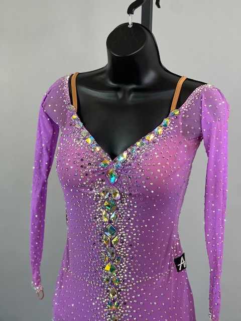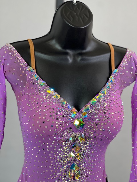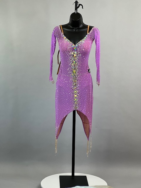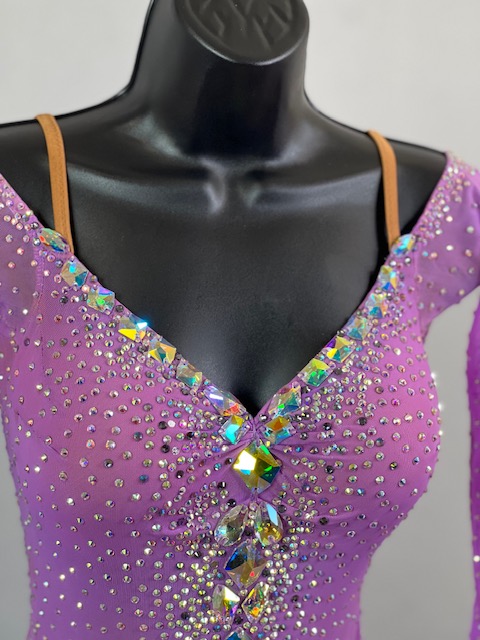 This is a beautiful lavender/ lilac Rhythm/Latin dress! Skirt moves amazing on the dance floor, a true beauty! It’s Trimmed with Austrian crystals.