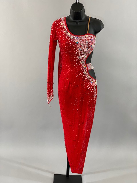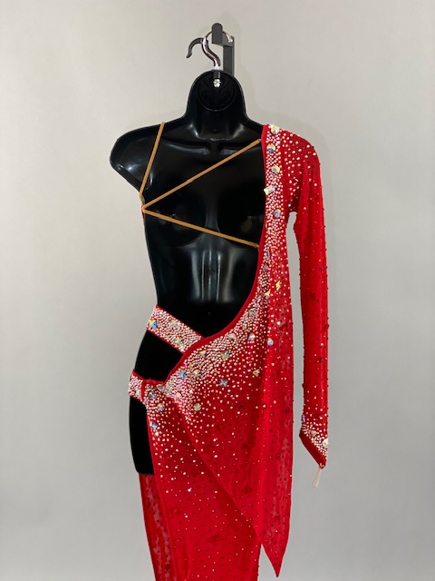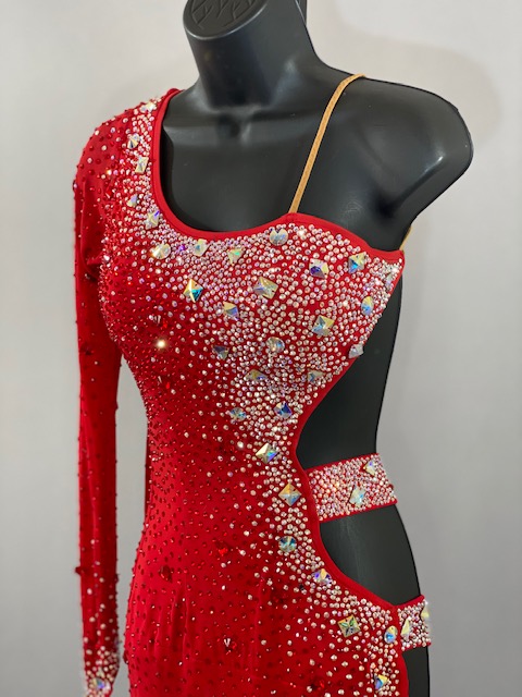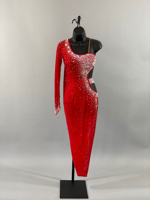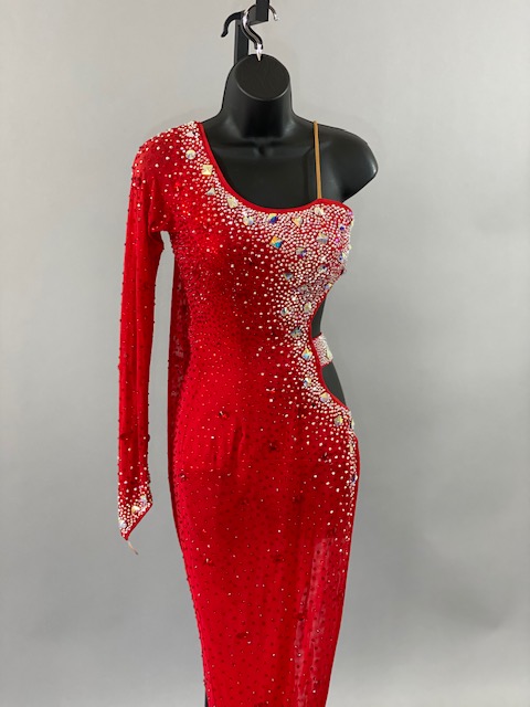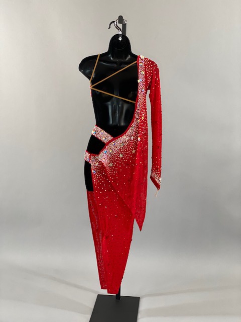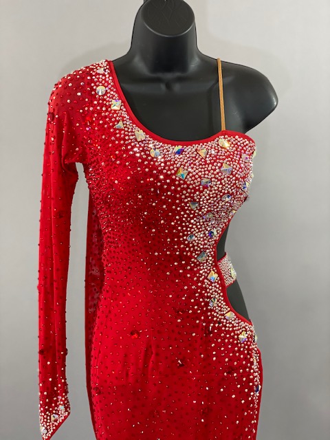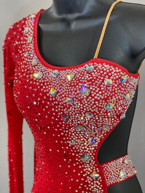 This beautiful red Rhythm/Latin dress is a very unique. Style creates amazing lines in the dance floor. Trimmed with Austrian Crystals. Designed by DORE Designs.