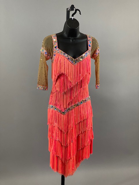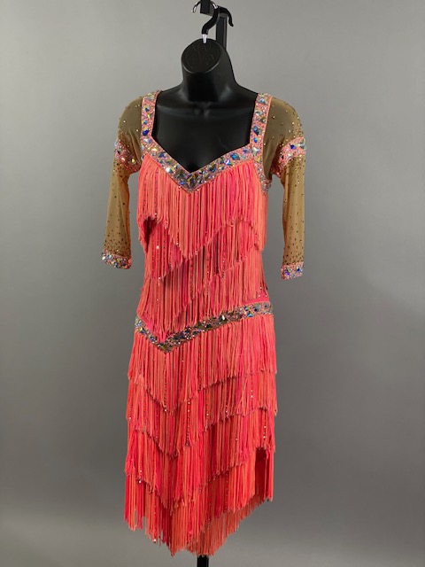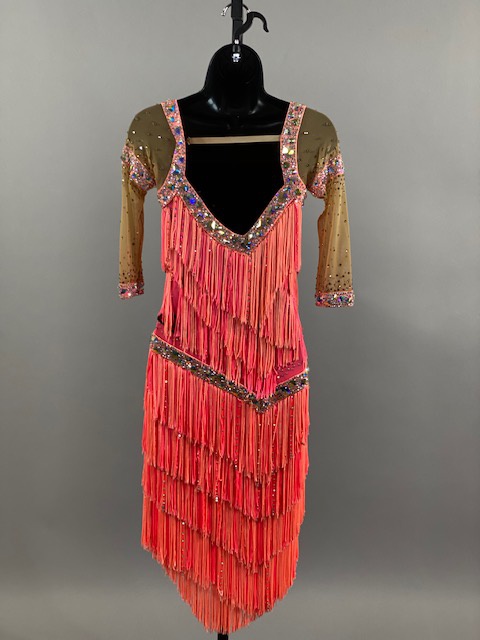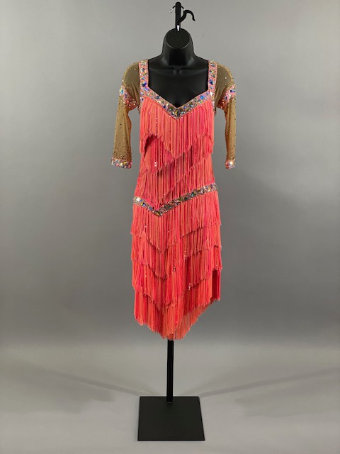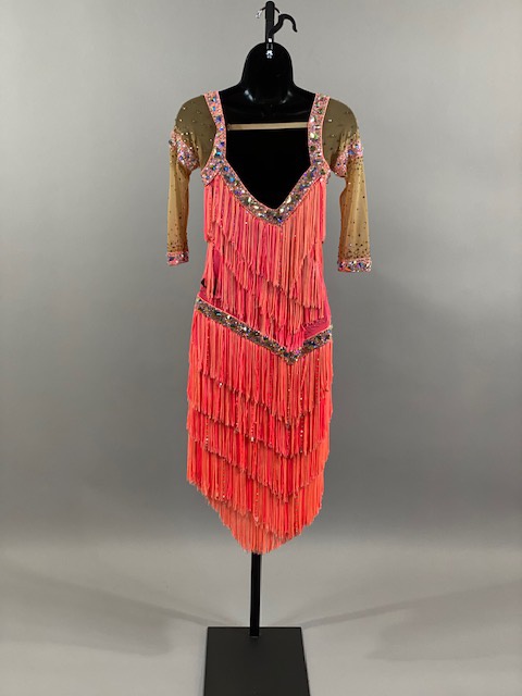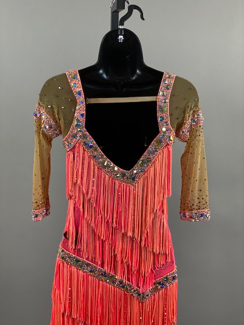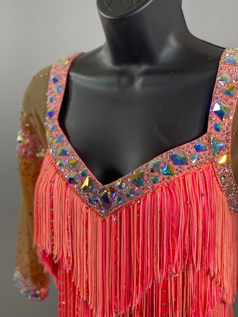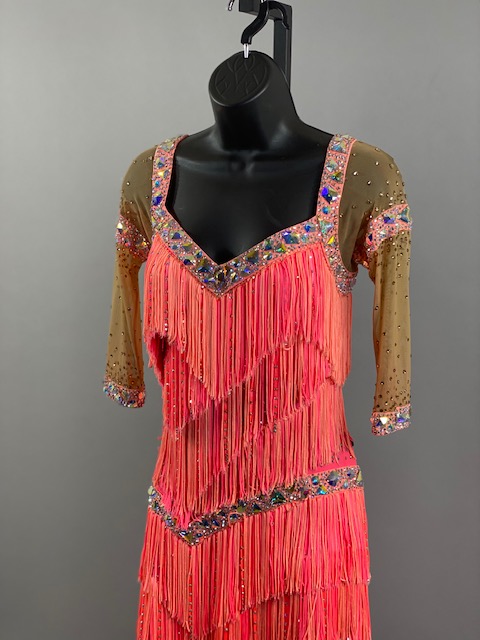 This salmon pink rhythm/latin dress is amazing! Fringes create beautiful movement on the dance floor. Great for your next competition or showcase. Designed by Tatiana, Anabell’s Dancewear.