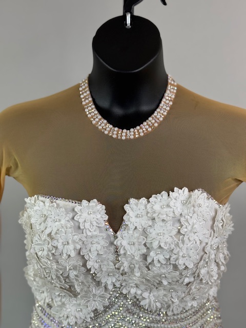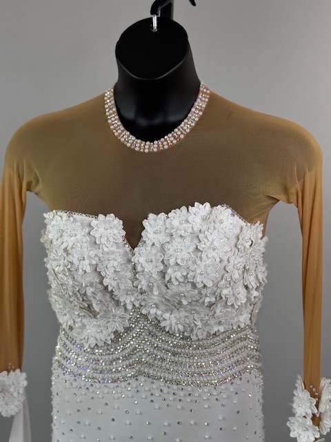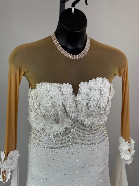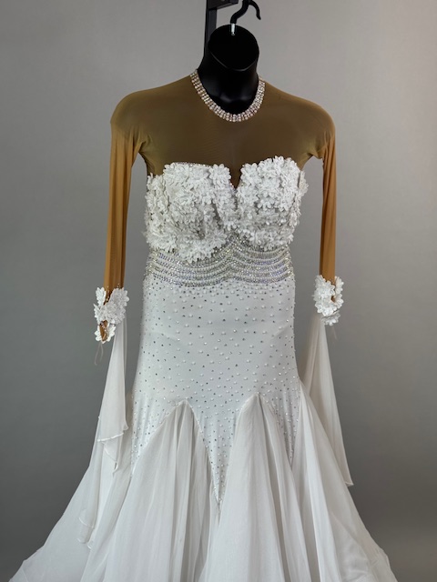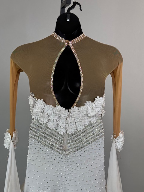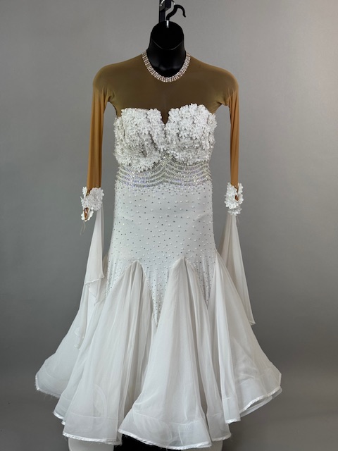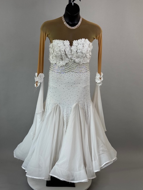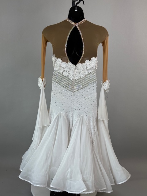 This is a beautiful white standard dress! It moves amazing on the dance floor. Trimmed with Korean Crystals.