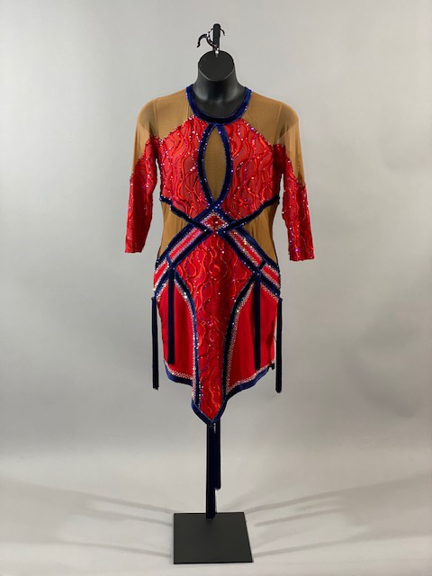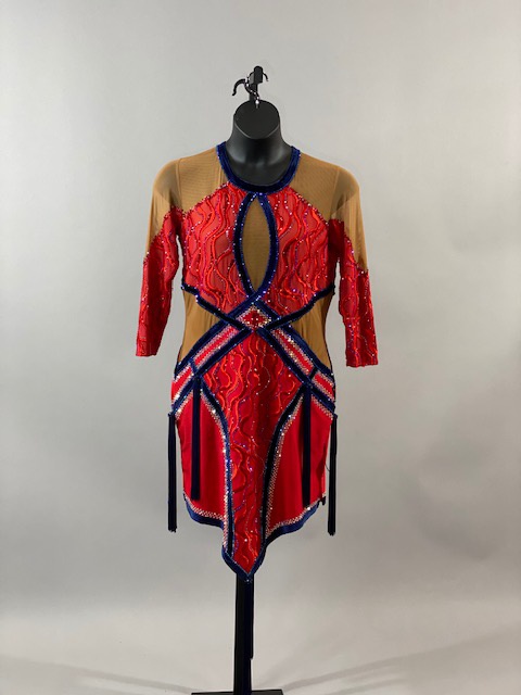 This is a stunning red Rhythm/Latin Dress, very unique. It moves amazing on the dance floor, will definitely stand out. Trimmed with beautiful Austrian crystals.