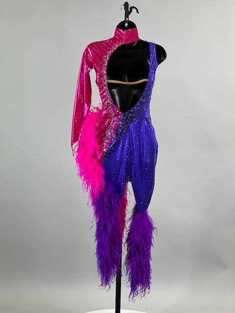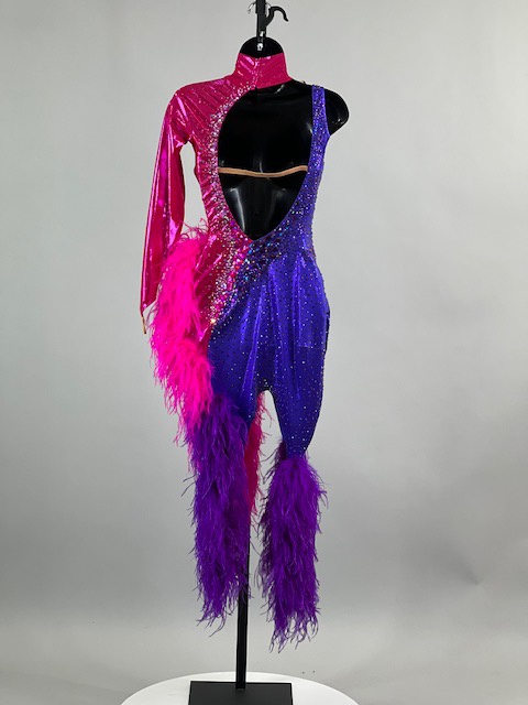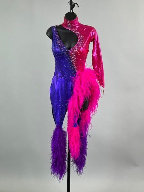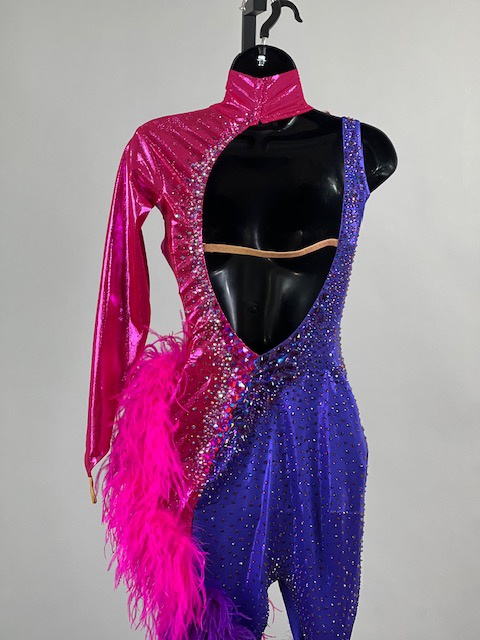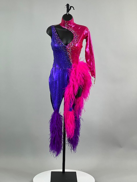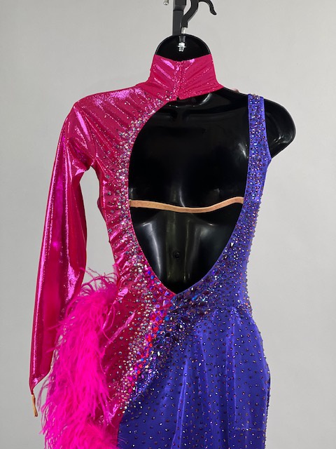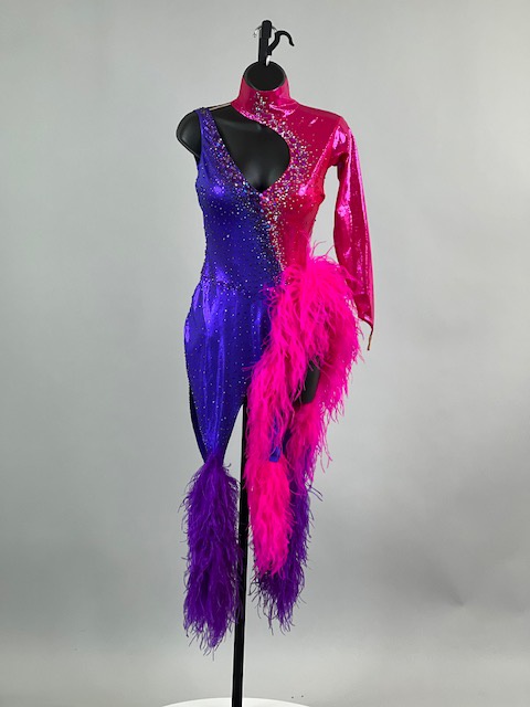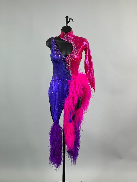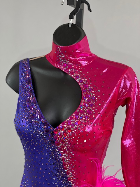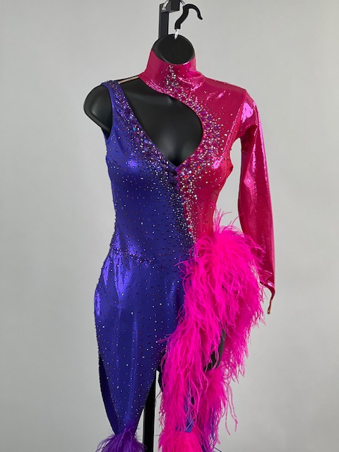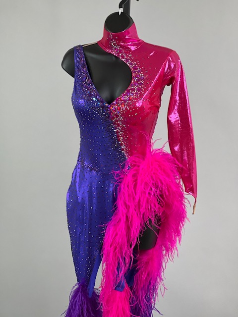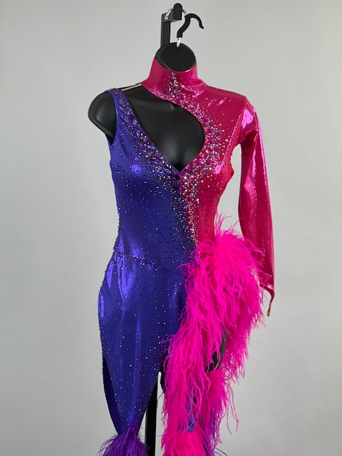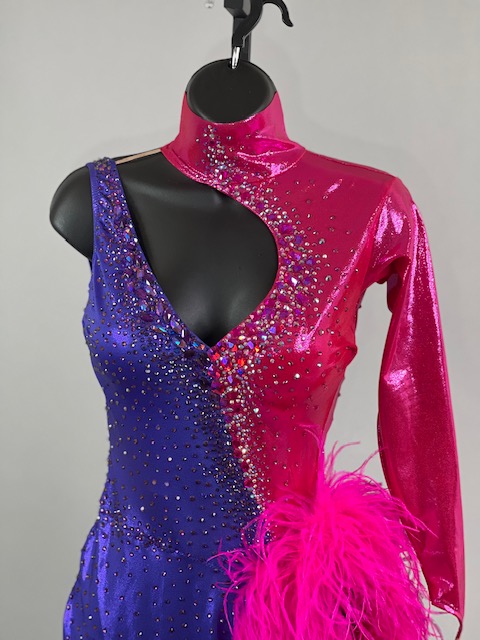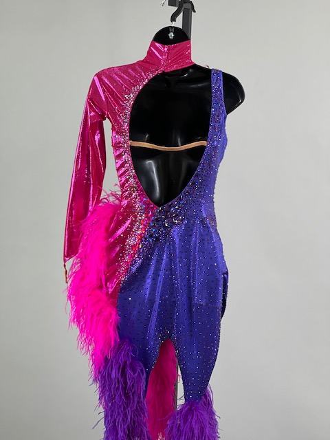 This is a beautiful bright purple and pink Rhythm/Latin dress with feathers! It’s a stunning dress, color stands out on the dance floor. Great for showcase or competition. Trimmed with Austrian Crystals.